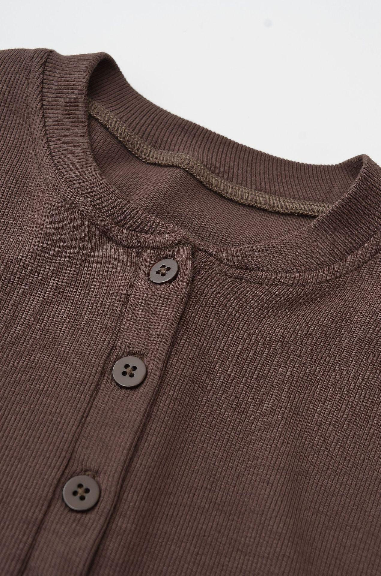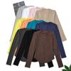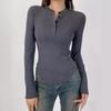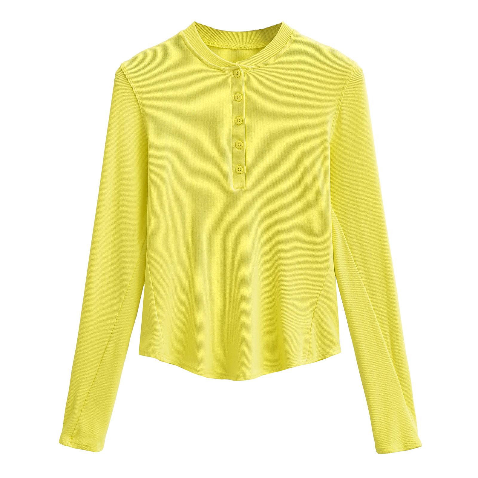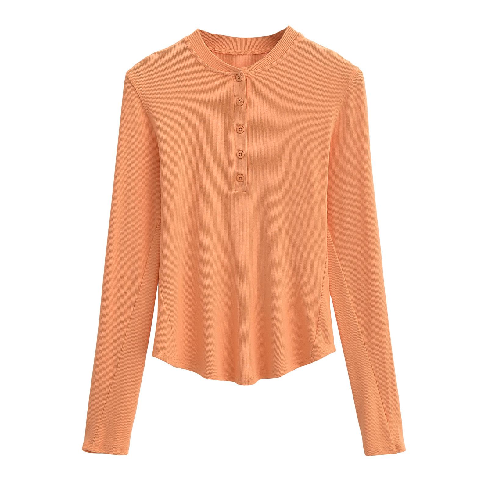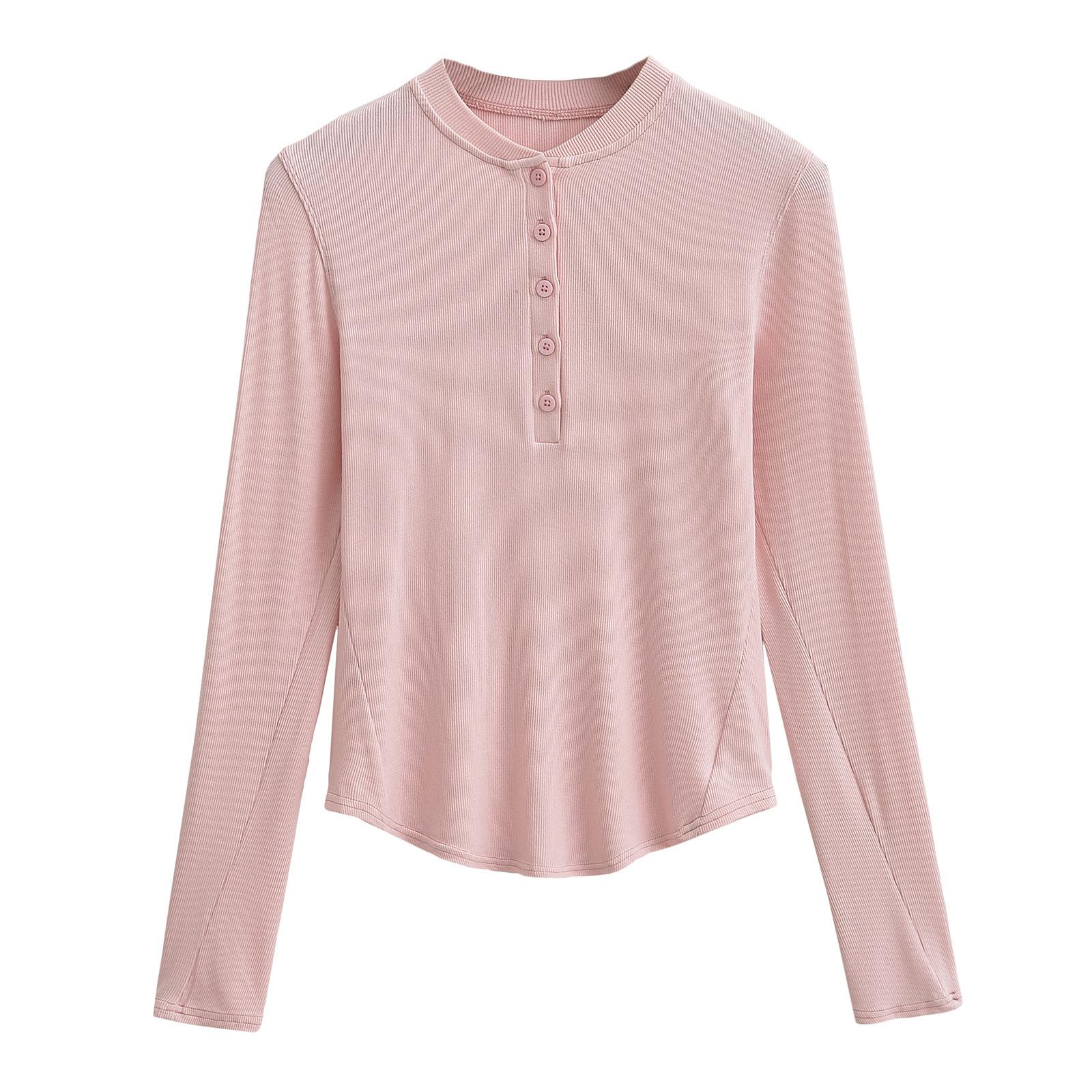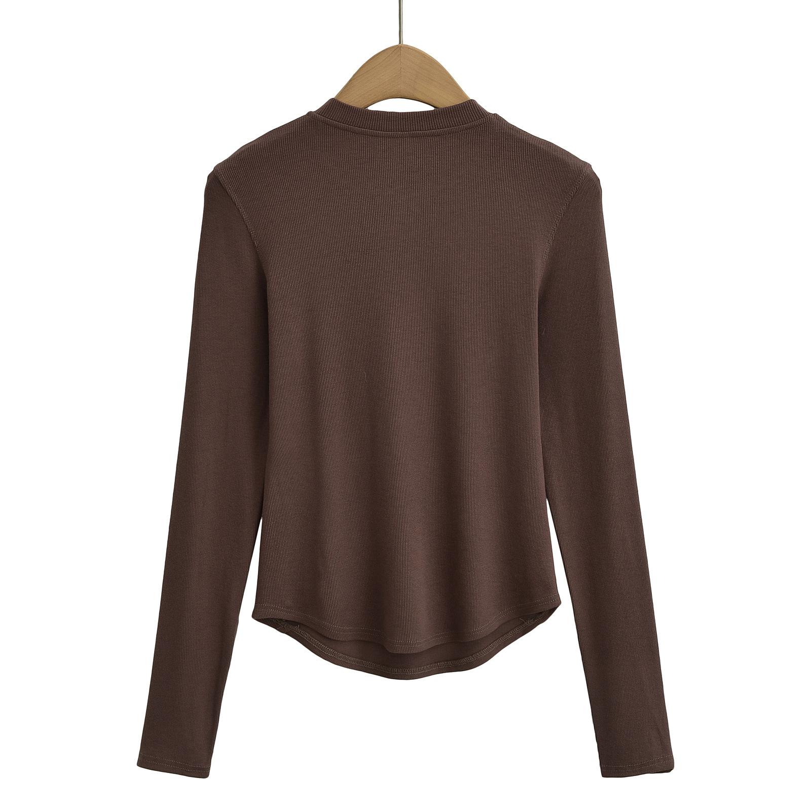 Playera de Manga Larga con Botones y Cuello Redondo de Color Sólido para Mujer Primavera y Otoño Nueva Ajuste Slim Asimétrica Camiseta Básica con Top Corto Interior
