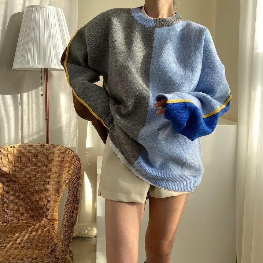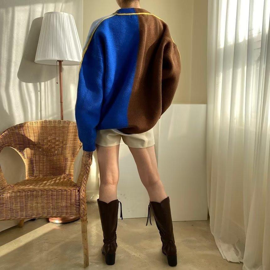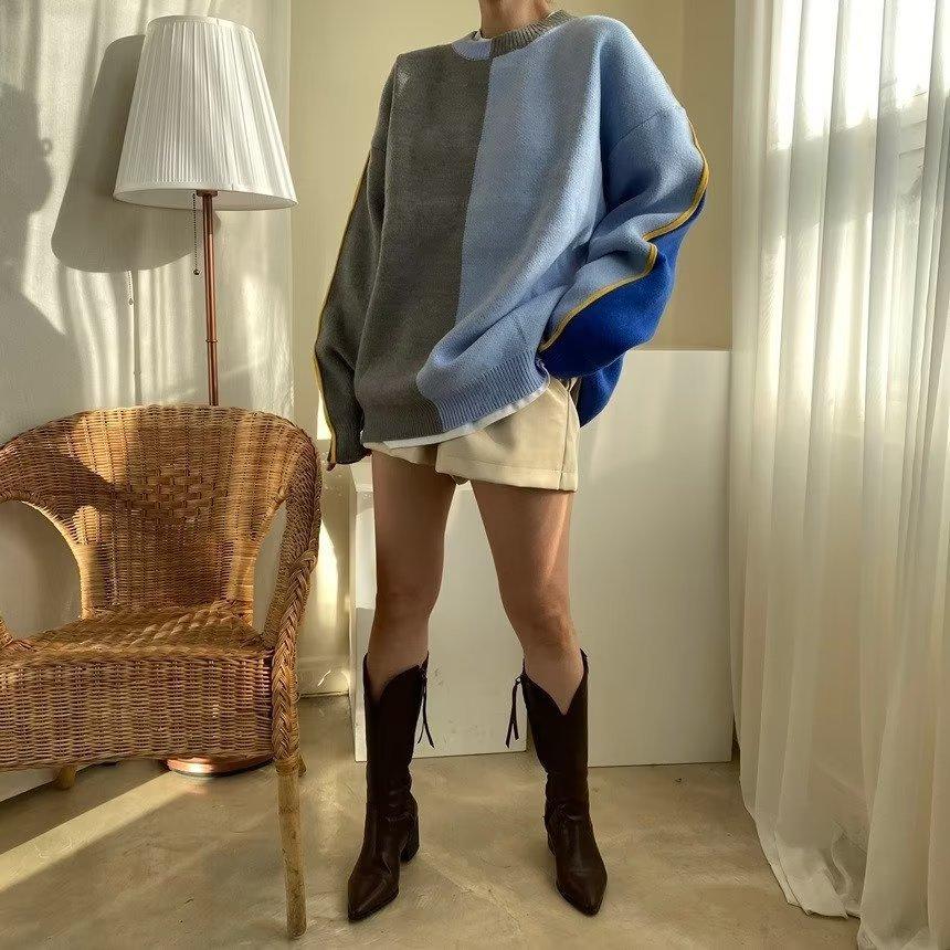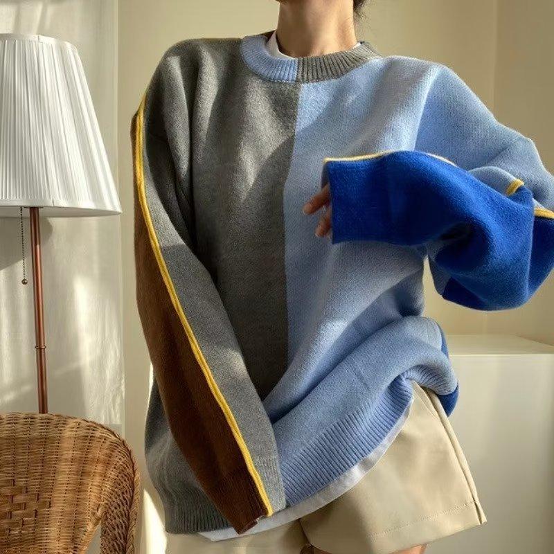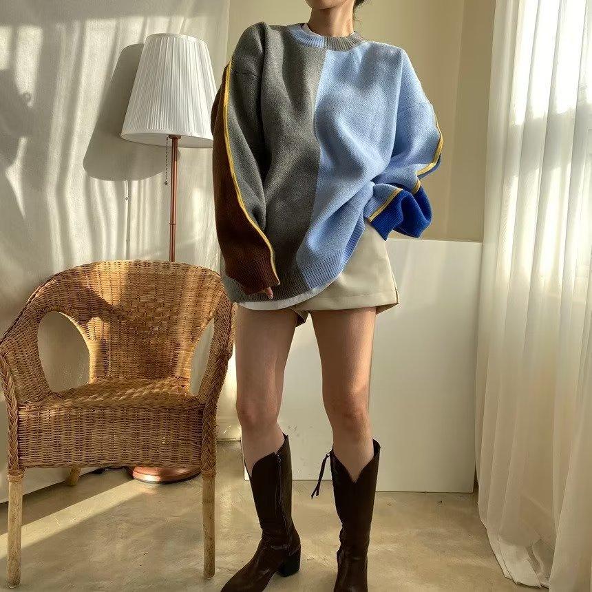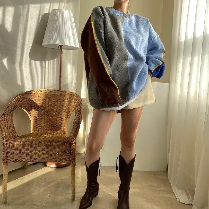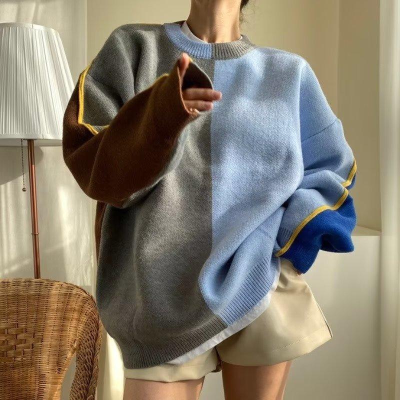 Suéter de otoño e invierno para mujer, nueva ropa de otoño 2023, con costuras de colores contrastantes, estilo holgado y perezoso, diseño de punto, nicho de sentido, abrigo