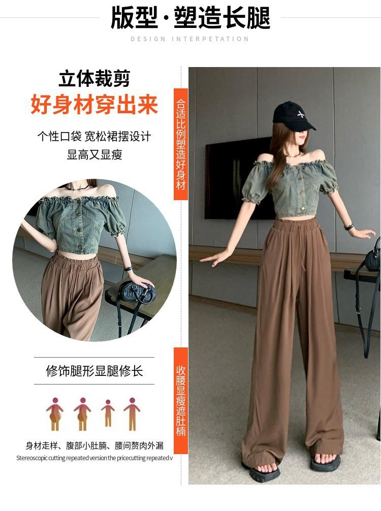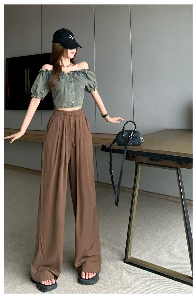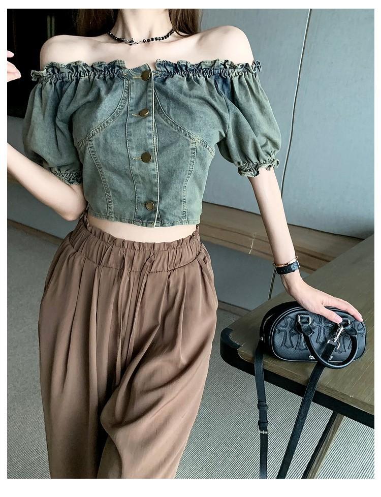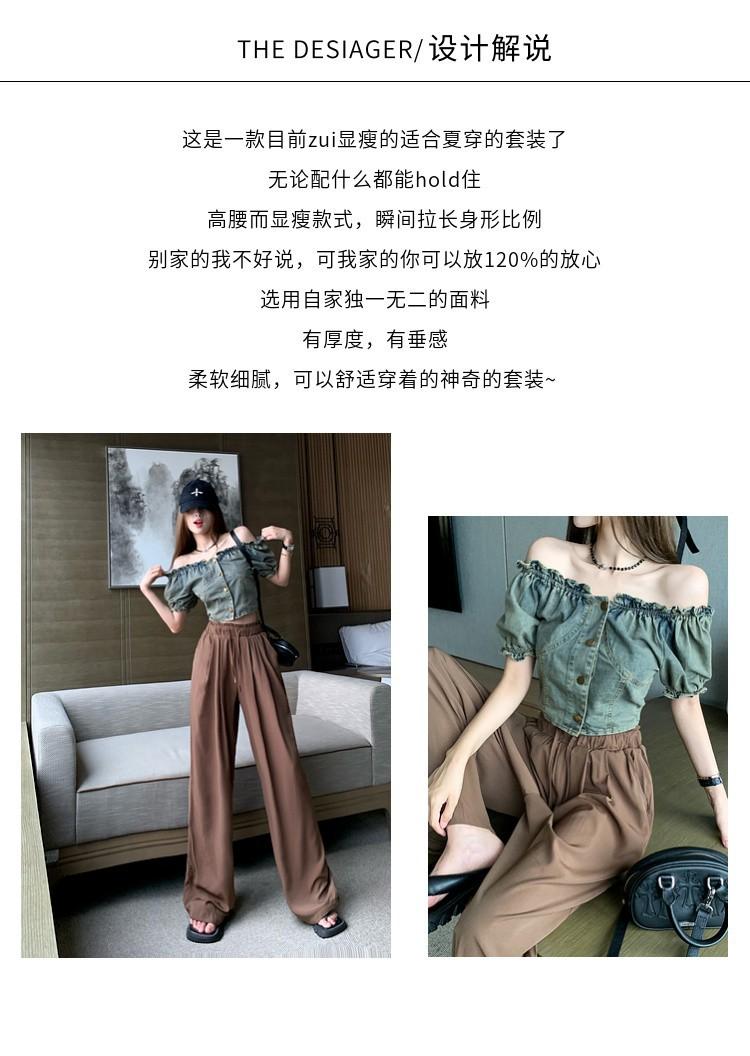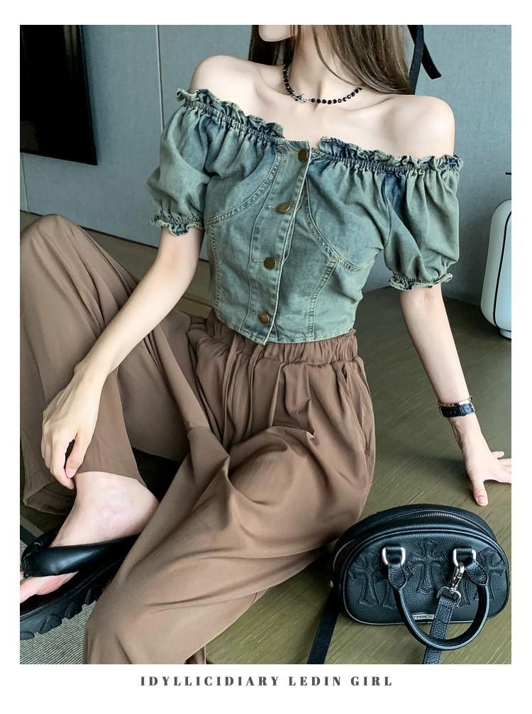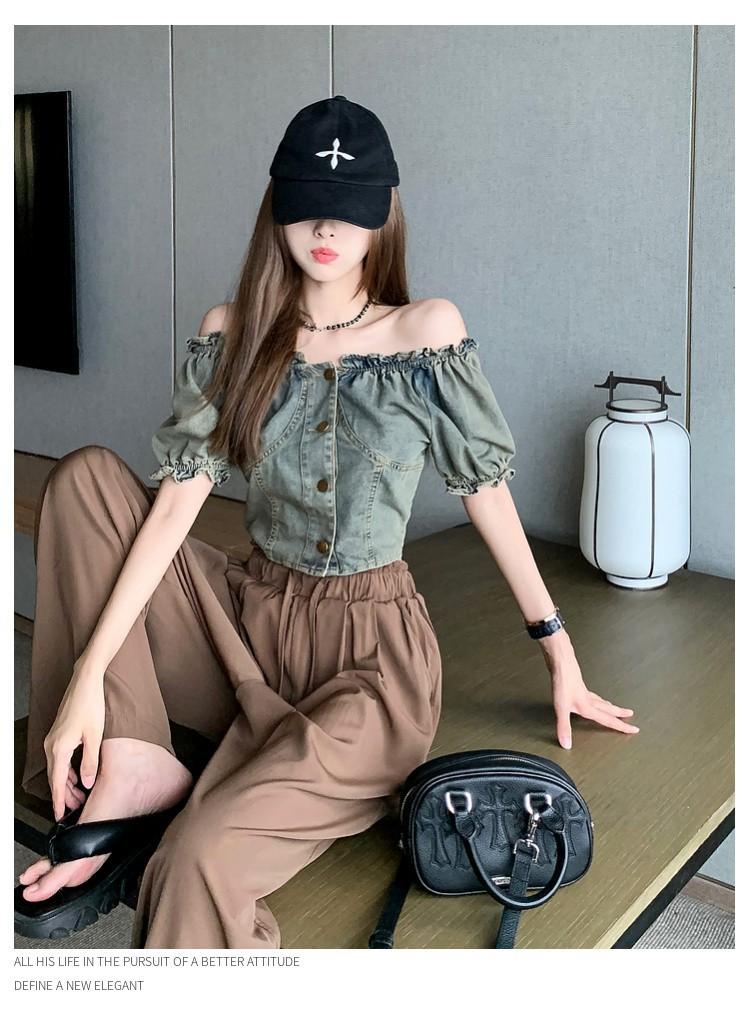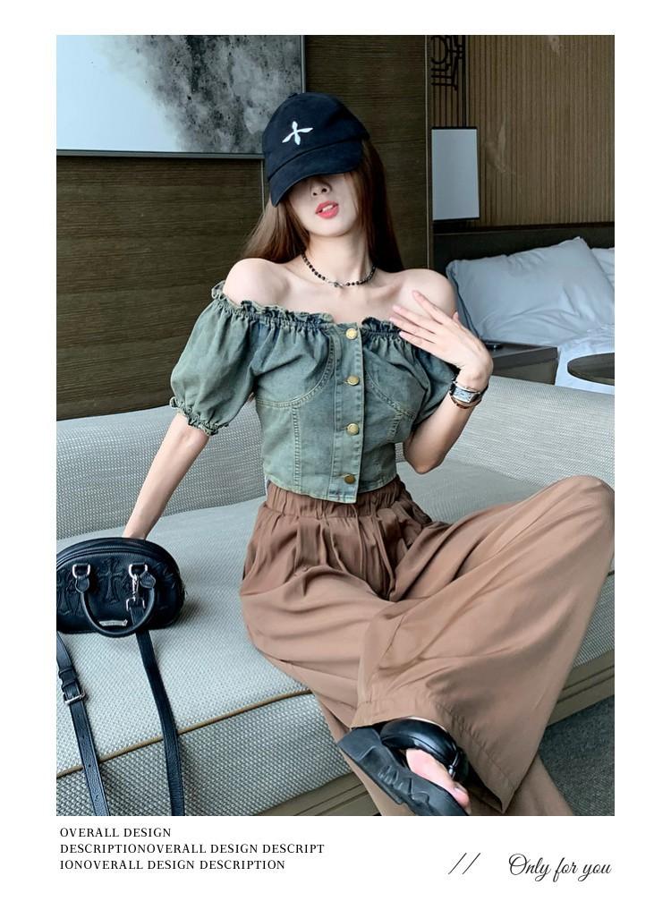 Retro Denim Shoulder Top, Curry Casual Pants, Vintage Shoulder Suit
