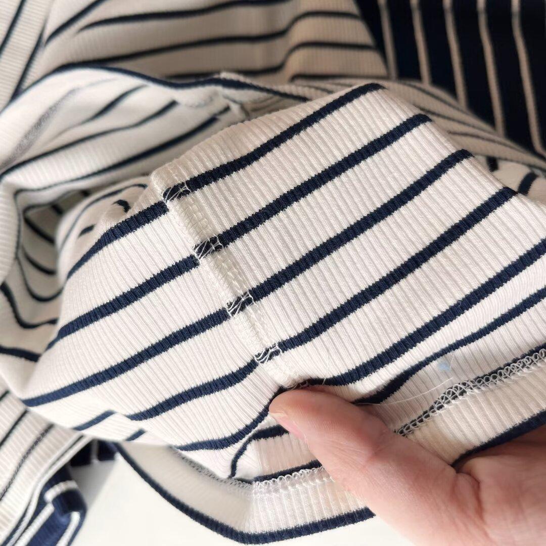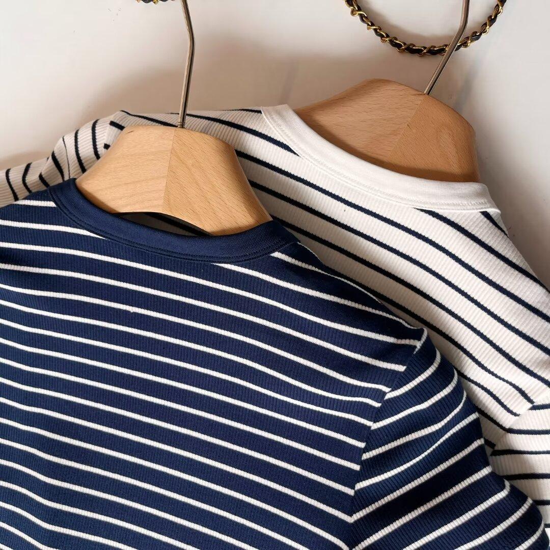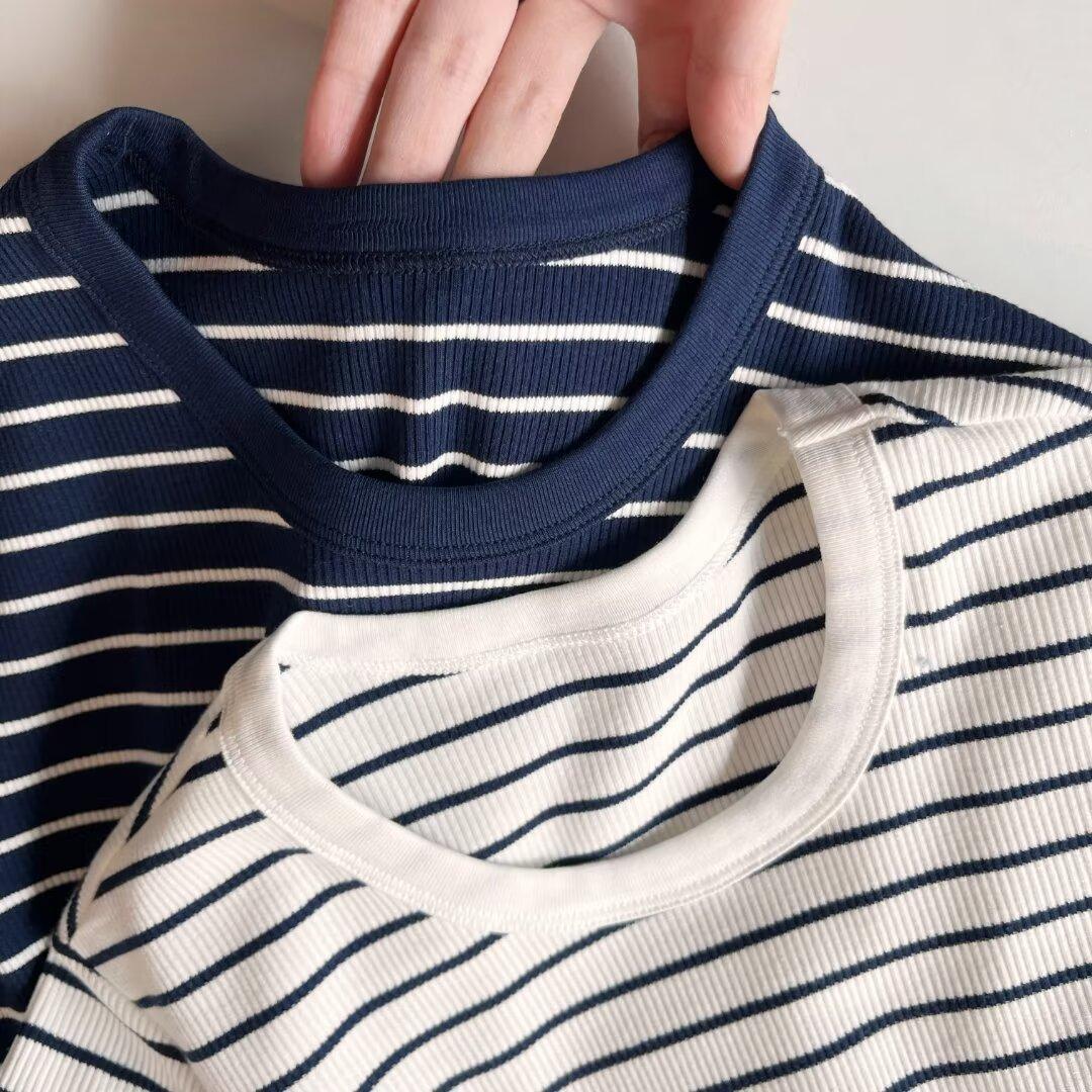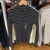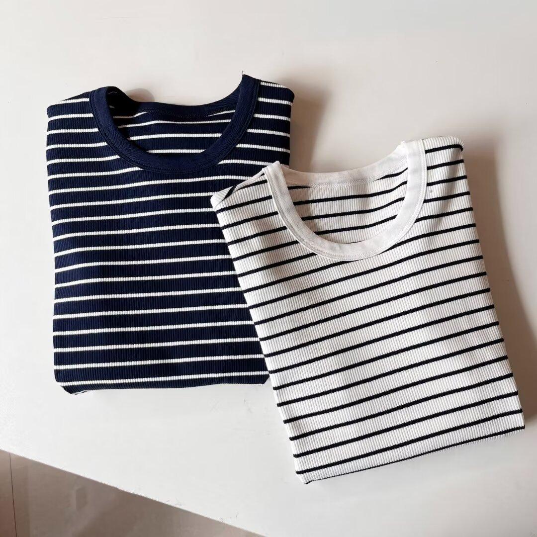 Camiseta japonesa de manga larga con cuello redondo de canalé suave, nueva de primavera 2024, base a rayas 467363