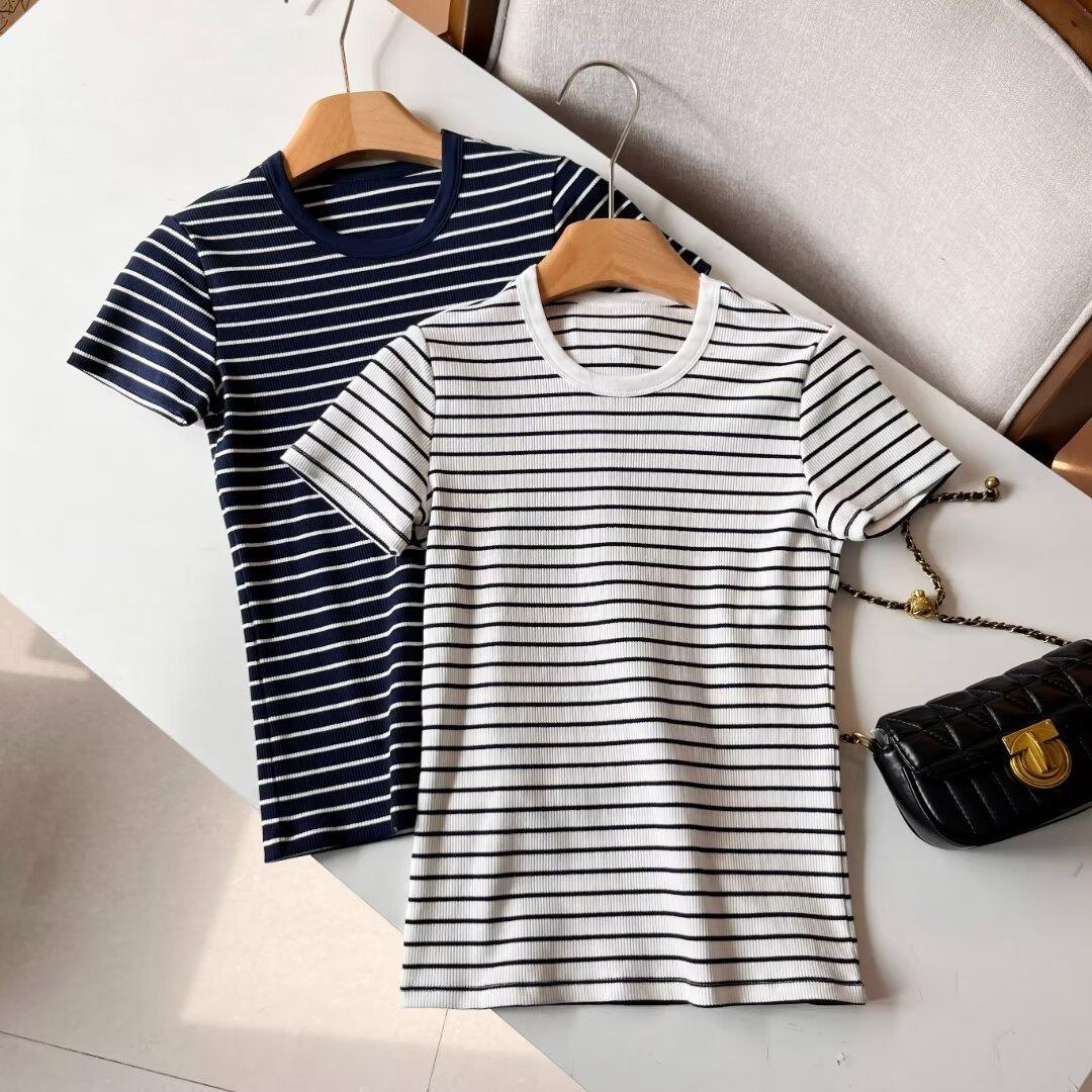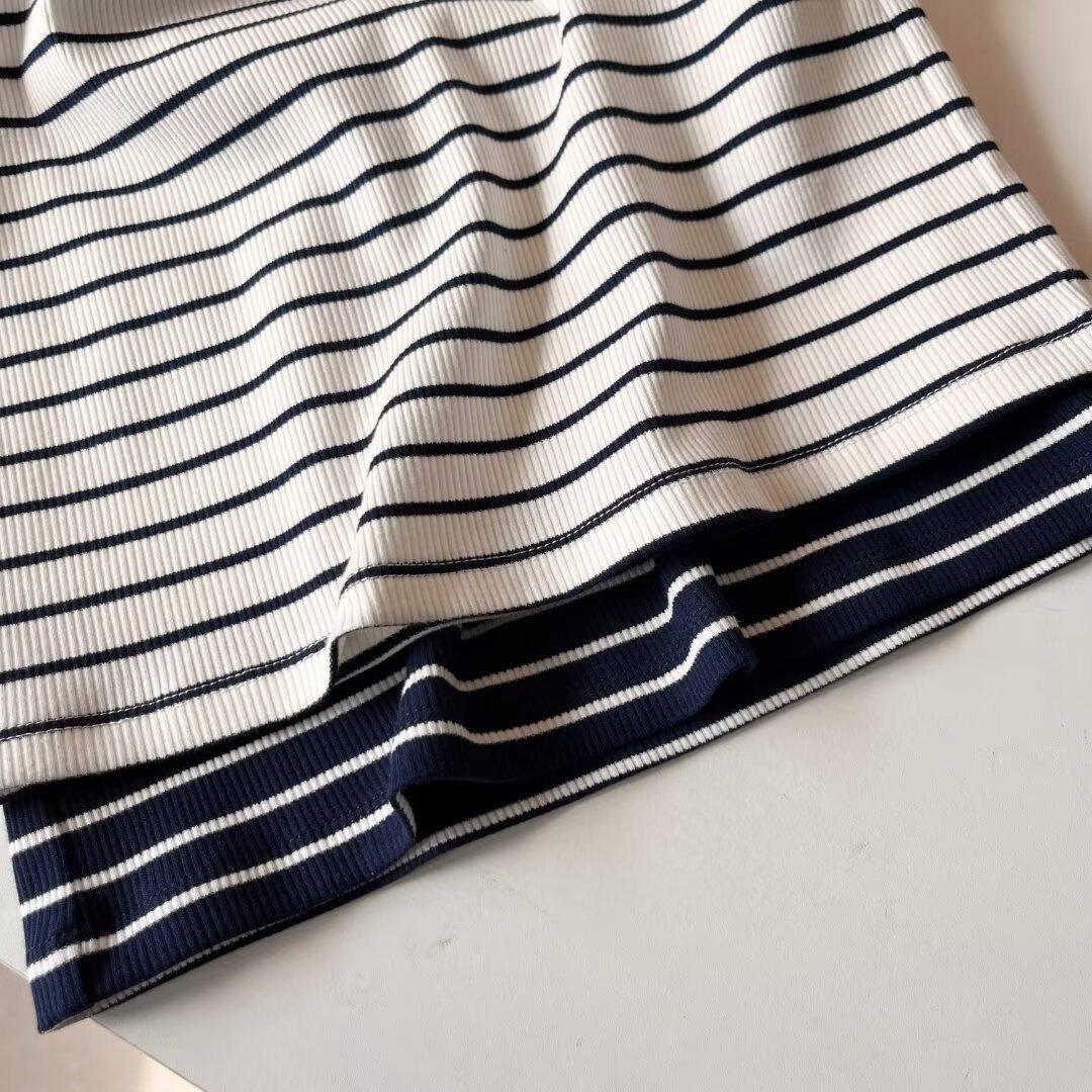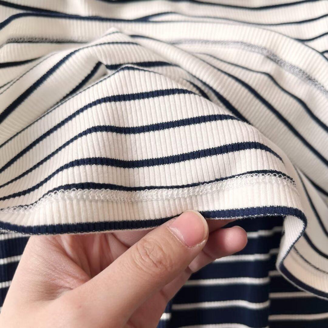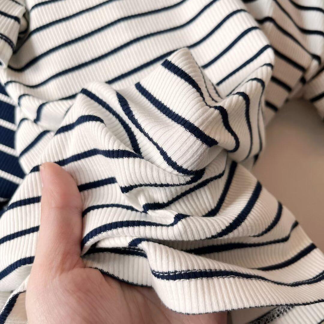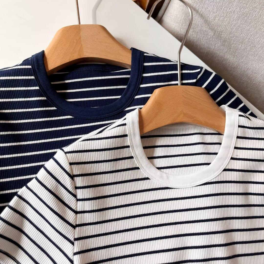 Camiseta japonesa de manga larga con cuello redondo de canalé suave, nueva de primavera 2024, base a rayas 467363