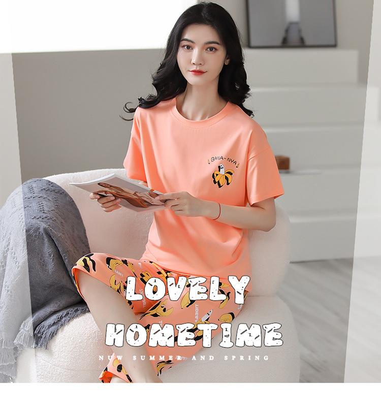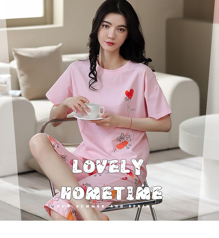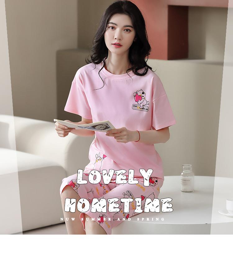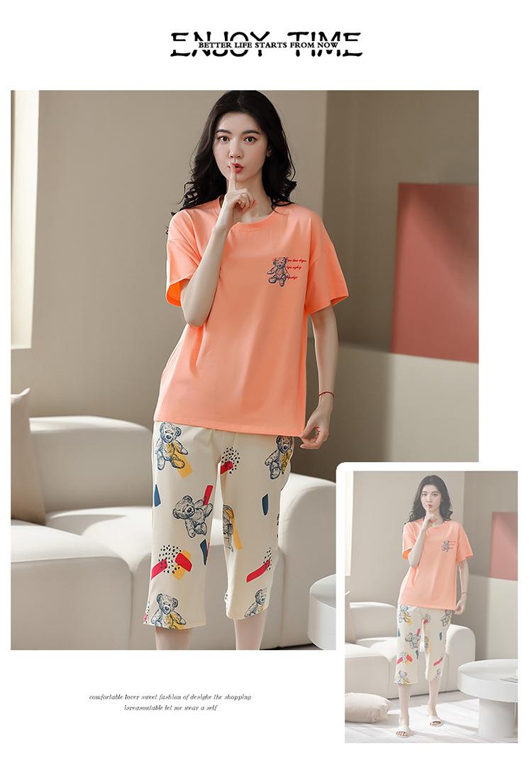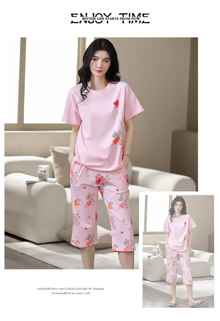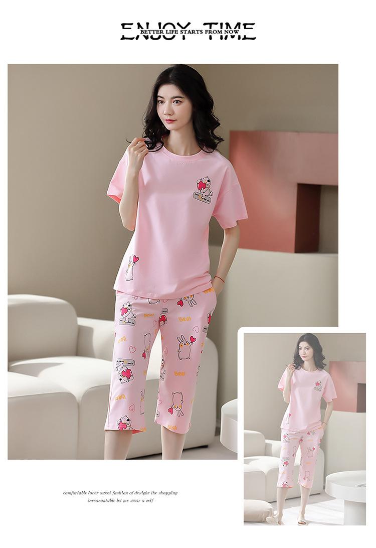 Pijama de dos piezas estilo coreano de verano para mujer, de algodón puro, con mangas cortas y pantalones capri, ideal para el hogar.
