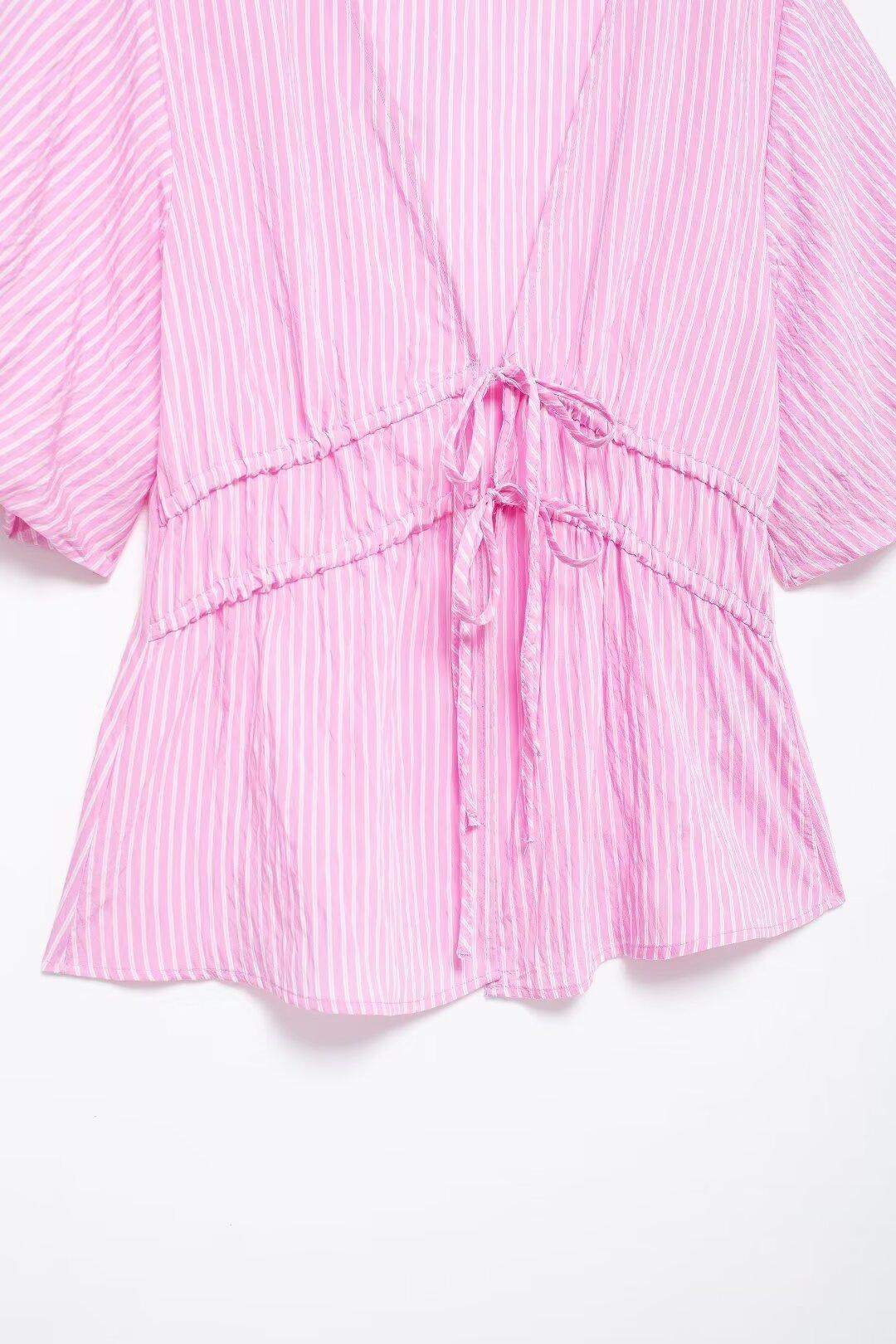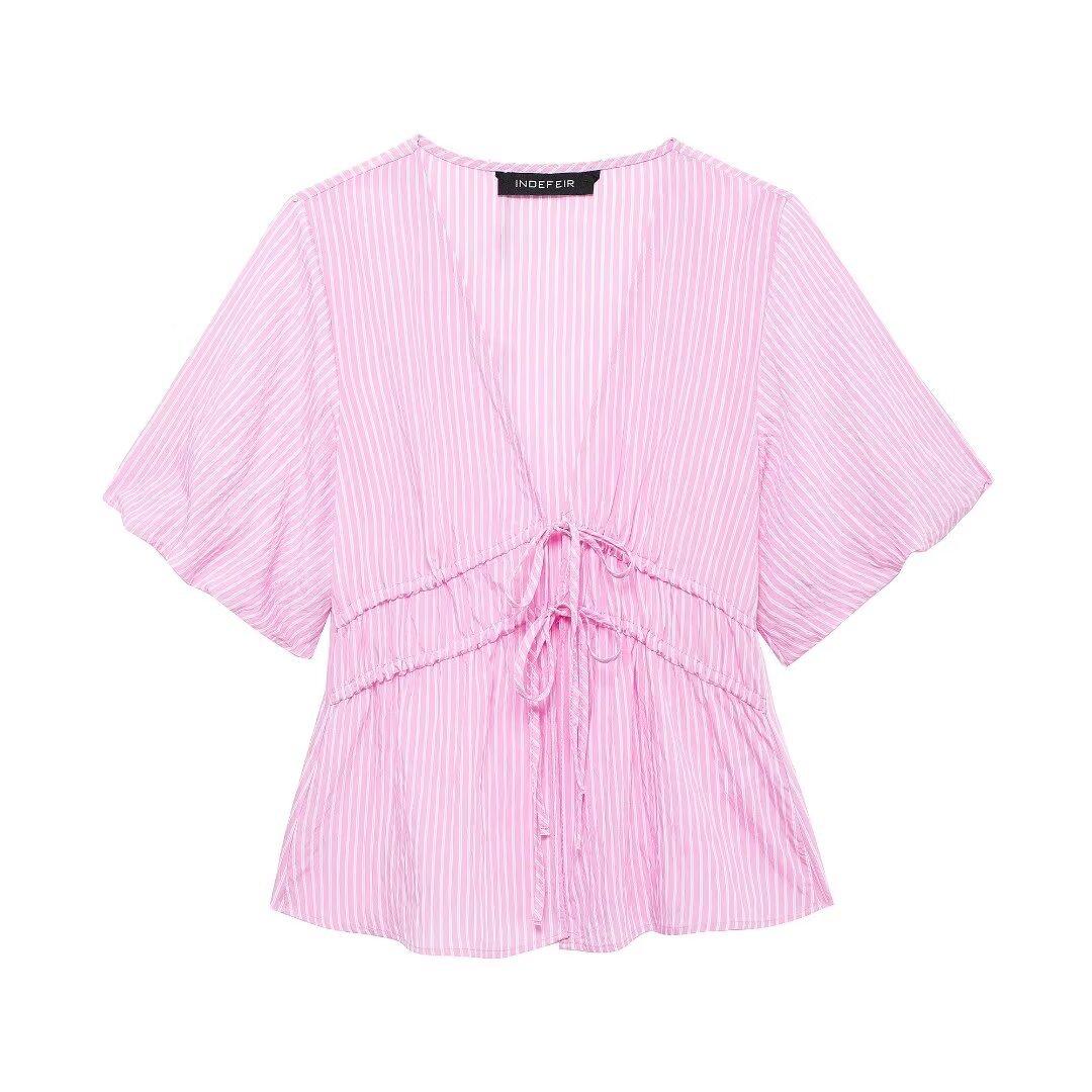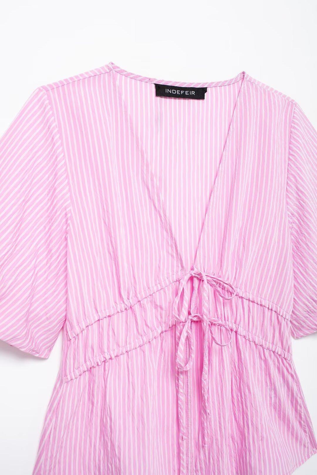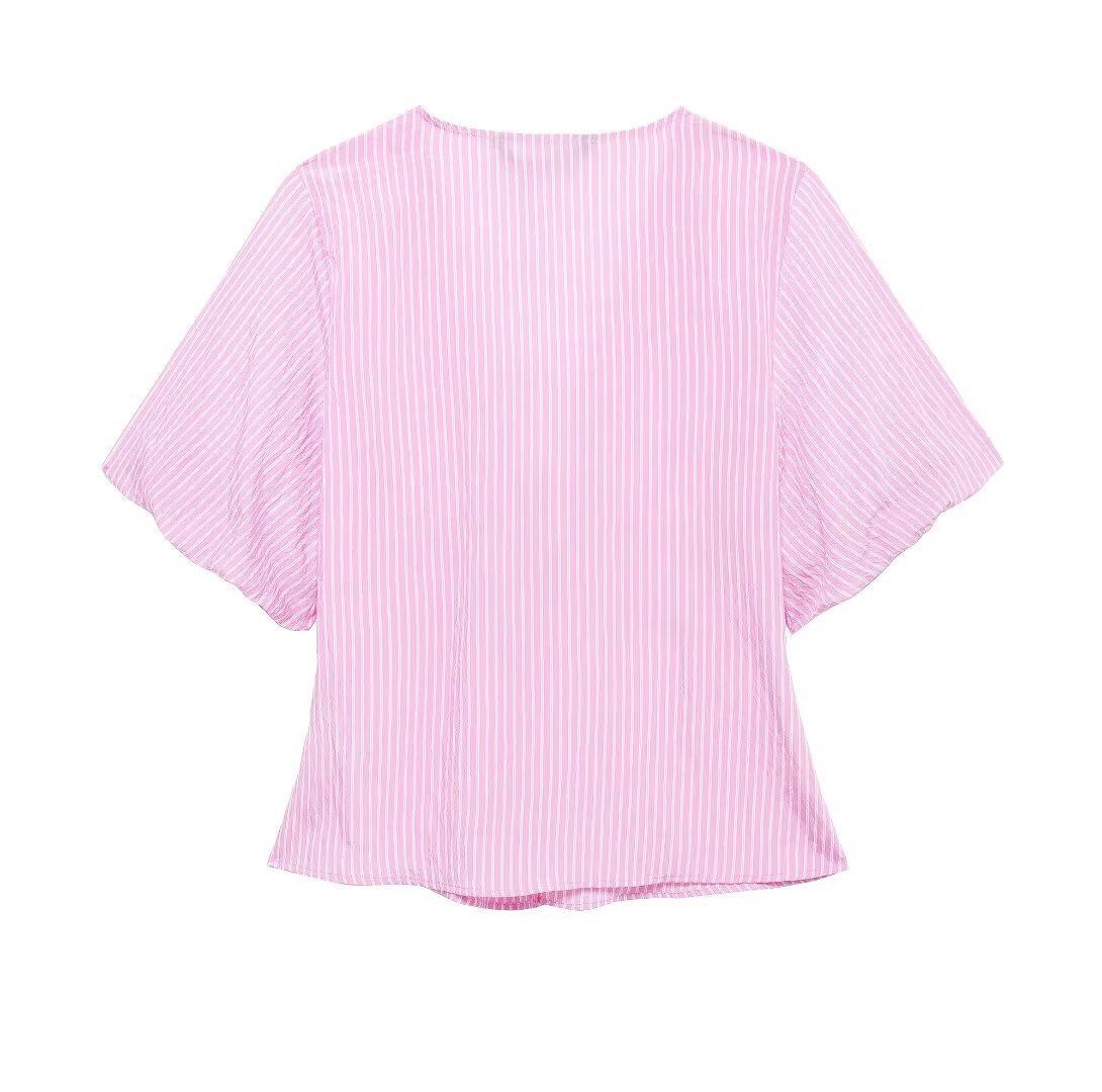 Blusa de rayas con lazo y escote en V para mujer, estilo europeo, manga corta con efecto polvo de burbujas, verano 2024