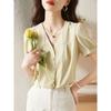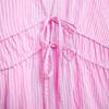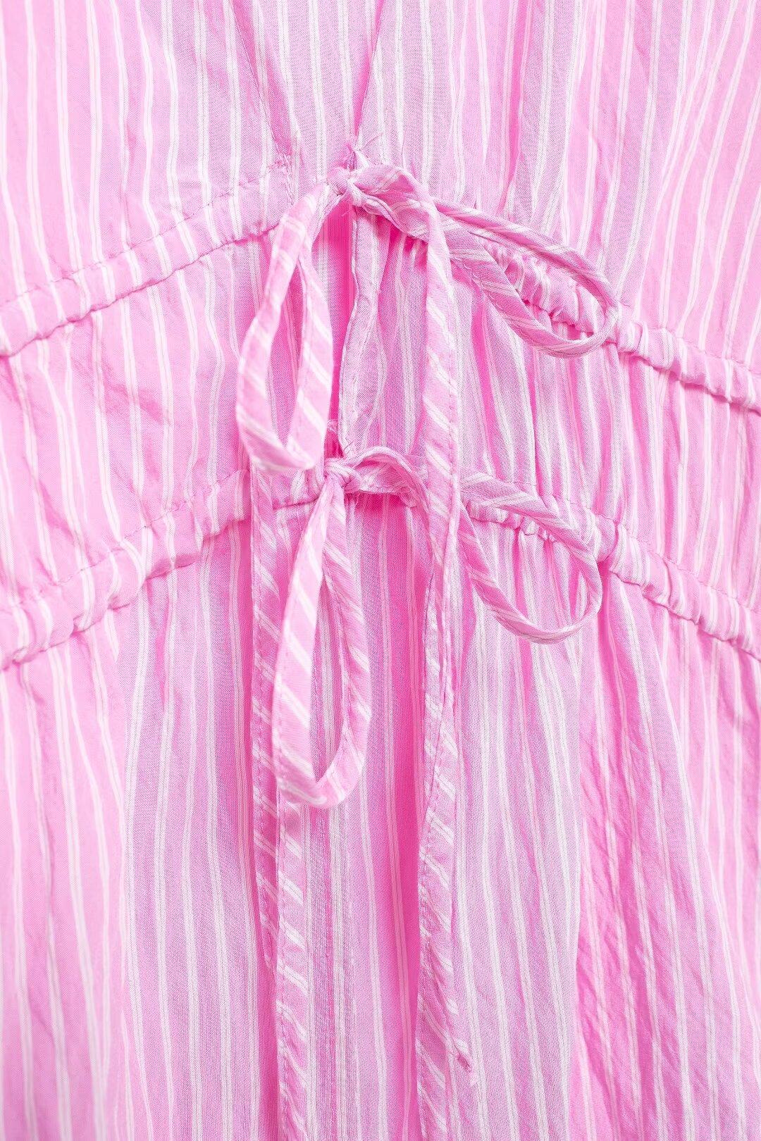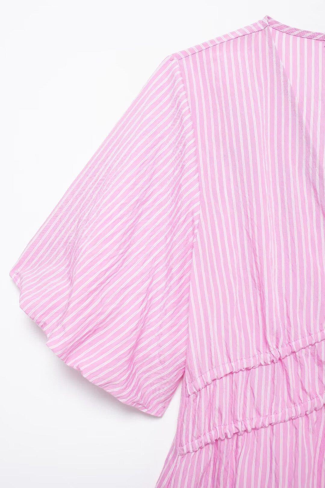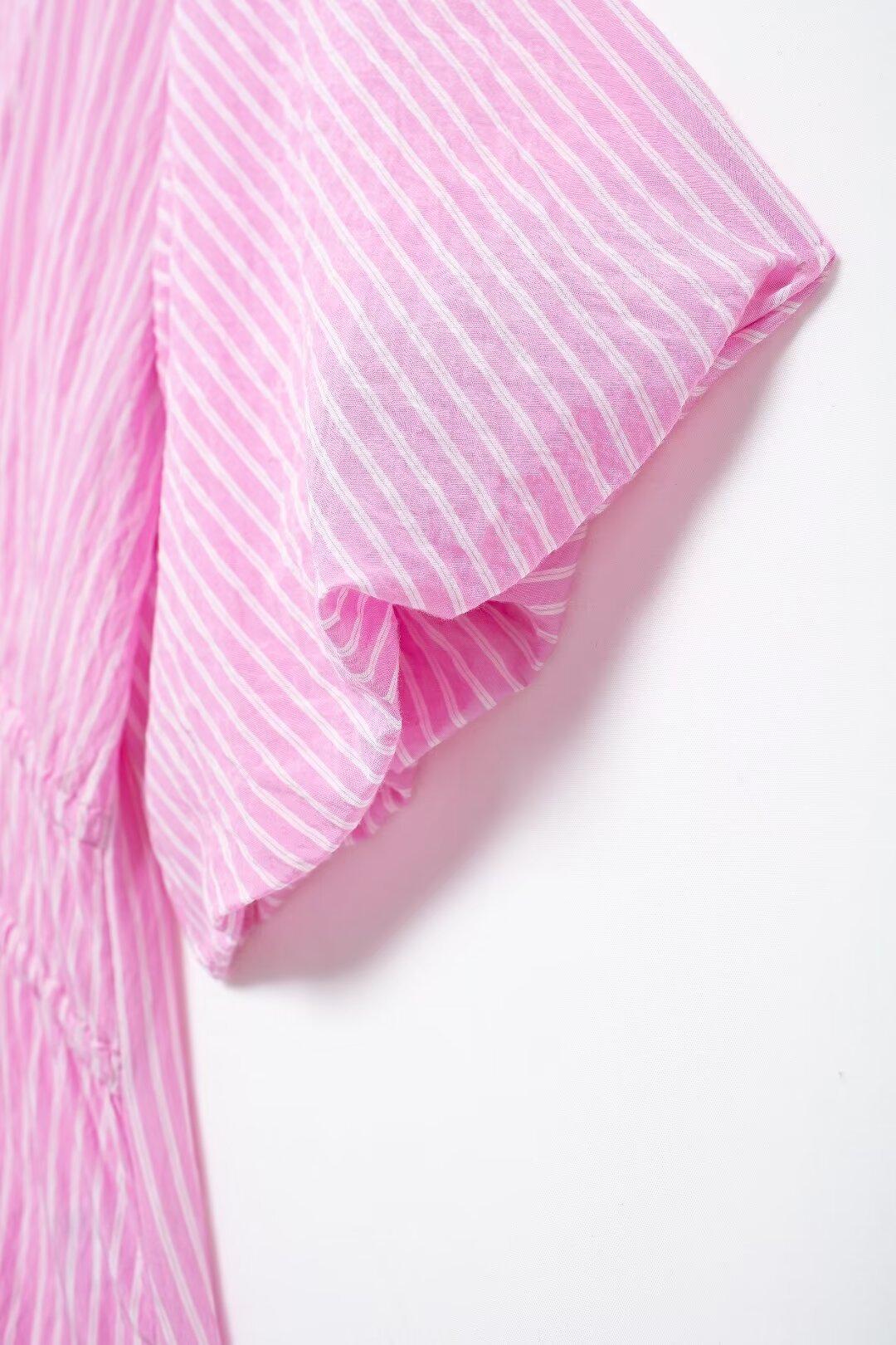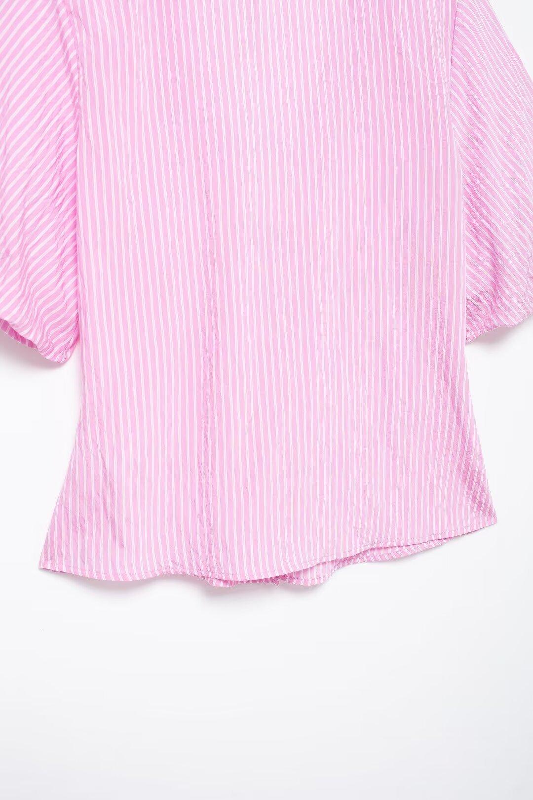 Blusa de rayas con lazo y escote en V para mujer, estilo europeo, manga corta con efecto polvo de burbujas, verano 2024