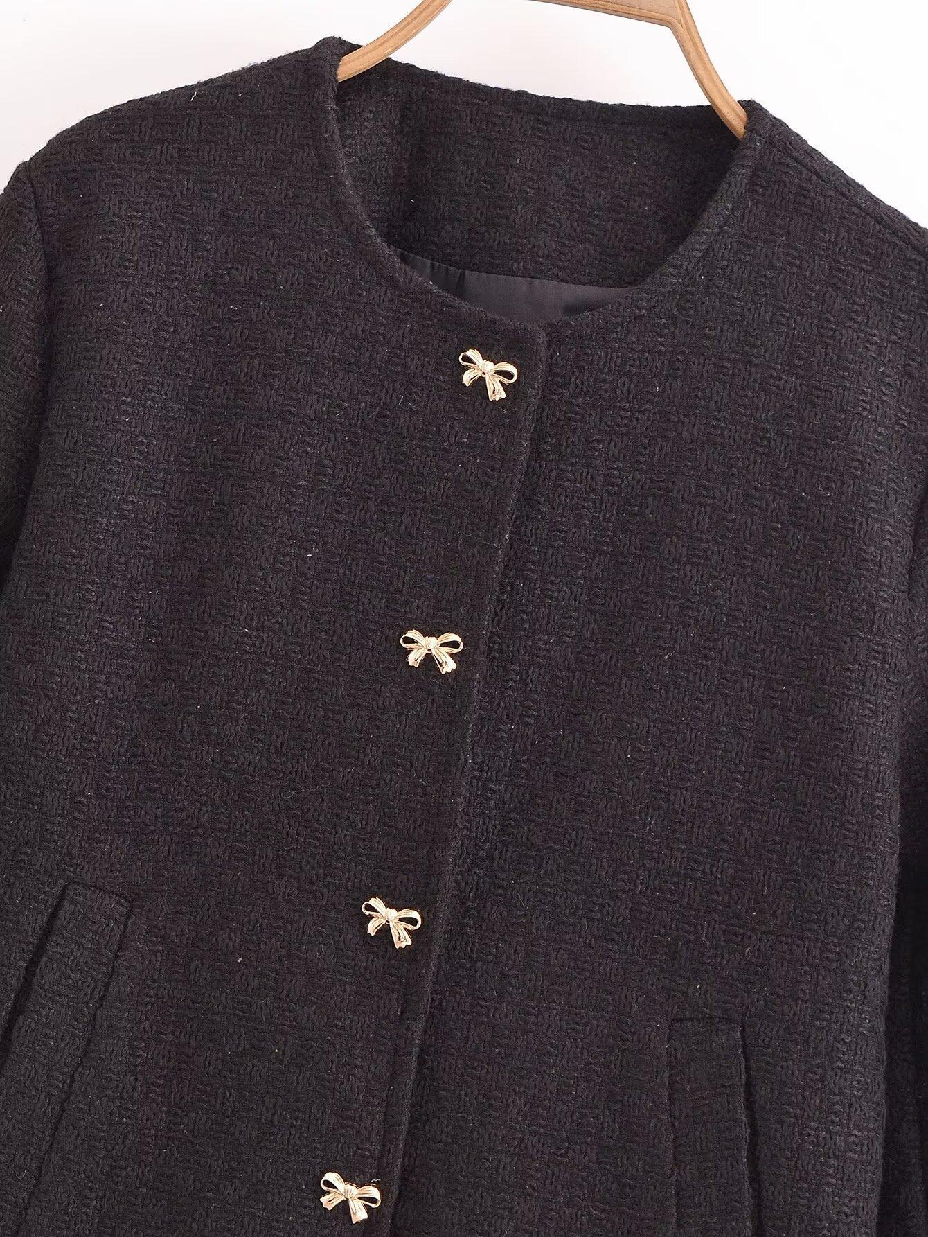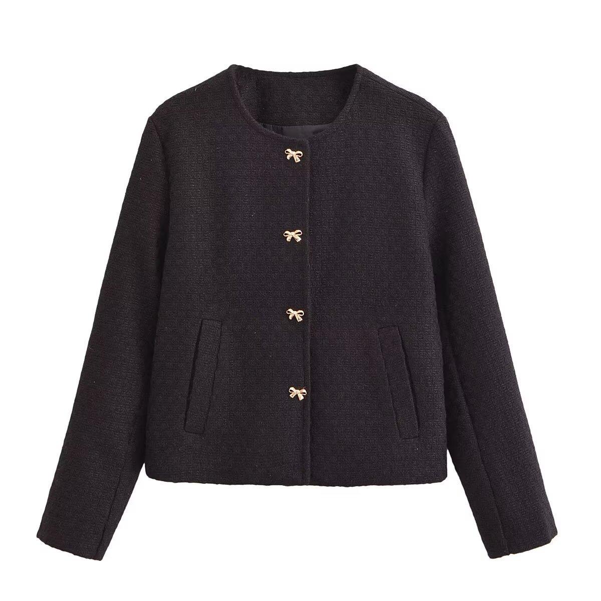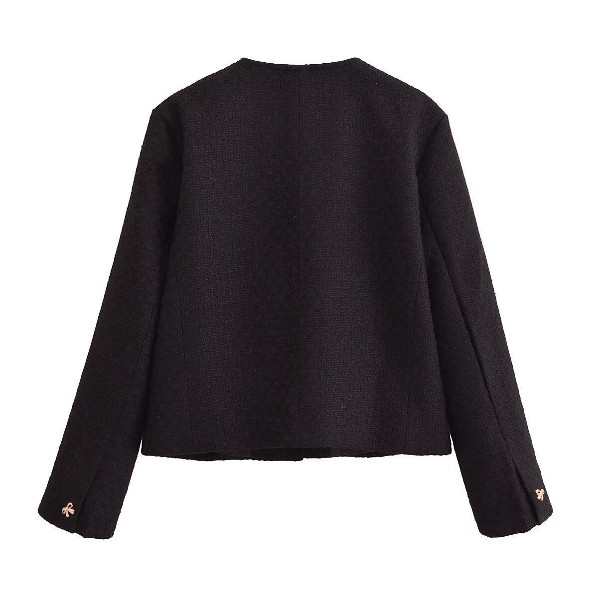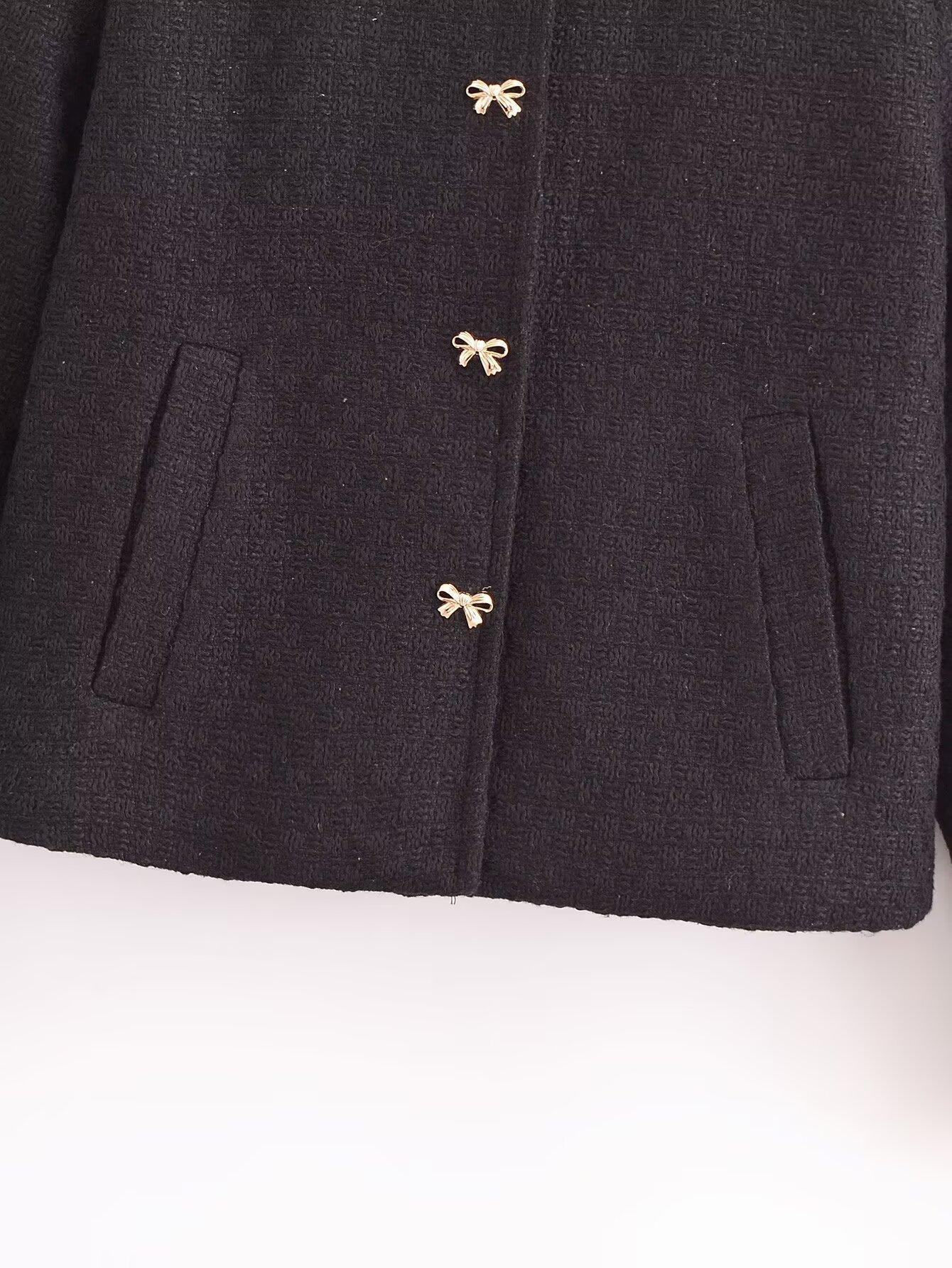 Chaqueta de manga larga con cuello alto y lazo decorado con cardado negro para otoño e invierno, abrigo para mujer 2024, tendencia europea y americana, nueva parte superior