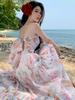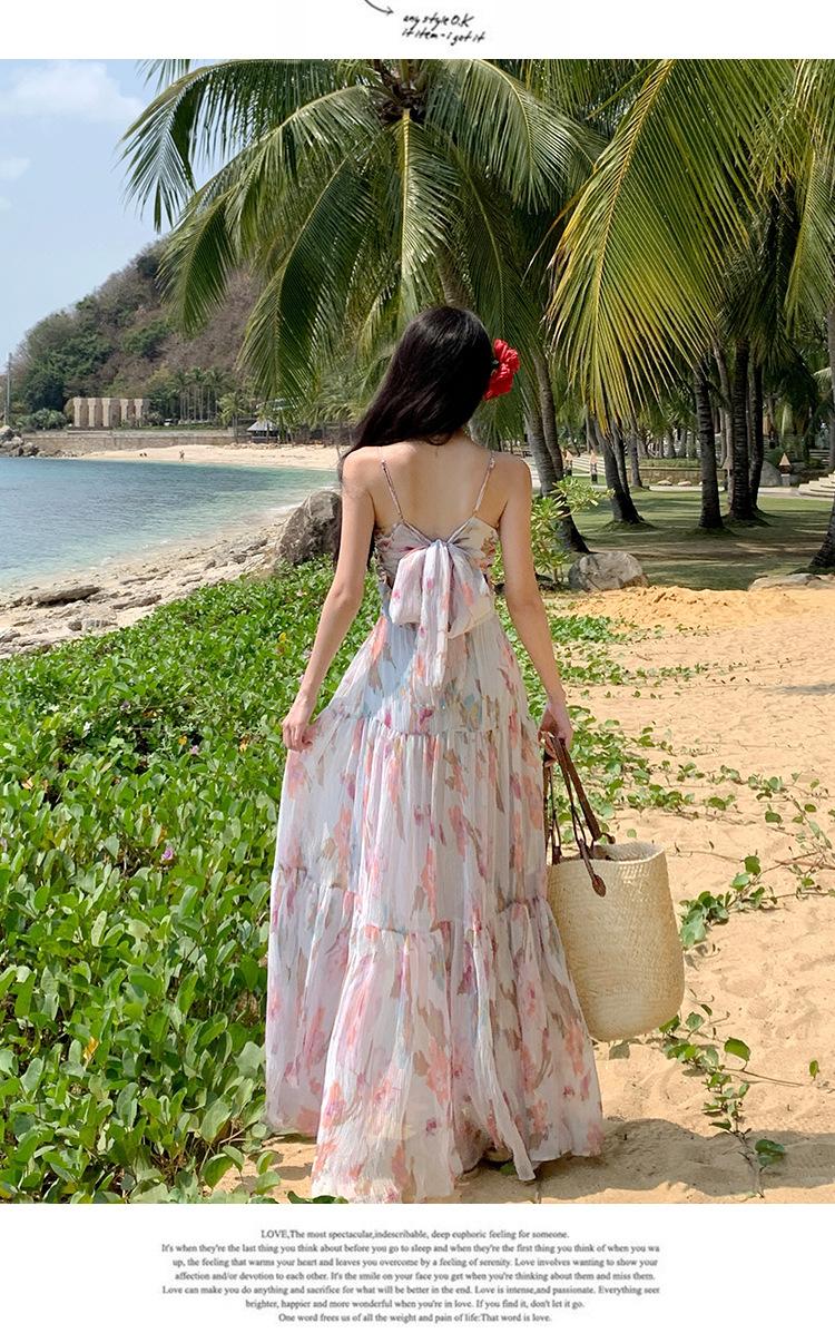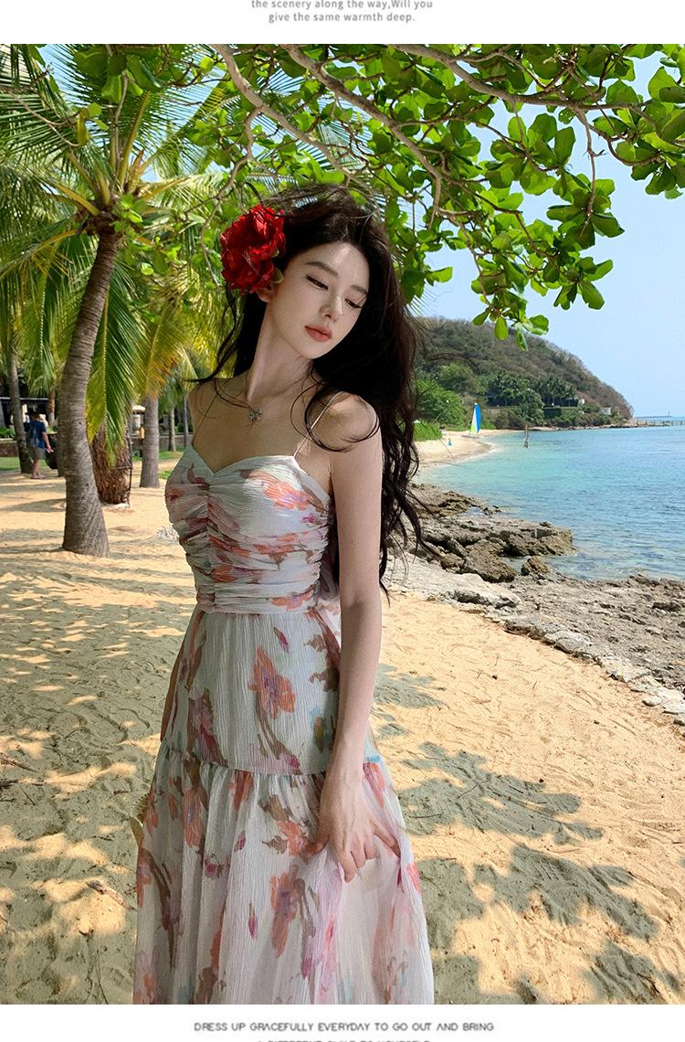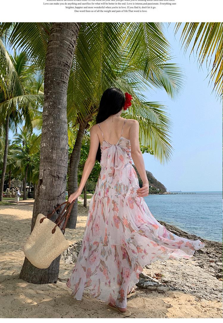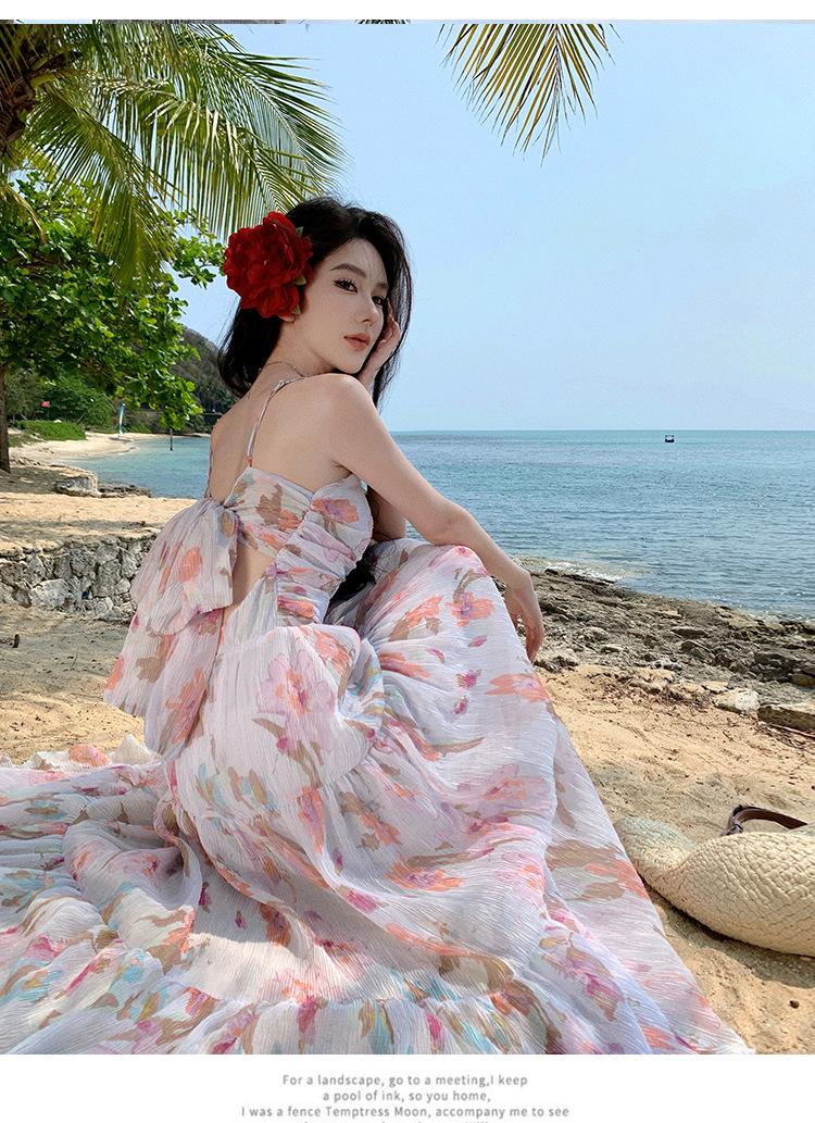 Vestido playero francés con tirantes, plisado, espalda descubierta y estampado floral, informal, de hadas, fino y elegante, largo.