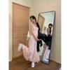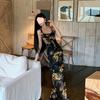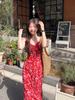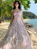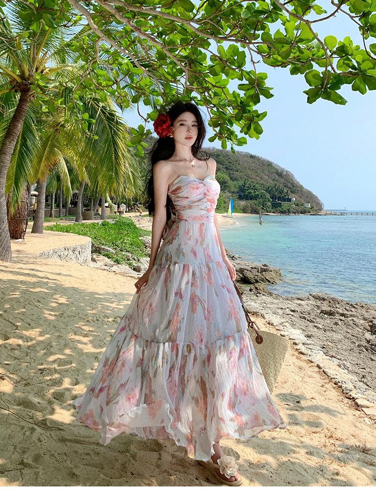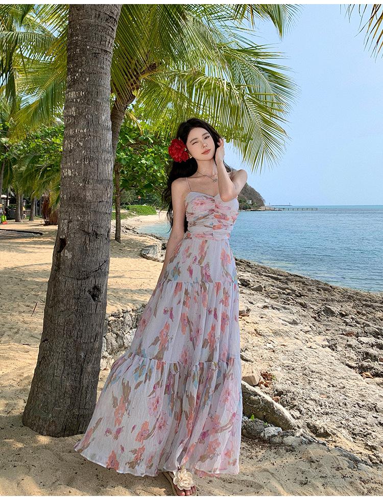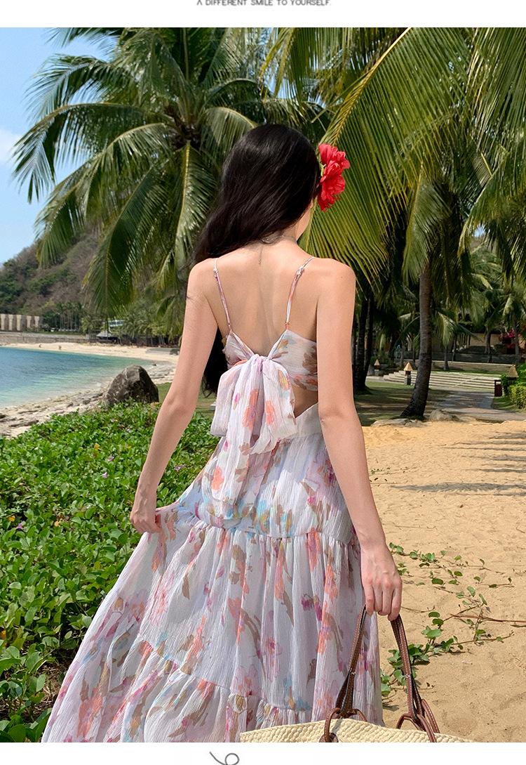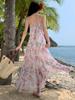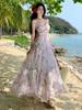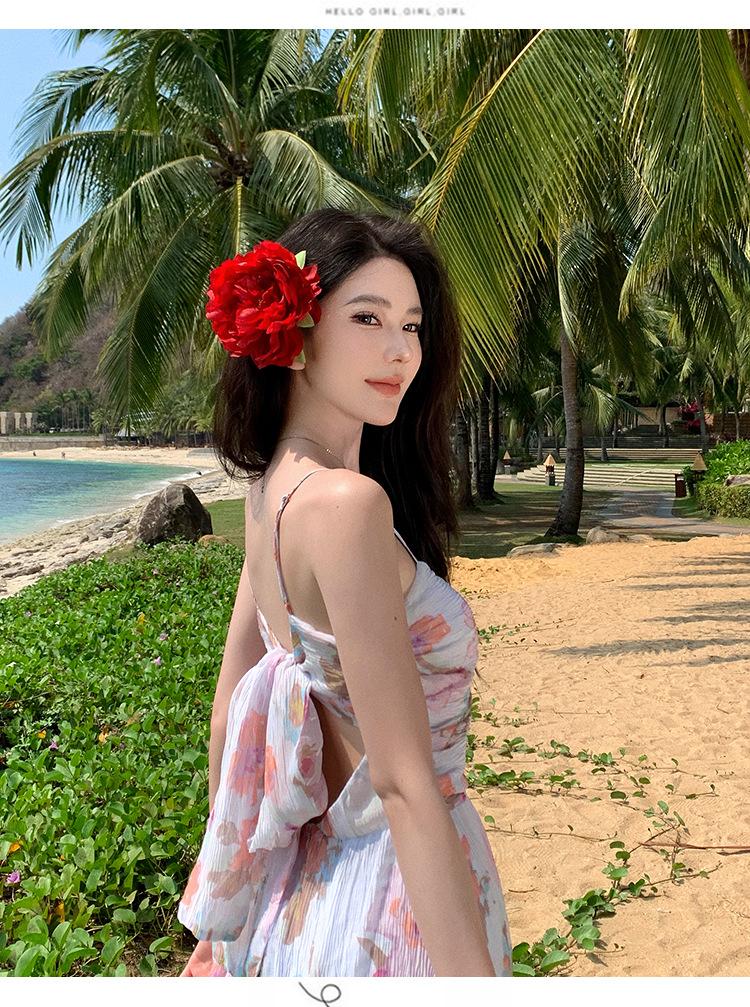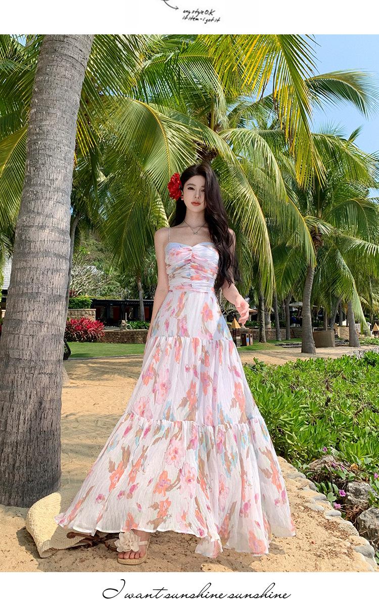 Vestido playero francés con tirantes, plisado, espalda descubierta y estampado floral, informal, de hadas, fino y elegante, largo.