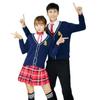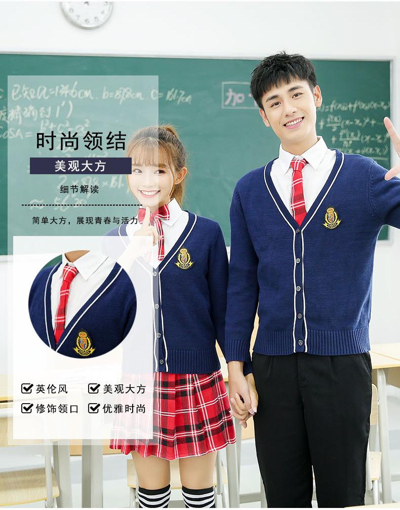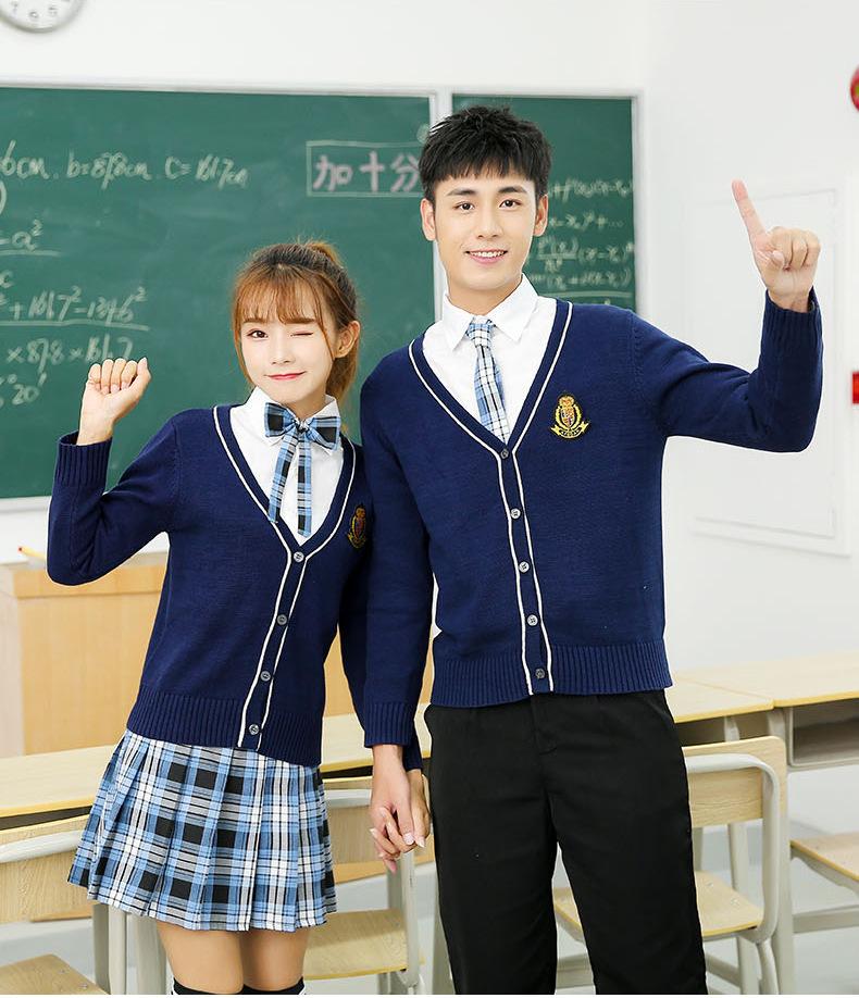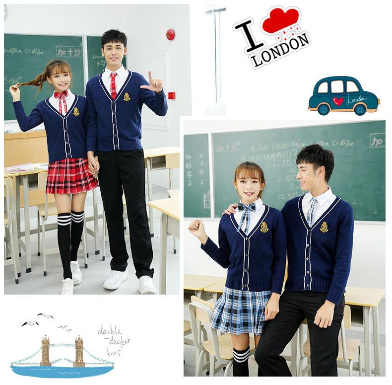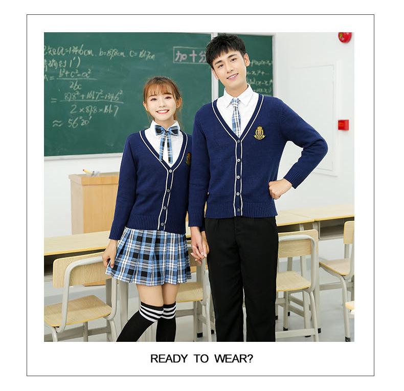 Women's blue cardigan + big red plaid skirt + pure white shirt + red plaid bow, Men's blue cardigan + pure whi...