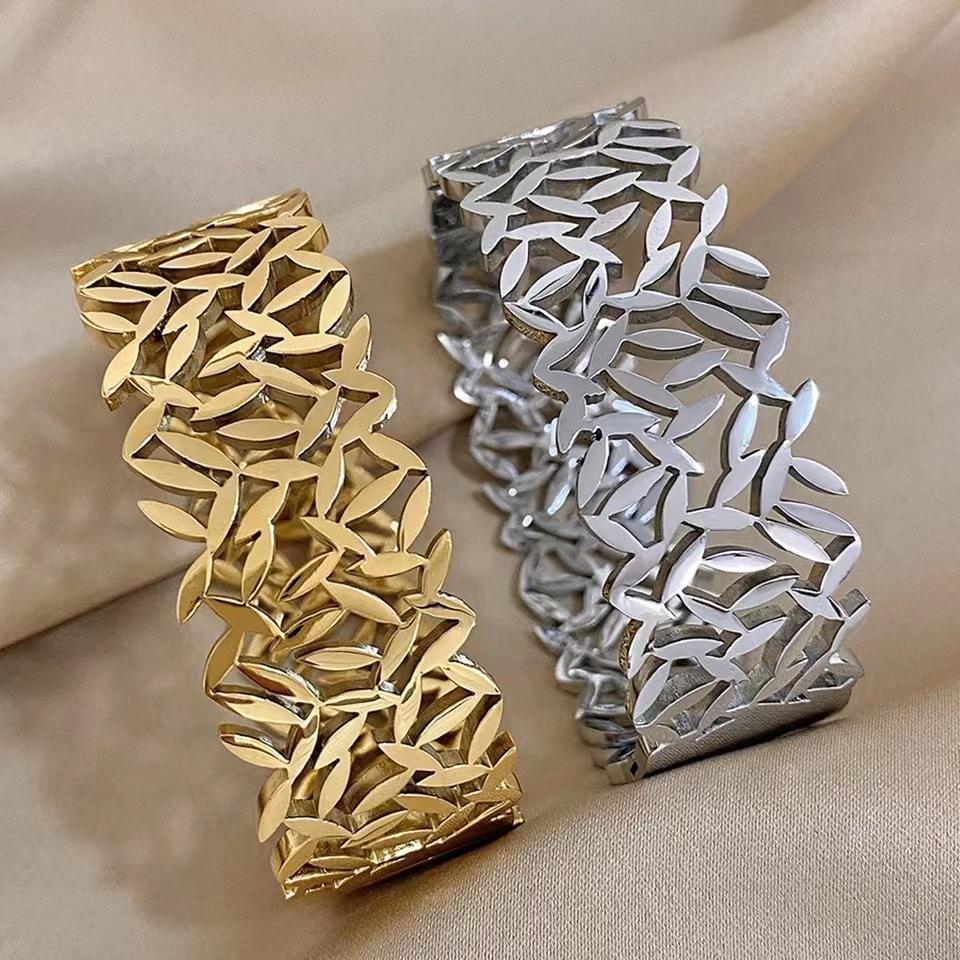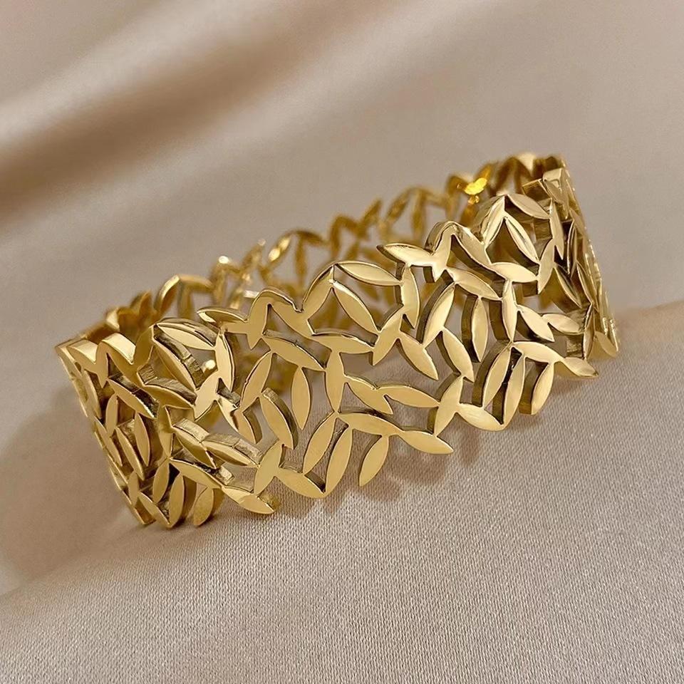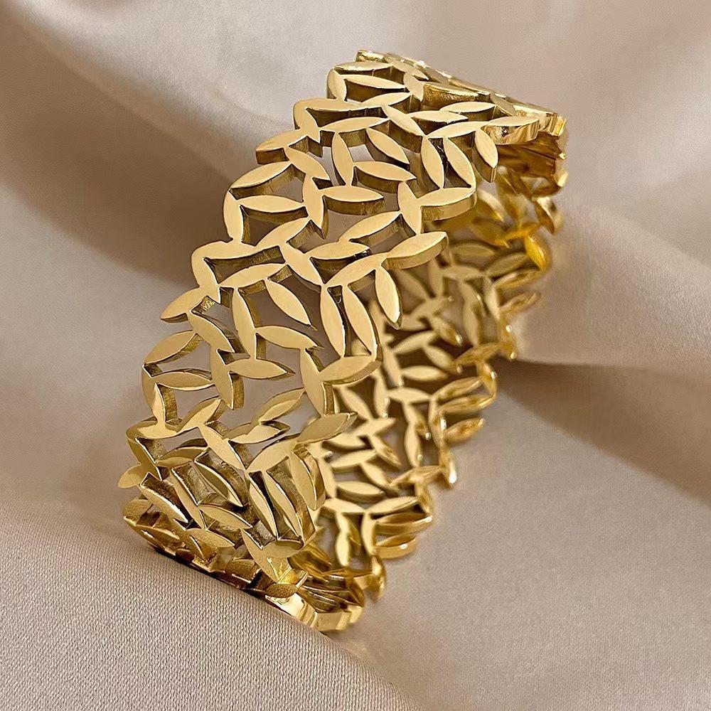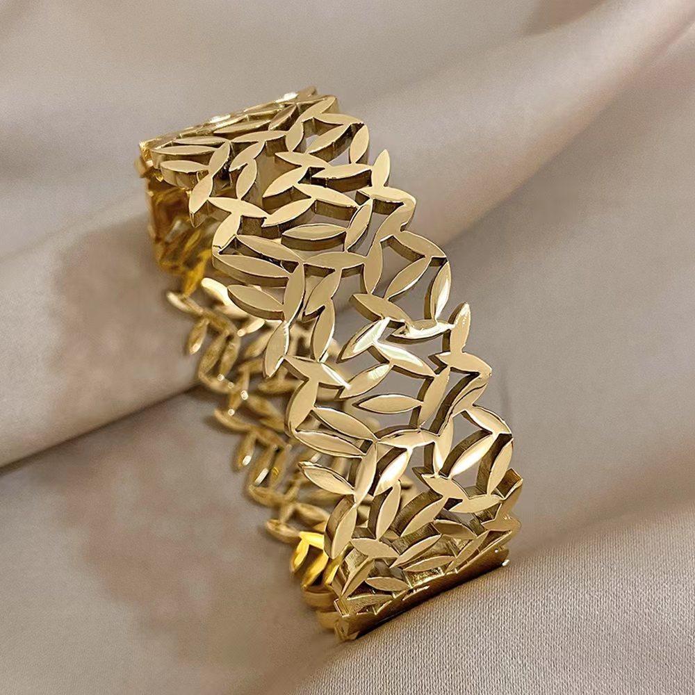 Pulsera transfronteriza europea y americana de acero de titanio dorado para mujer, creativa, moderna, ancha, hueca, con hojas, para pareja, abierta, joyería