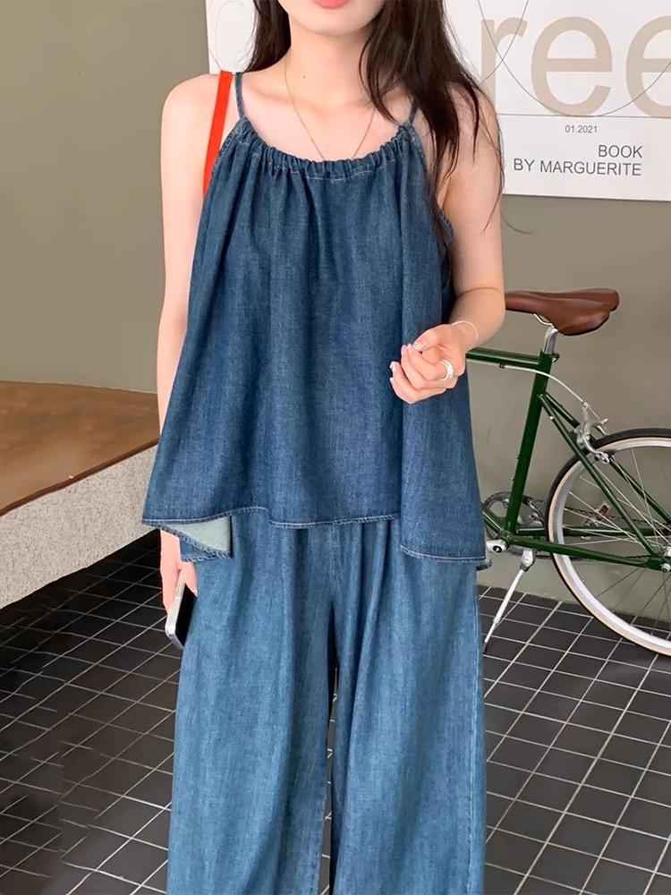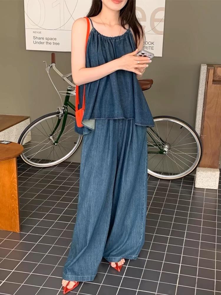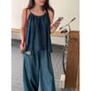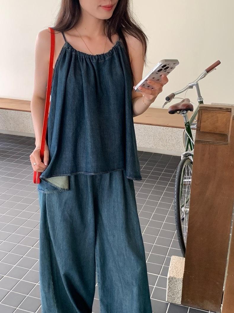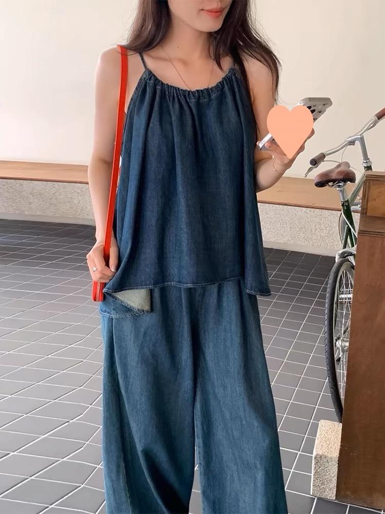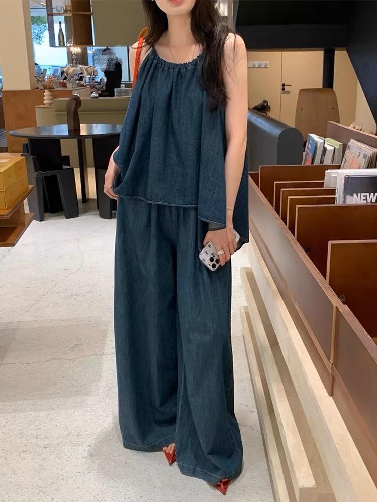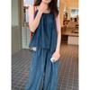 Verano Vintage Combinable Cordón Cuello Colgante Imitación Denim Top Chaleco Cintura Alta Pierna Ancha Traje de Pantalón