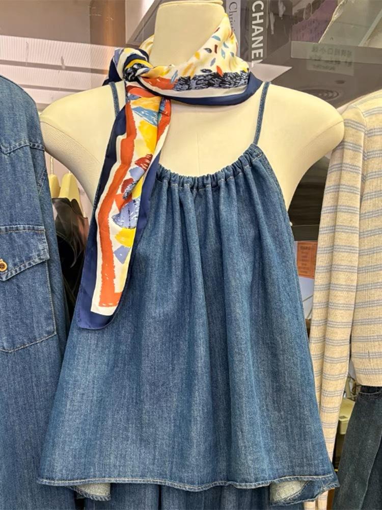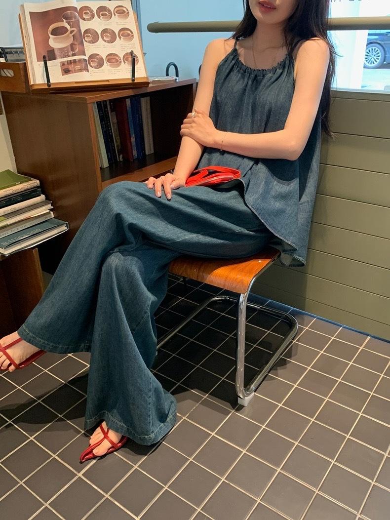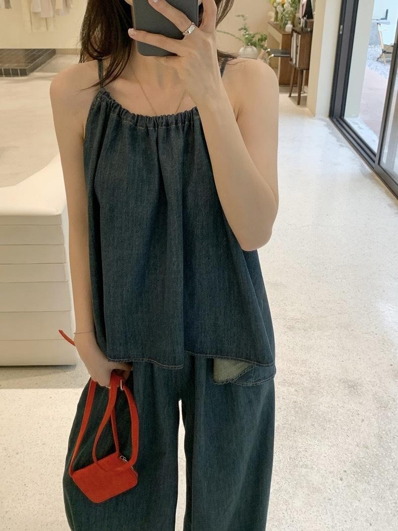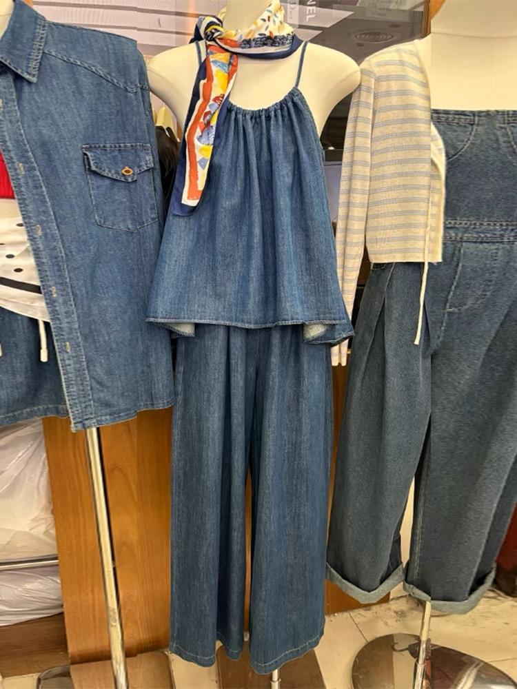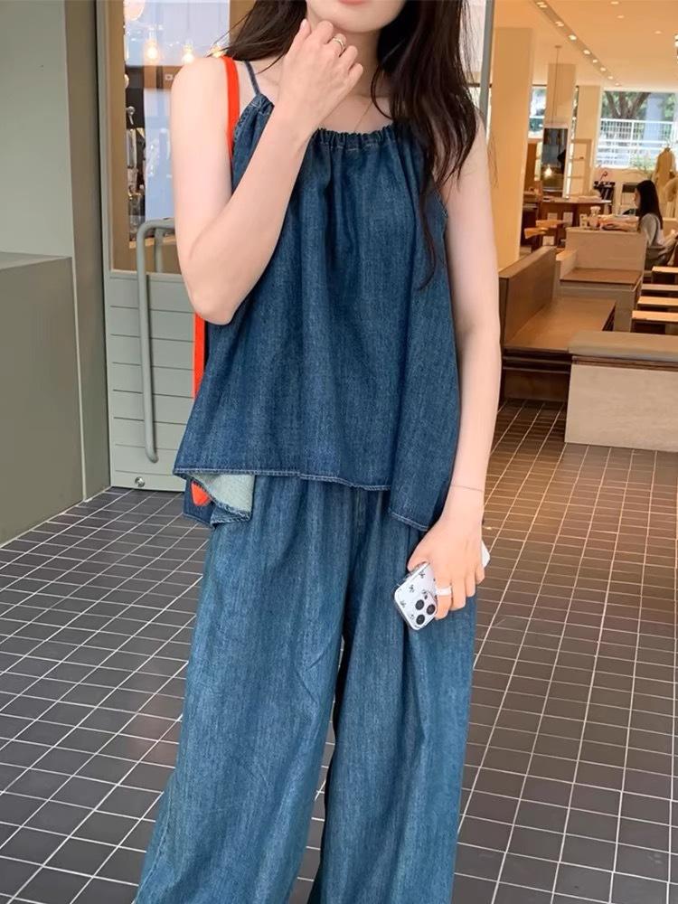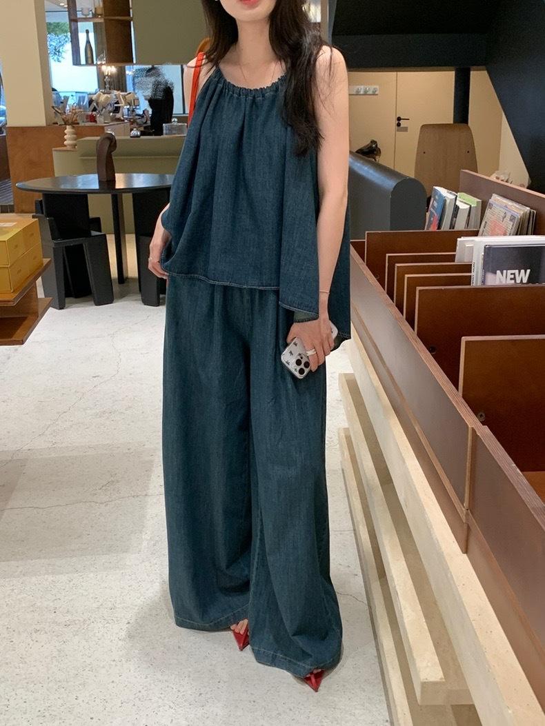 Verano Vintage Combinable Cordón Cuello Colgante Imitación Denim Top Chaleco Cintura Alta Pierna Ancha Traje de Pantalón