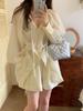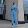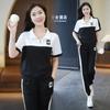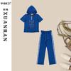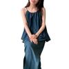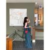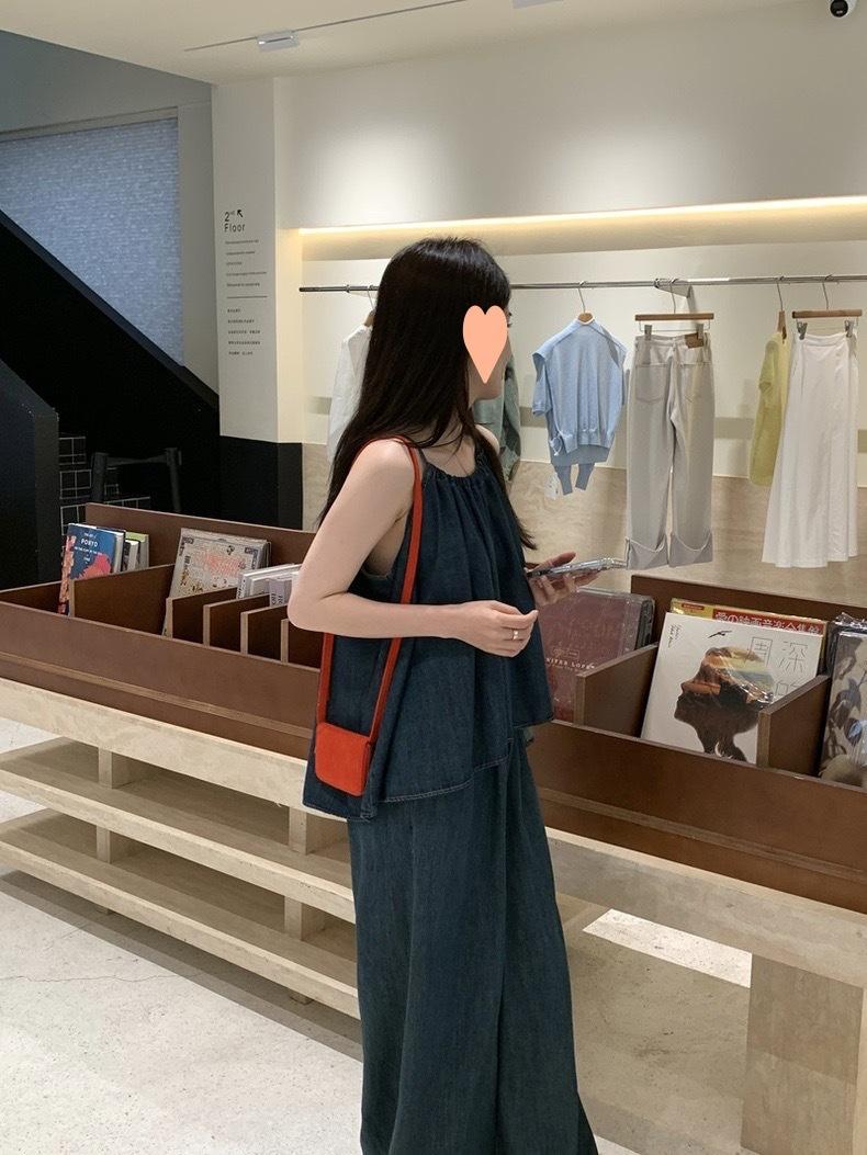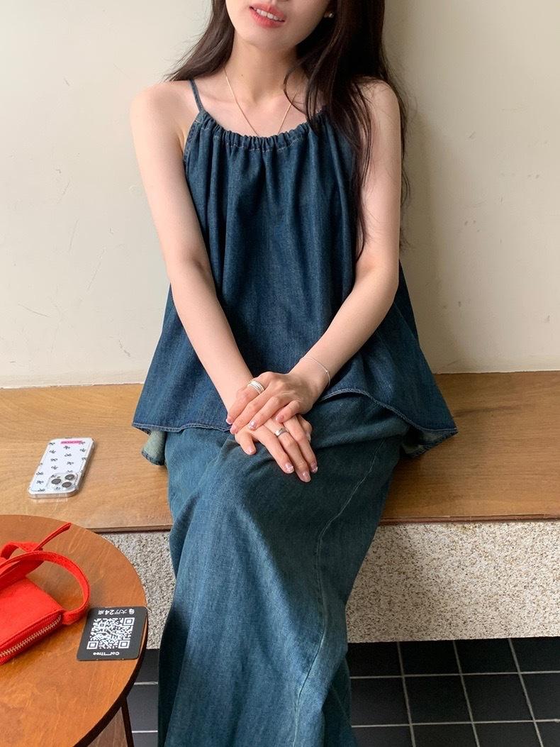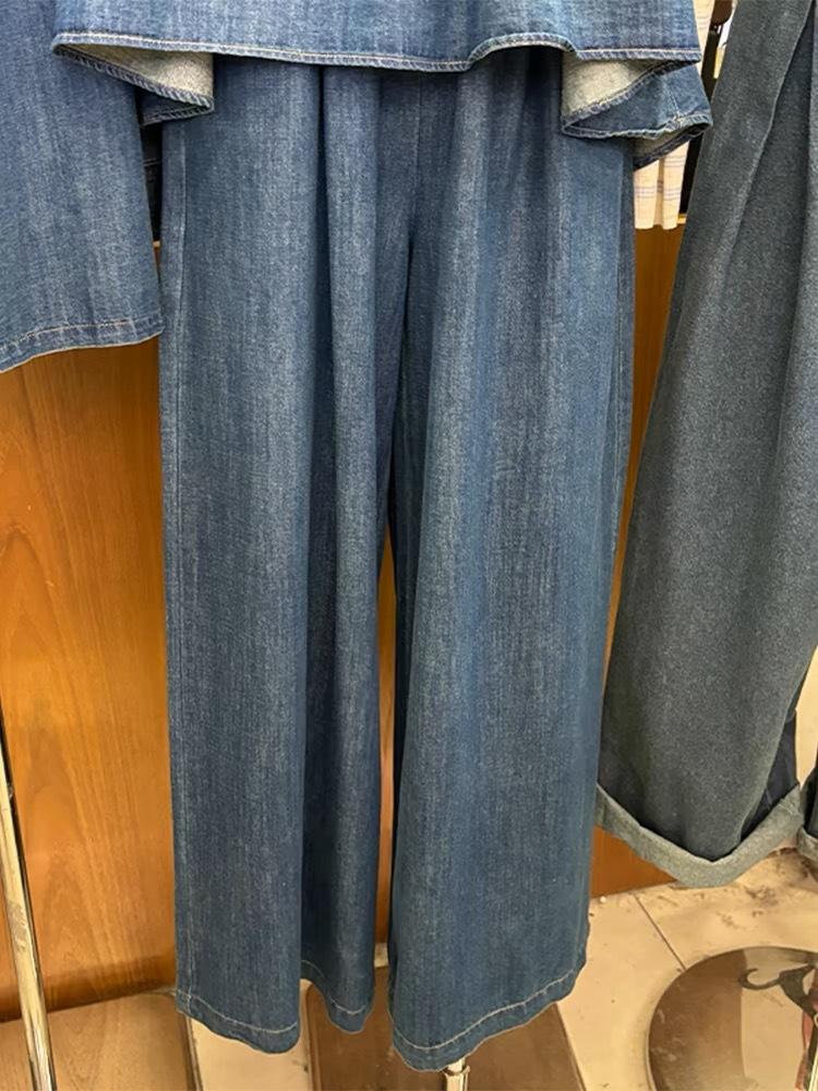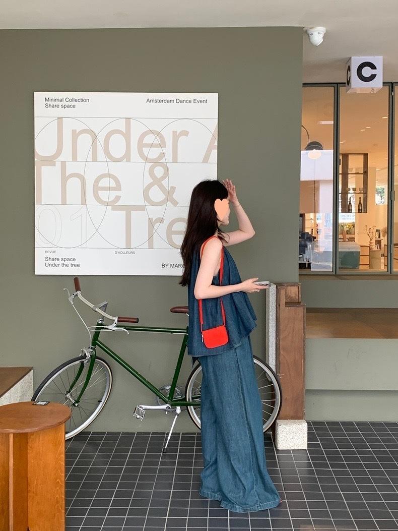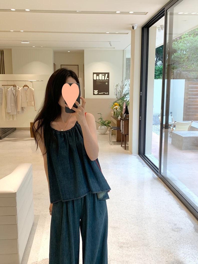 Verano Vintage Combinable Cordón Cuello Colgante Imitación Denim Top Chaleco Cintura Alta Pierna Ancha Traje de Pantalón