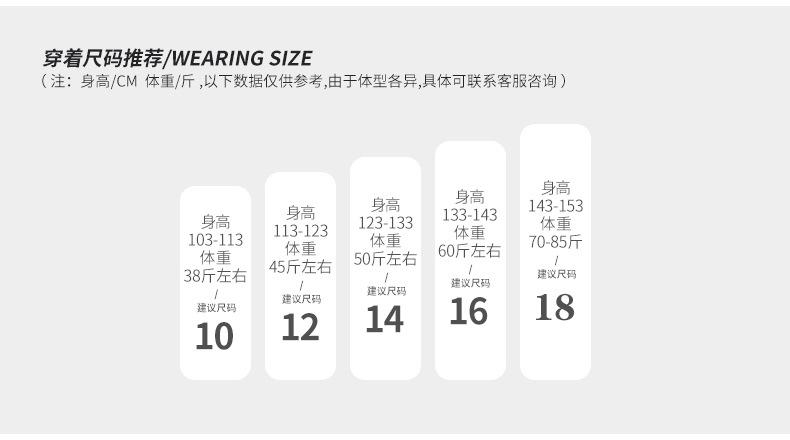 Size 10 (103-113cm), Size 12 (113-123cm), Size 14 (123-133cm), Size 16 (133-143cm), Size 18 (143-153cm)