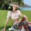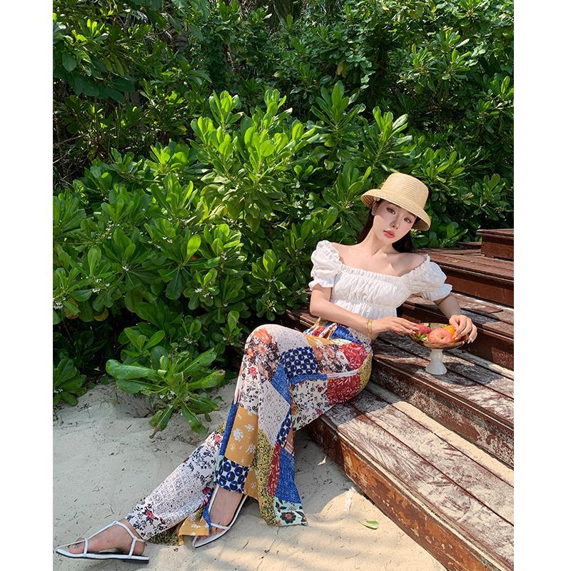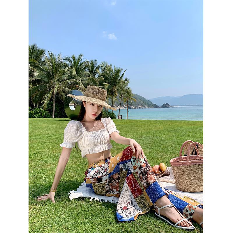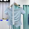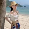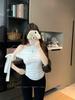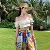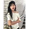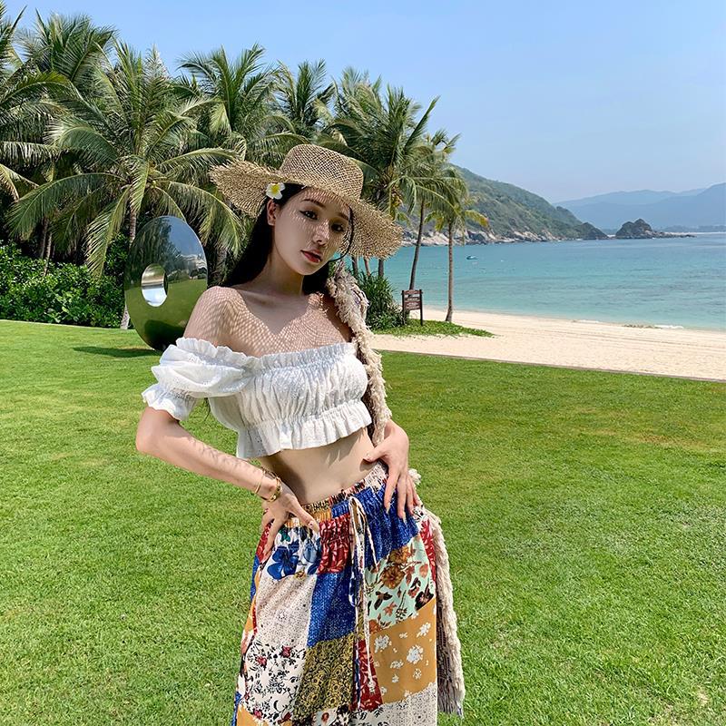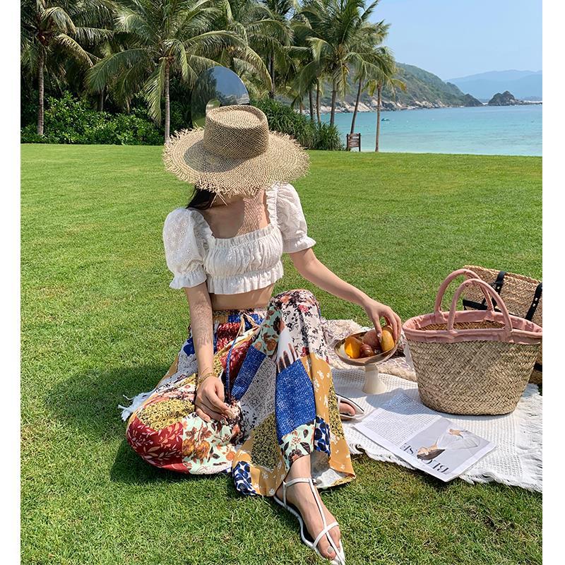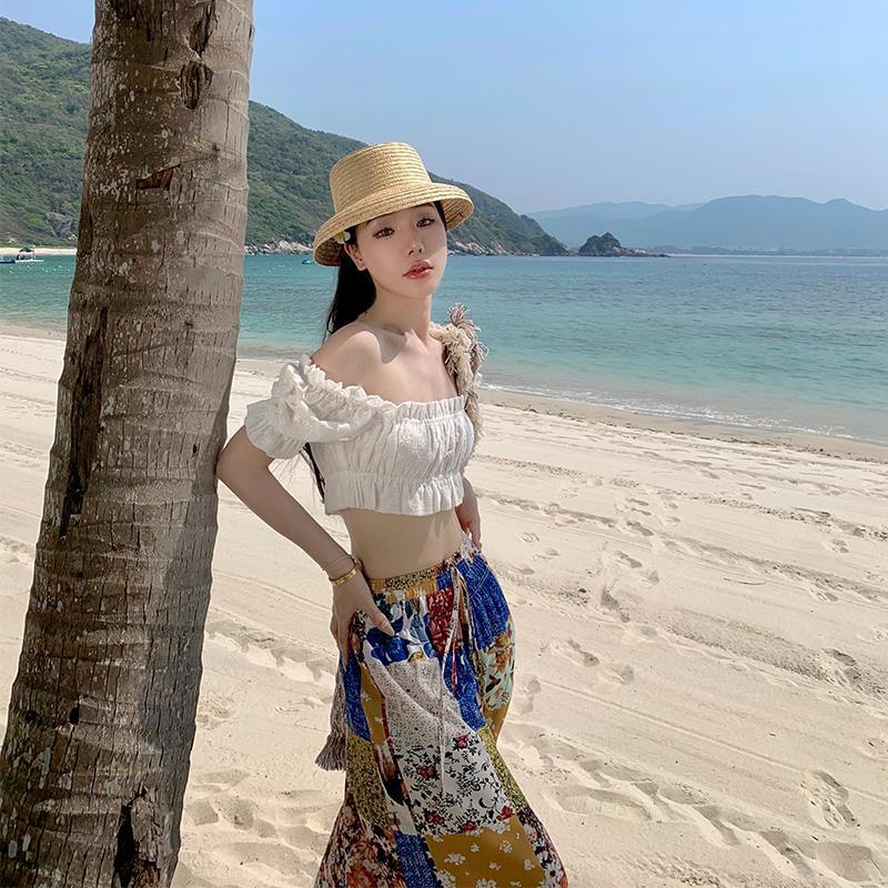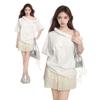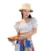 Blusa de verano de manga corta con bordado de jacquard de Super Fairy, blanca, sexy, con hombros descubiertos y encaje en la clavícula.