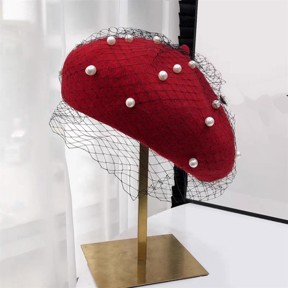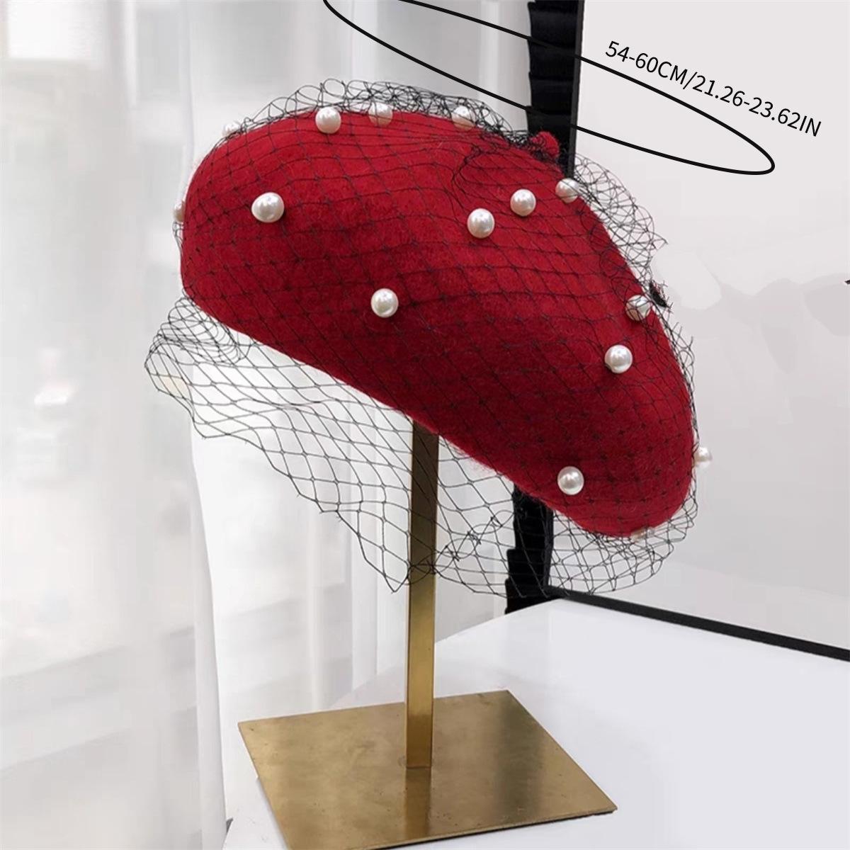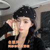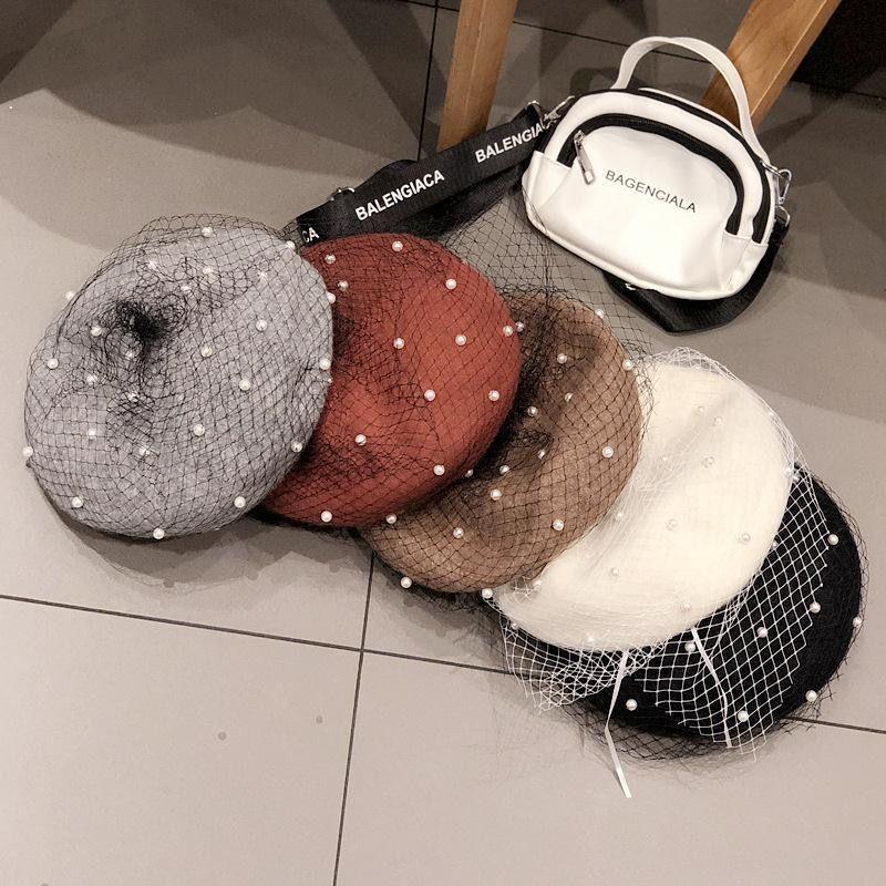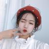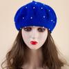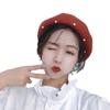 Sombrero de malla de perla estilo coreano para otoño e invierno, boina de pintor de lana estilo británico retro japonés para mujer, sombrero de calabaza de color sólido