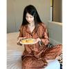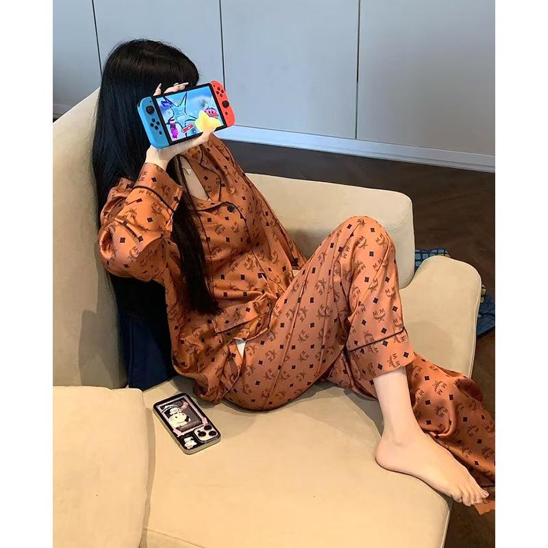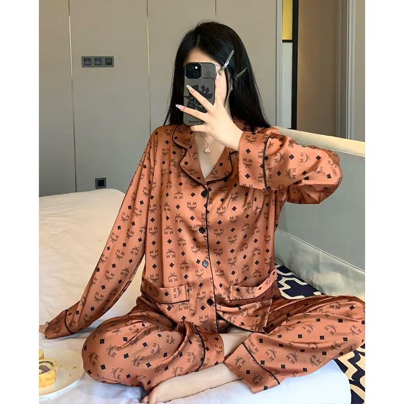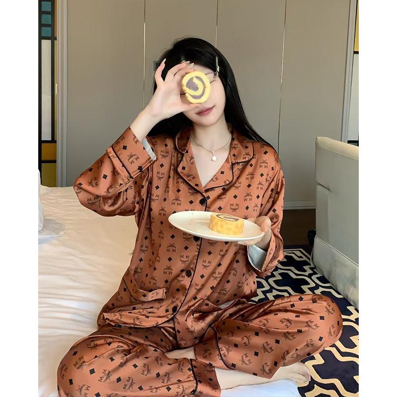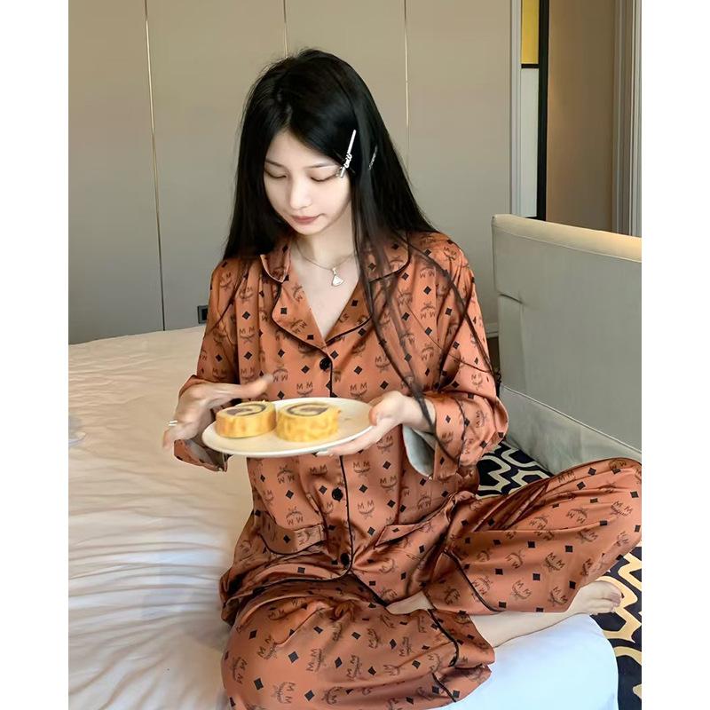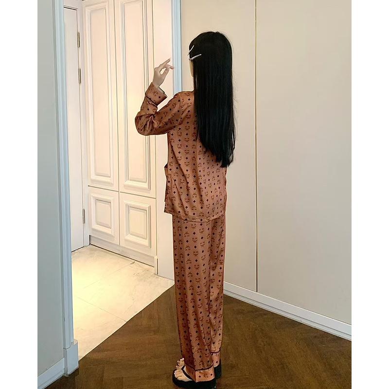 Pijamas de estilo superior de la familia M, de seda helada, de manga larga, cálidos y cómodos, para el hogar, para otoño e invierno.