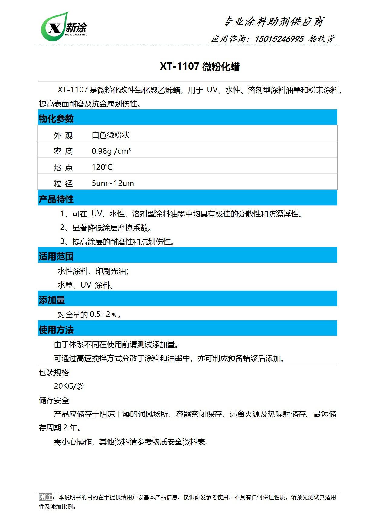 Tiene múltiples funciones de aplicación, incluyendo antiarañazos, resistencia al desgaste, antiadherencia, endurecimiento, etc. Como material polimérico especial, la cera en polvo se usa ampliamente en tintas, recubrimientos, plásticos de ingeniería, aceites, grasas y nuevos materiales. Su tamaño promedio de partícula es generalmente de 3 a 10 µm, y la película de pintura preparada tiene un tacto suave y limpio. La cera en polvo no solo tiene buena finura, dispersabilidad, alto punto de fusión y alta viscosidad de fusión, sino que también tiene lubricidad, lo que tiene un gran efecto en la dispersión uniforme de rellenos, resinas y aditivos. Además, la cera en polvo también tiene aplicaciones específicas en los campos textil y cosmético, como el aumento de la suavidad, las propiedades antiestáticas, impermeables y antibolitas del hilo de encolado, así como la mejora del punto de reblandecimiento, la dispersabilidad y la suavidad.