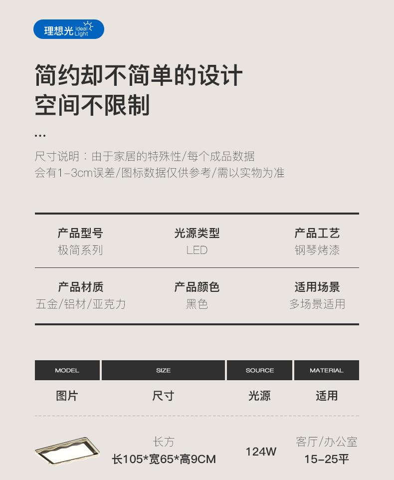 Full spectrum black living room lamp rectangular 105*65cm-three-color dimming, Full spectrum black living room...
