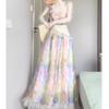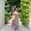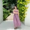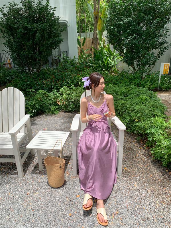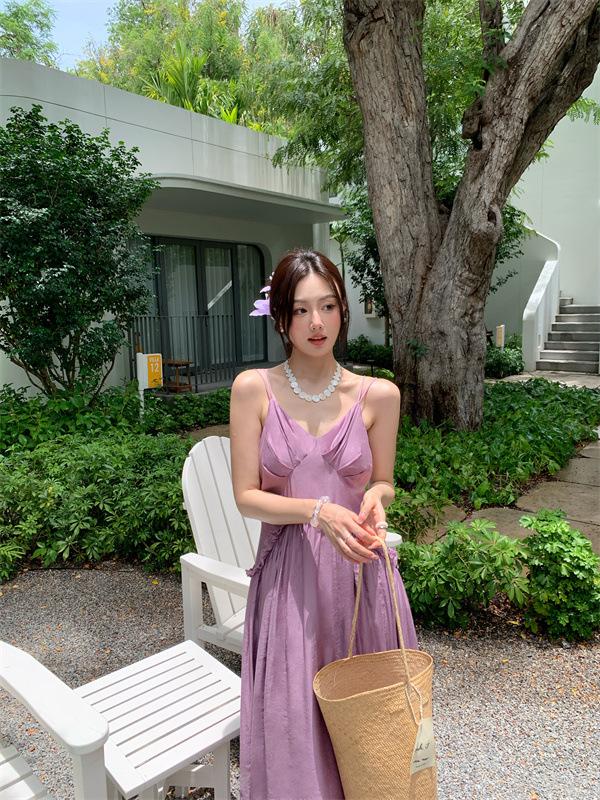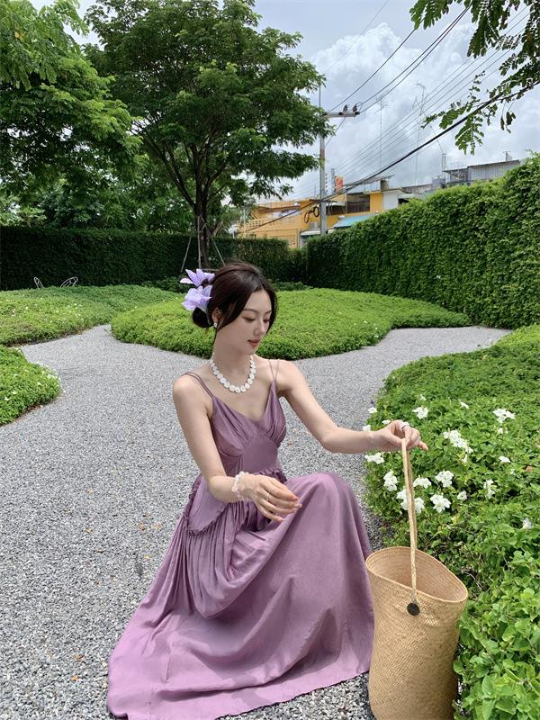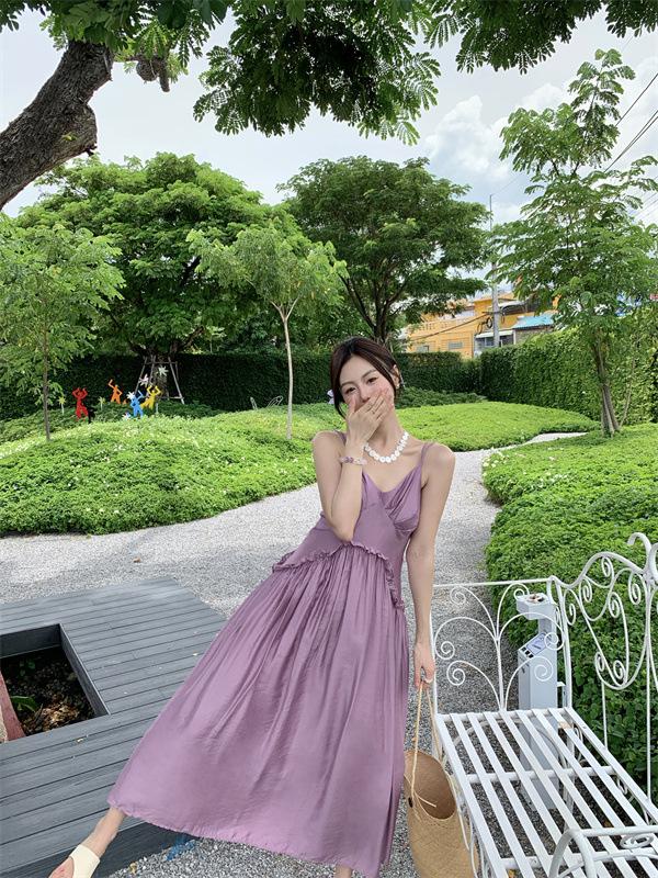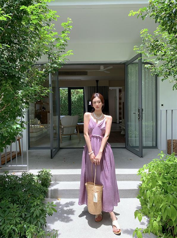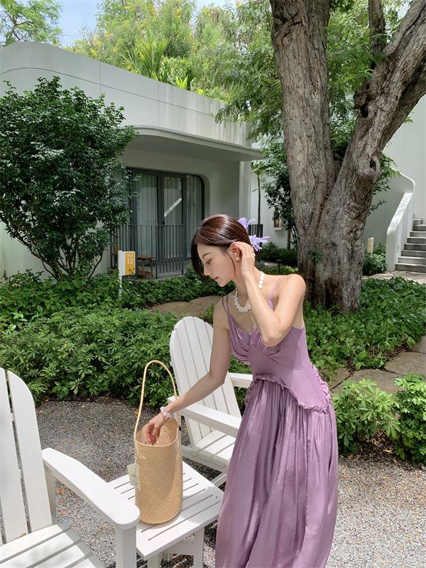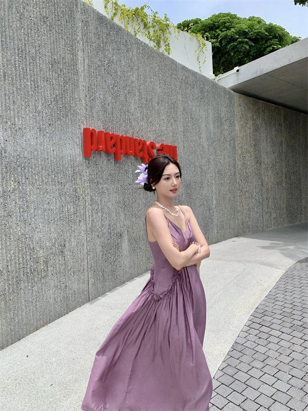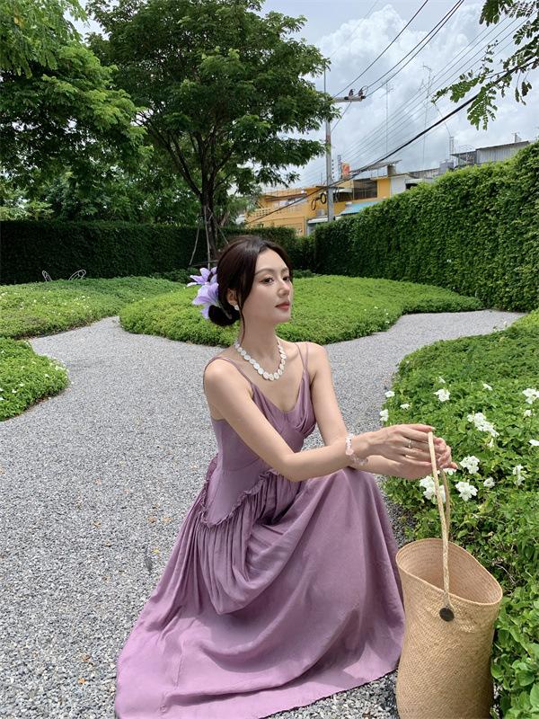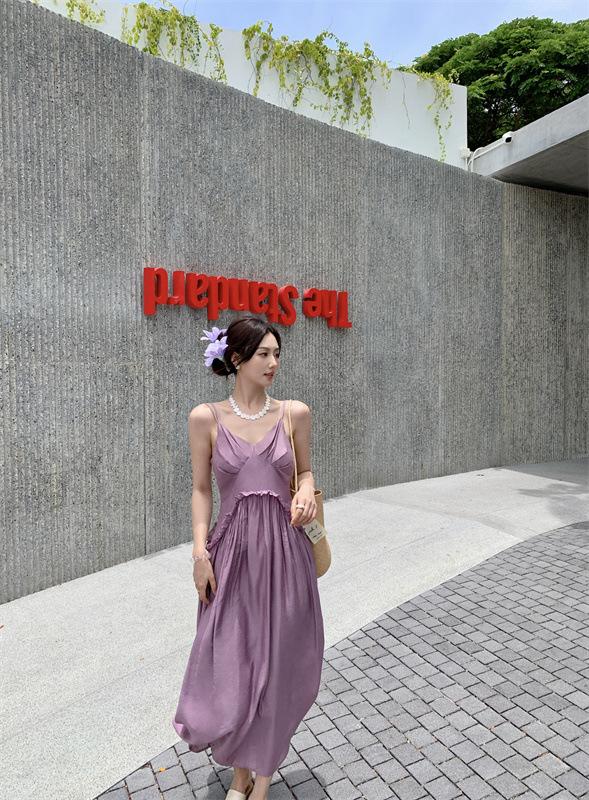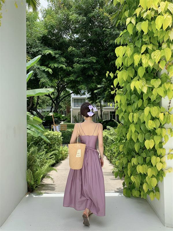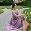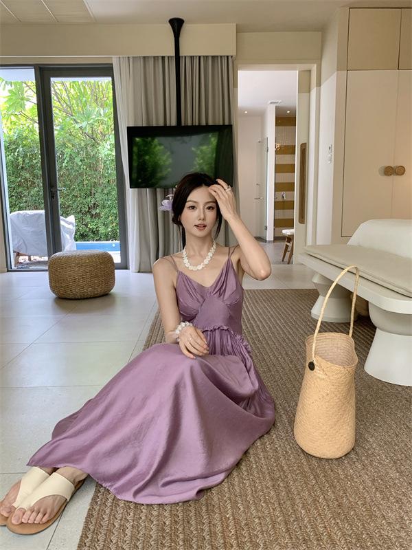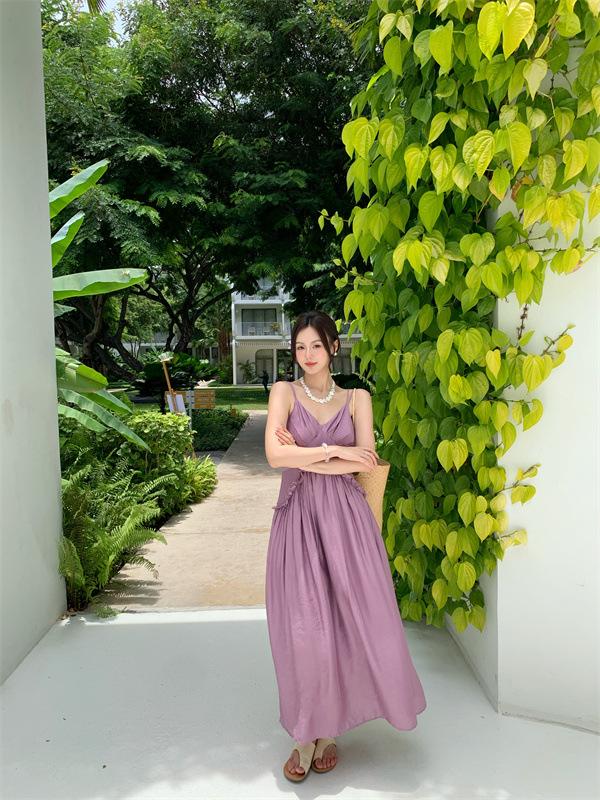 Hermoso Vestido Morado con Tirantes y Cuello en V para Vacaciones en la Playa, Falda Larga de Estilo Francés Súper Bonita para Mujer, Nuevo Estilo de Verano