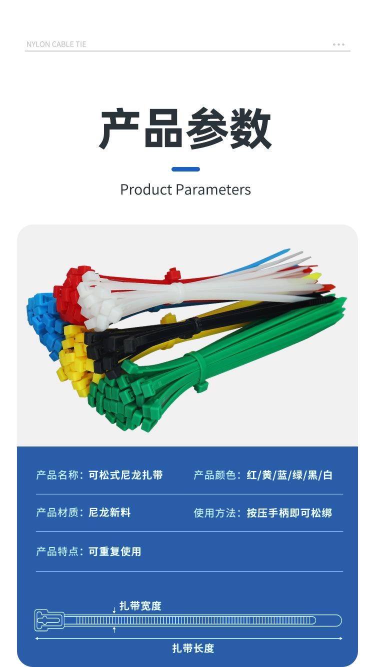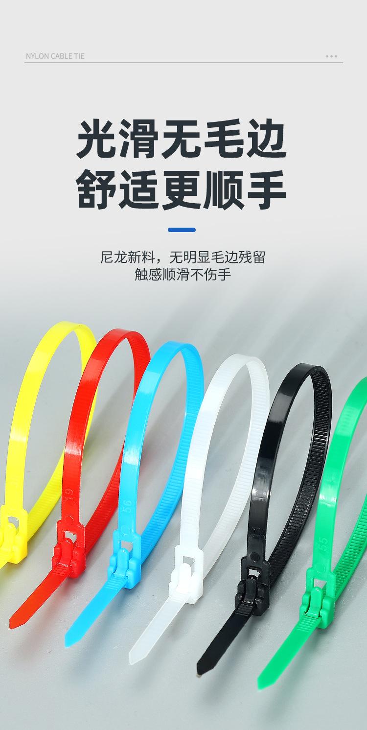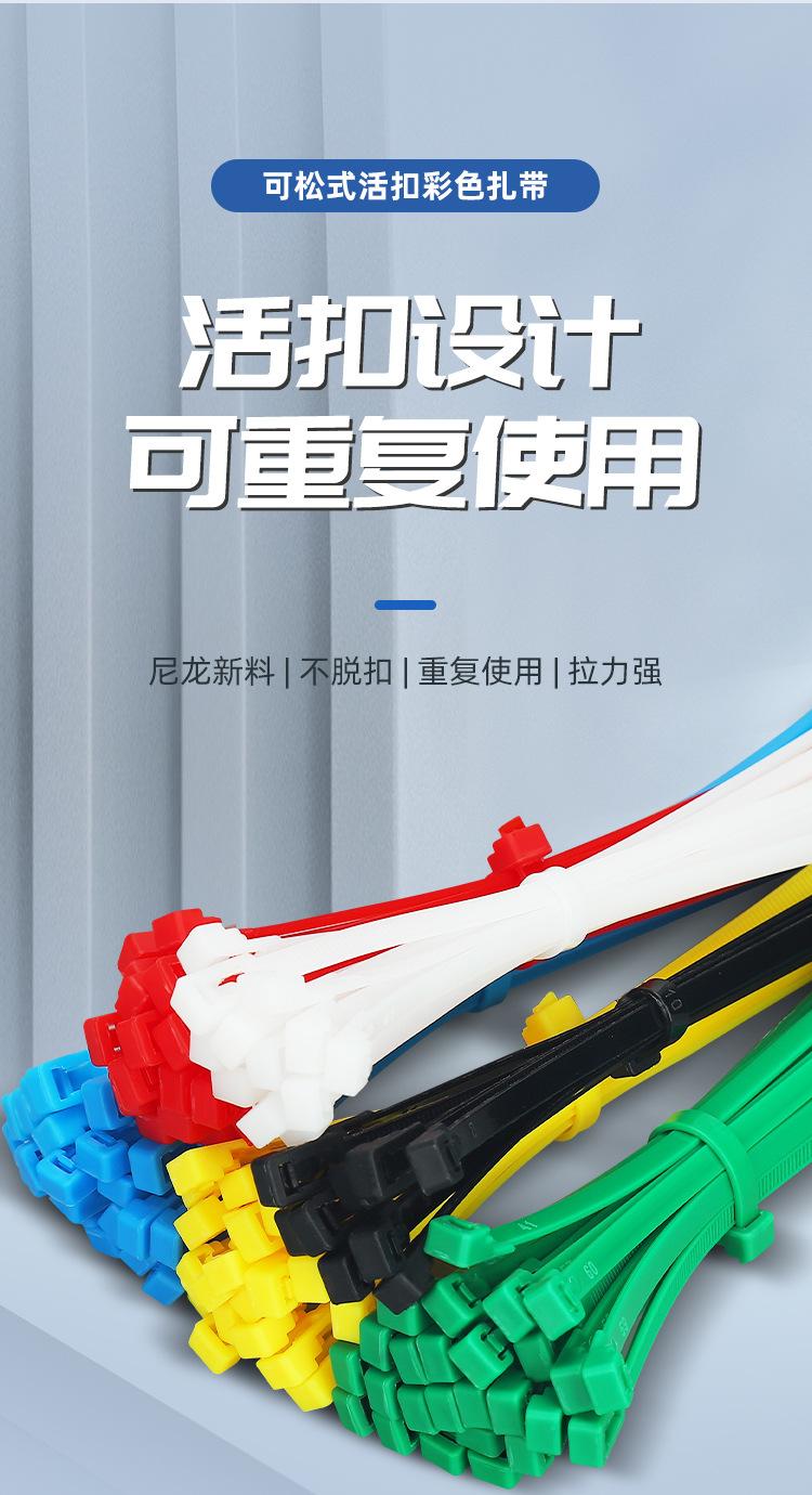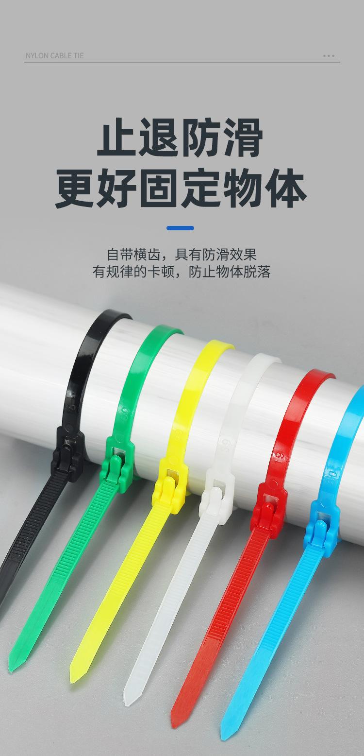 Brida de plástico con hebilla aflojable, color blanco y negro, reutilizable, con cierre fijo y desmontable.
