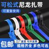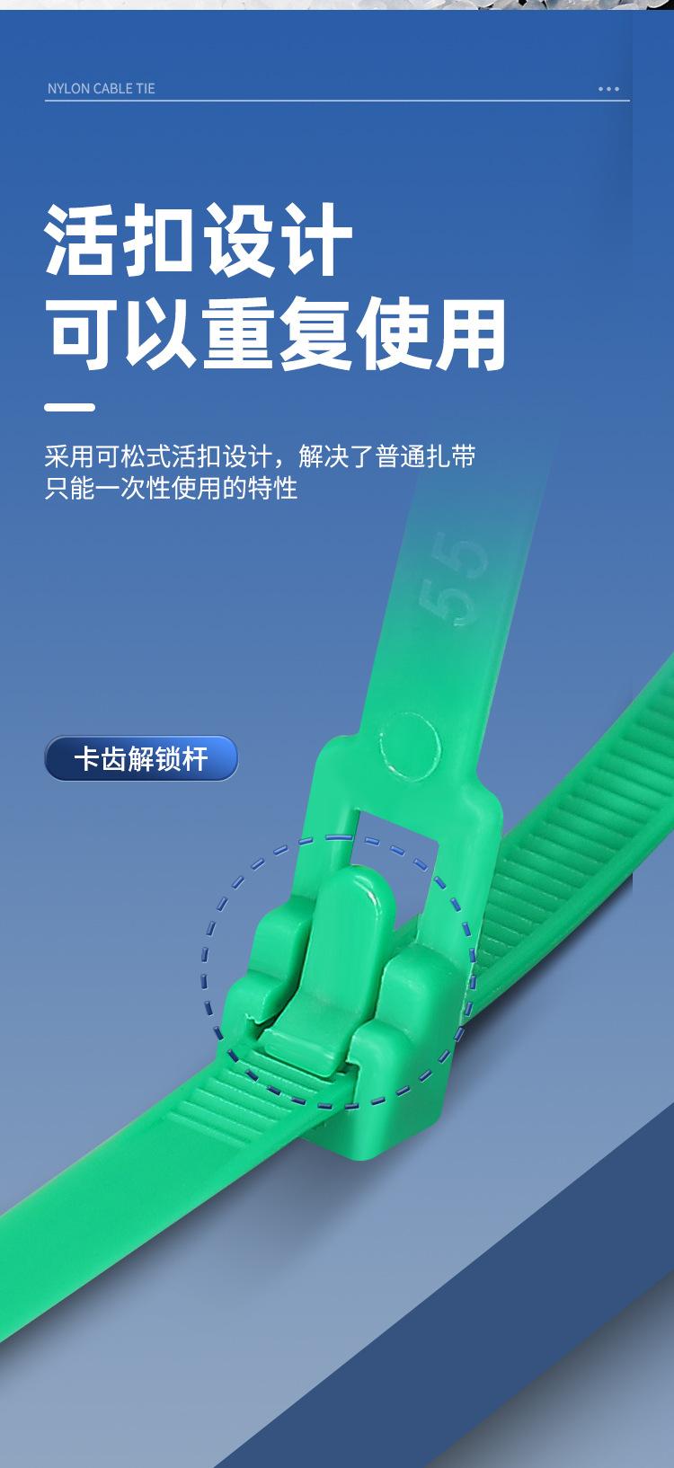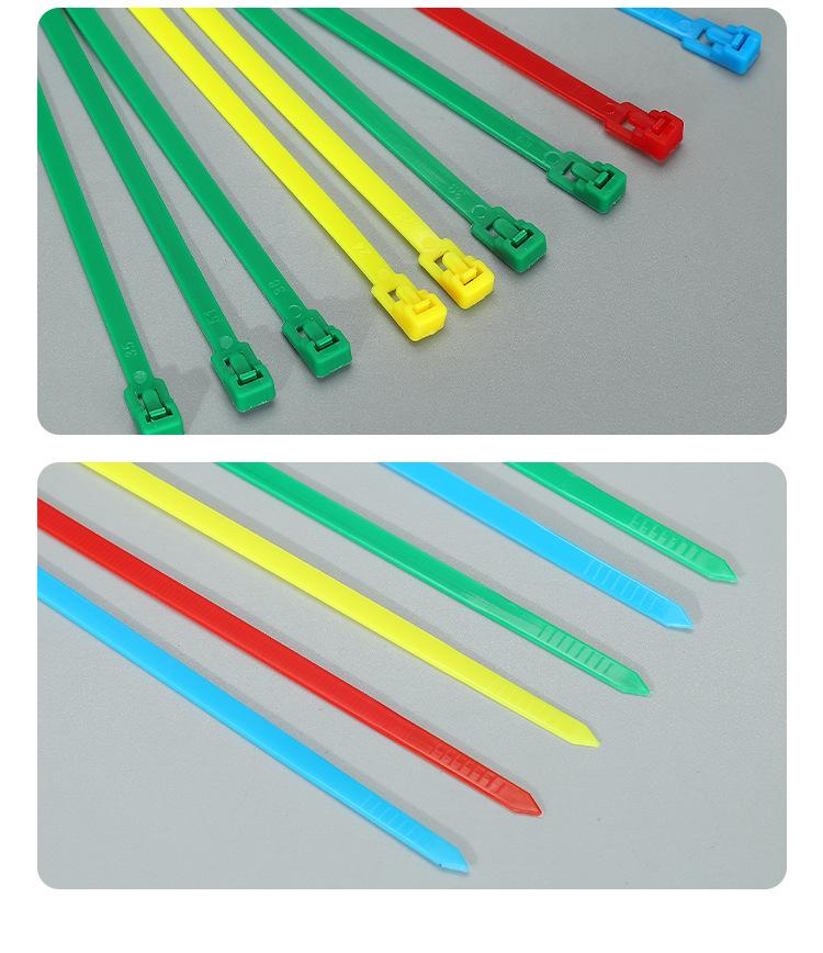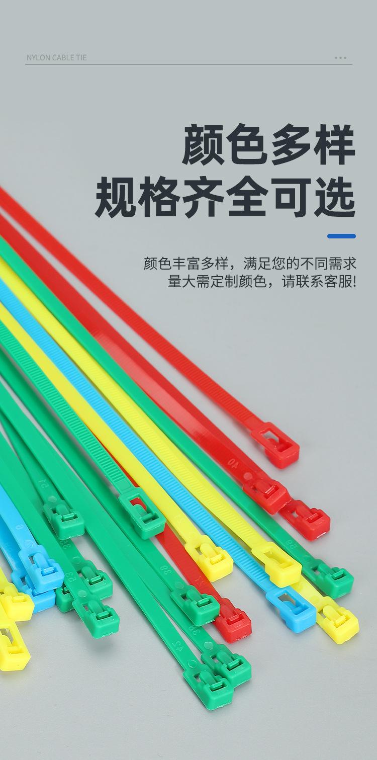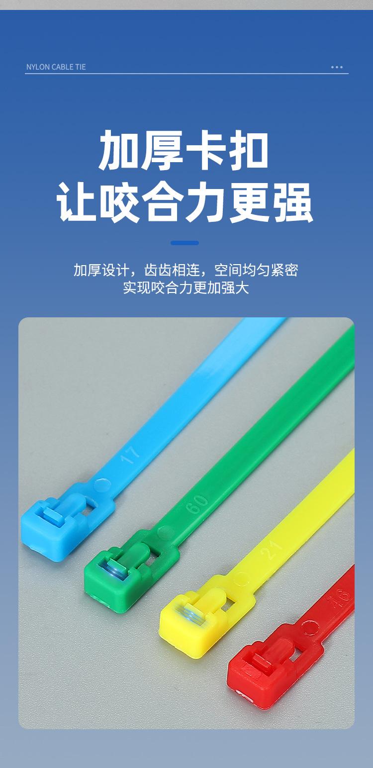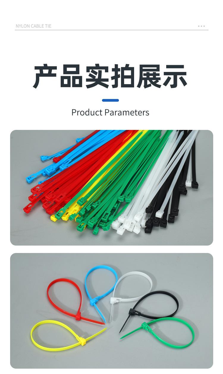 Brida de plástico con hebilla aflojable, color blanco y negro, reutilizable, con cierre fijo y desmontable.