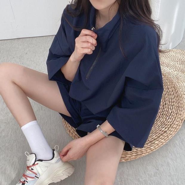 Conjunto deportivo informal de dos piezas para mujer, con cremallera, manga corta, cuello alto, estilo coreano, para verano, estilo nicho de moda