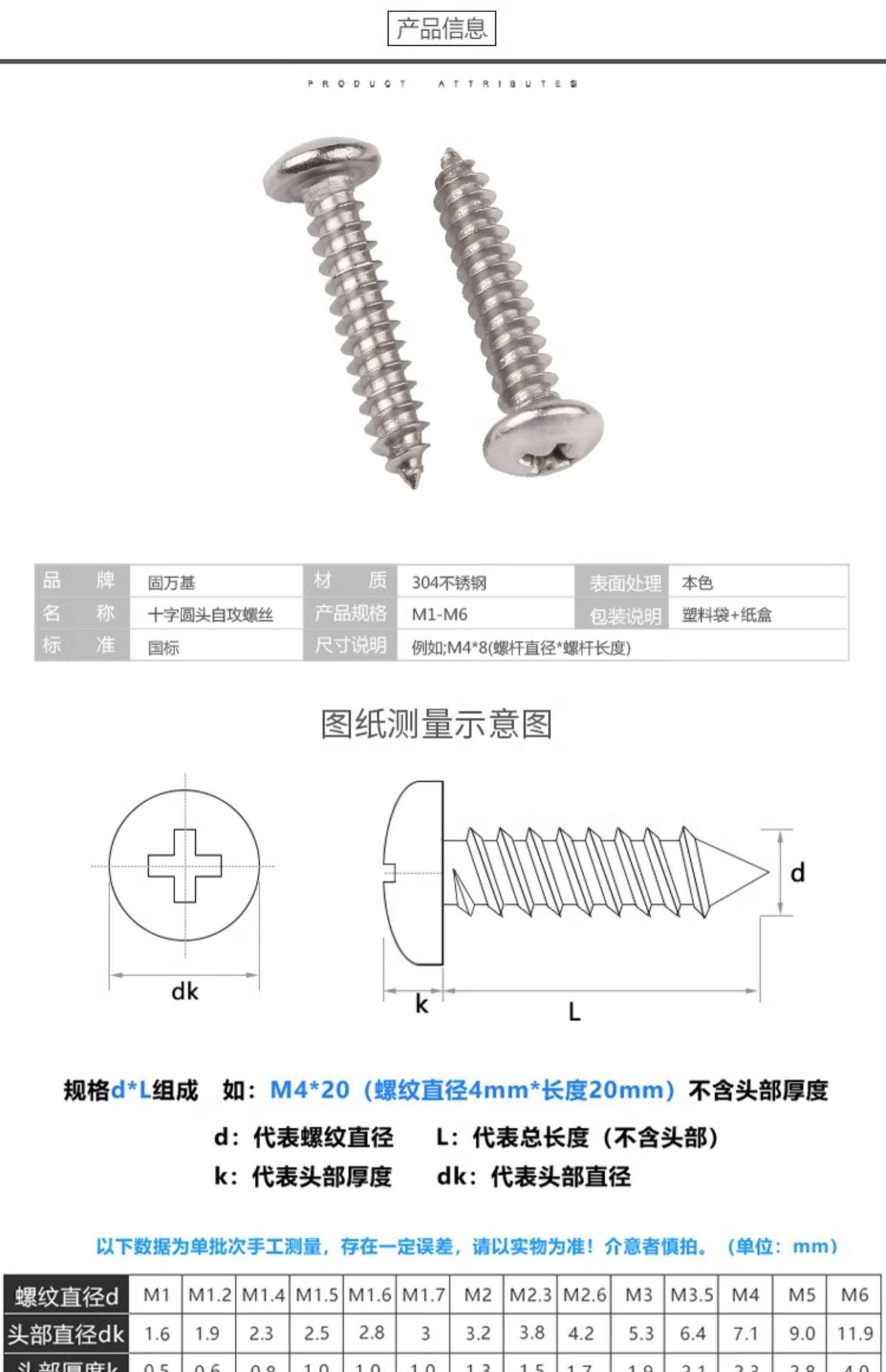 Tornillo de rosca de cabeza redonda cruzada de acero inoxidable 304, tornillo para madera con cabeza de disco M1/M1.2/M1.4M1.5/M2-m6