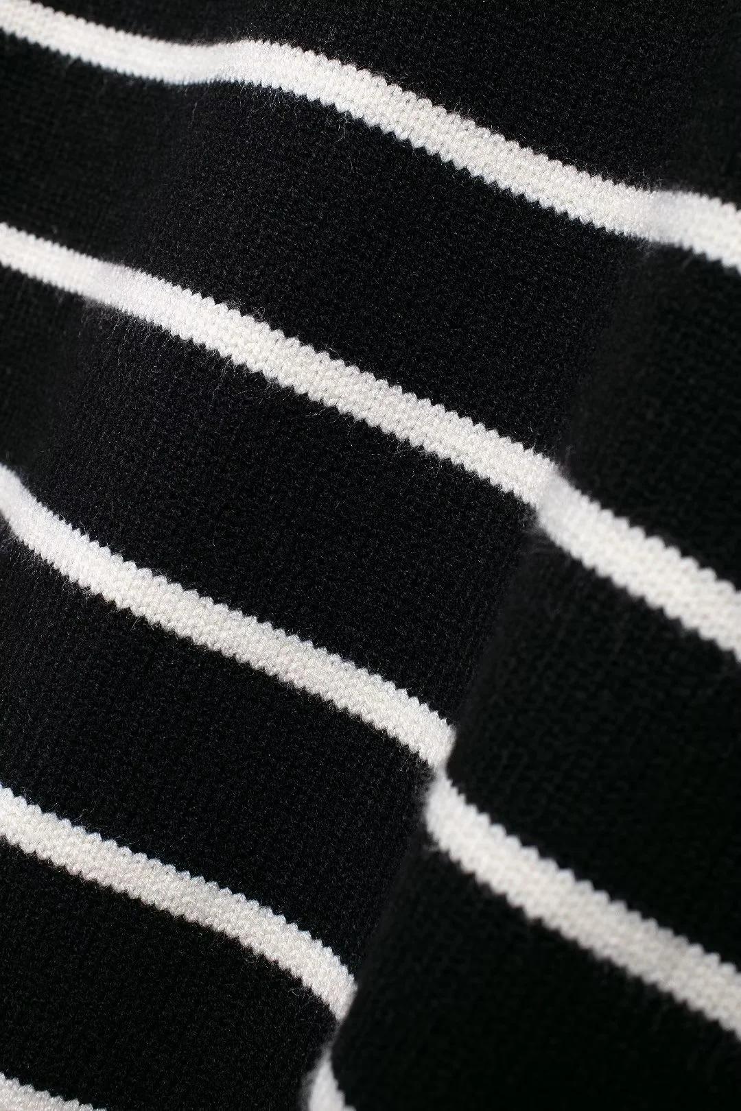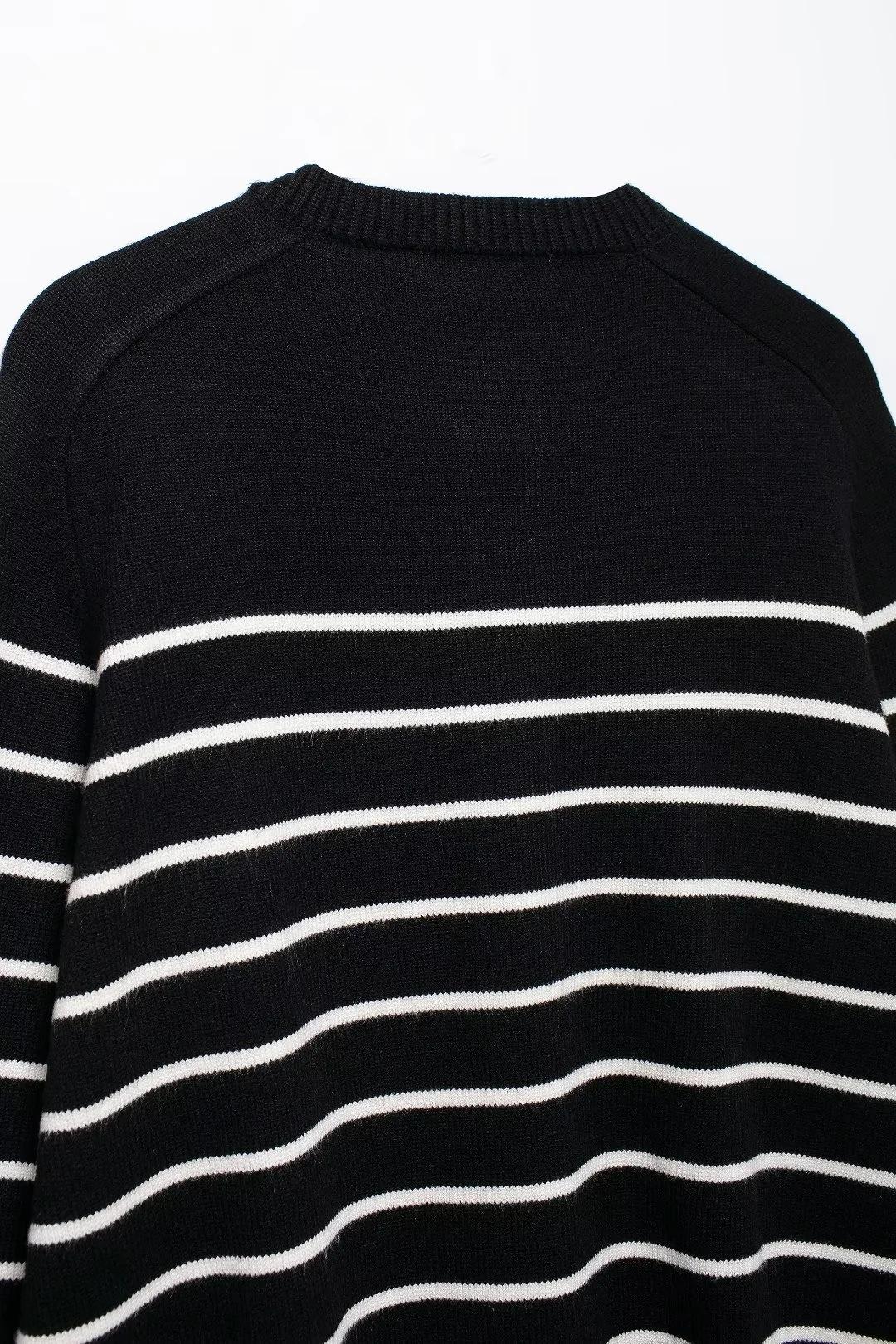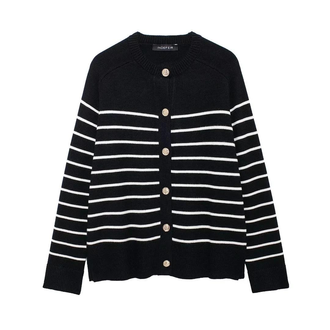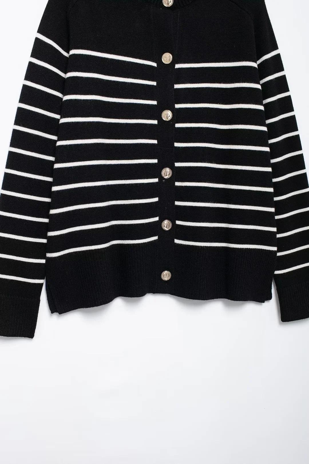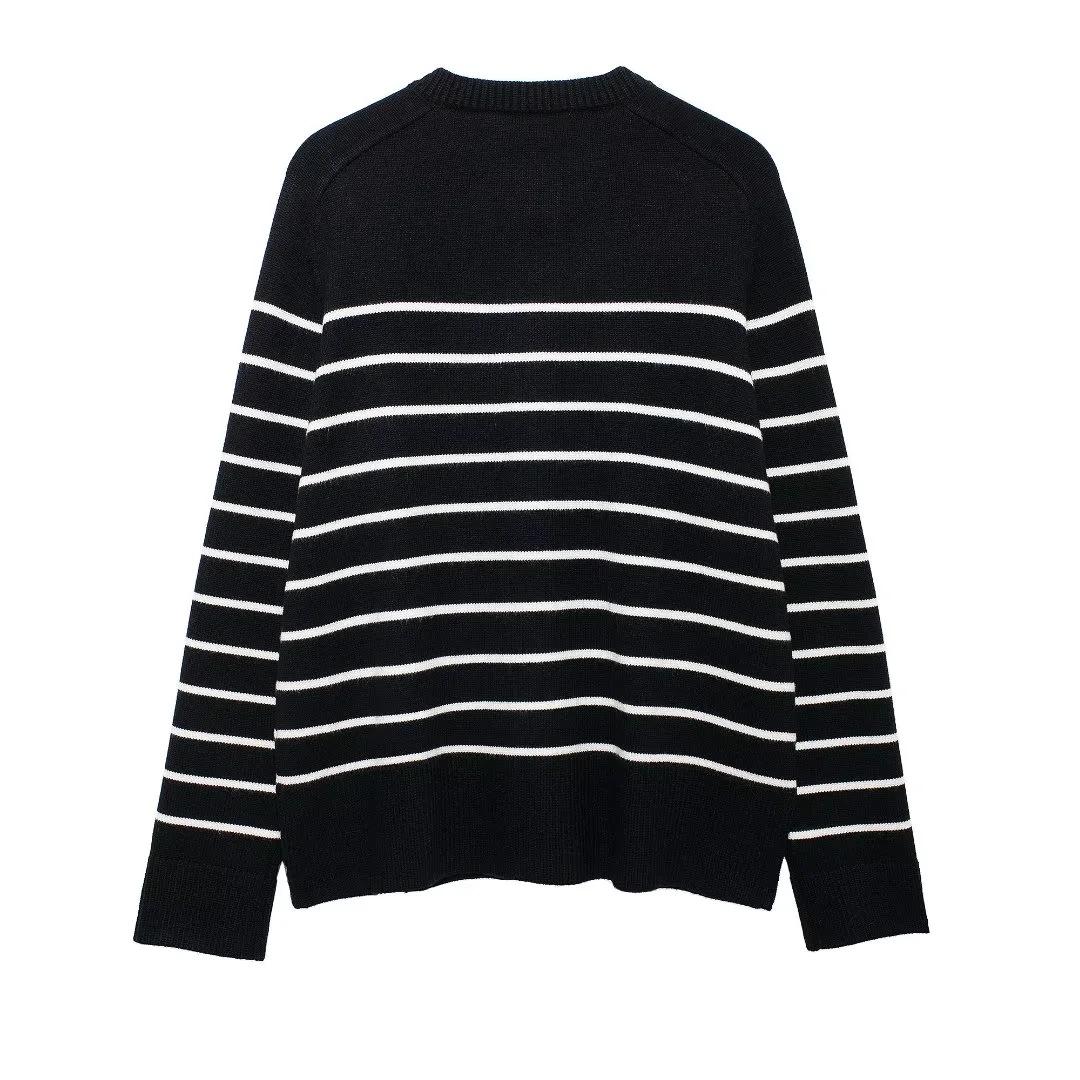 Chaqueta de punto holgada de manga larga con cuello redondo y rayas blancas y negras para mujer, estilo transfronterizo europeo y americano, otoño 2024