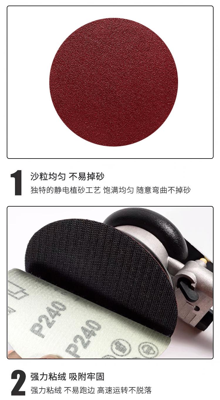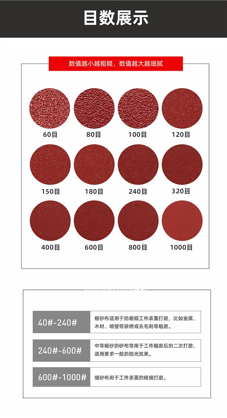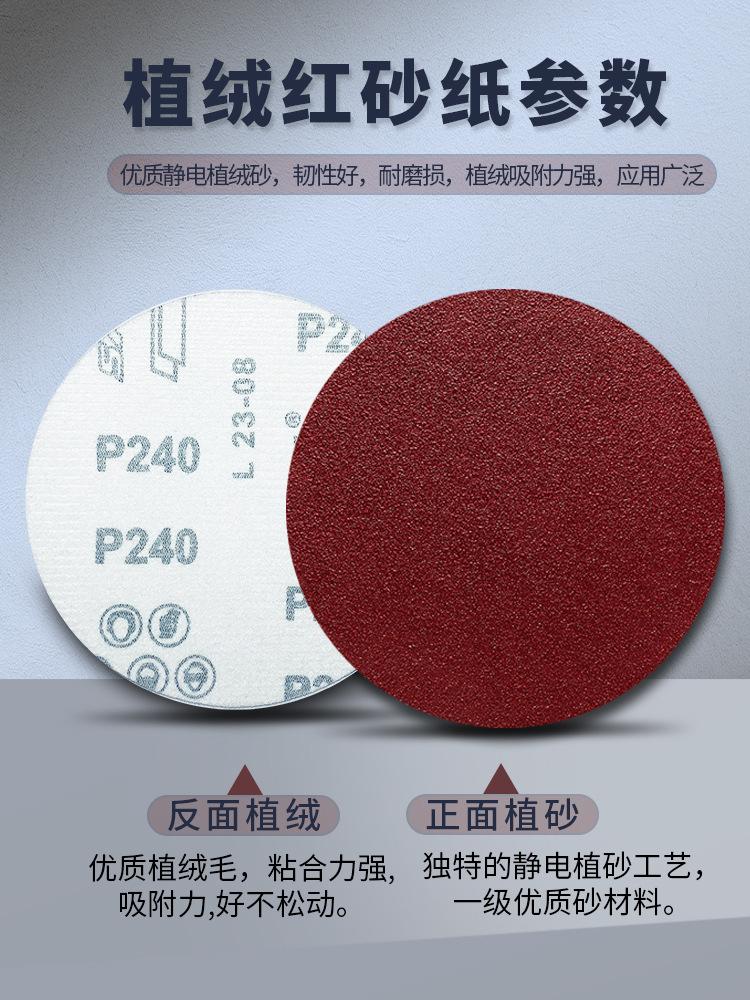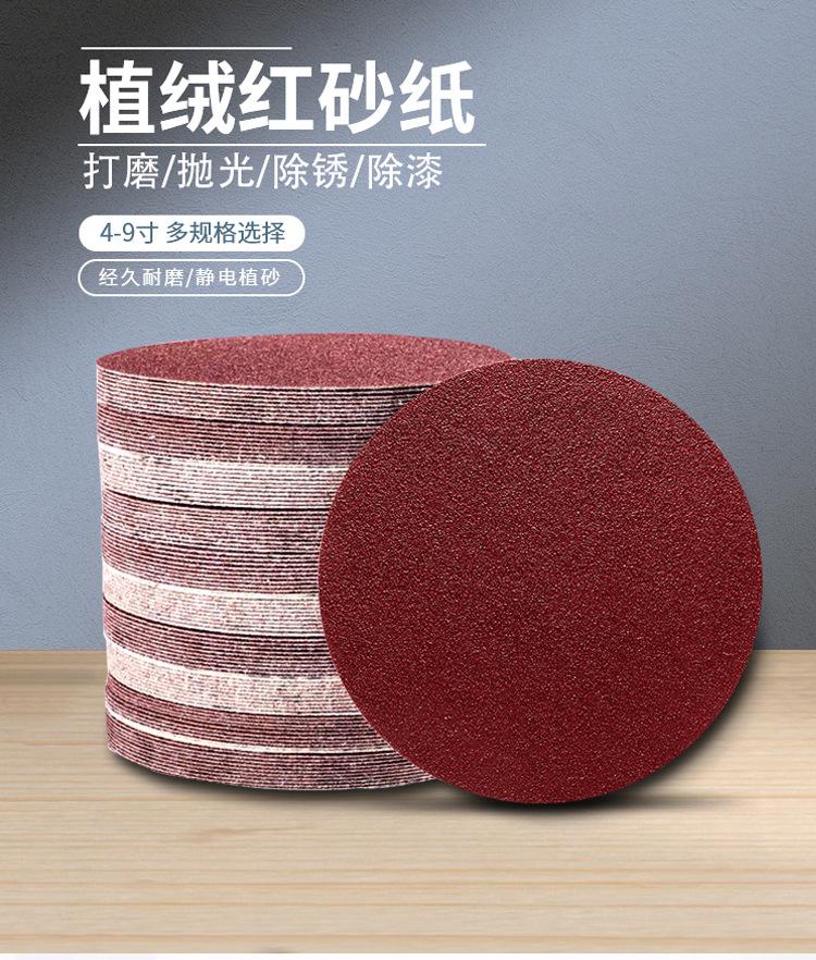 Papel de lija de flocado de arena roja de 5, 4, 7 y 9 pulgadas para amoladora de pared de carpintería, pulido, papel de lija autoadhesivo cepillado redondo