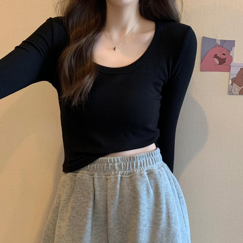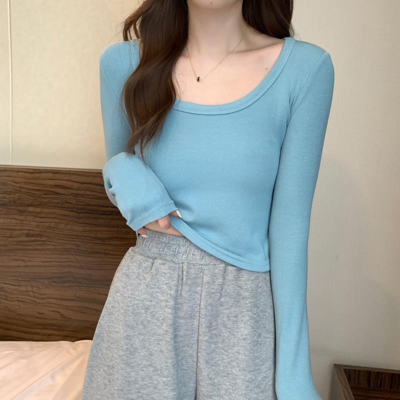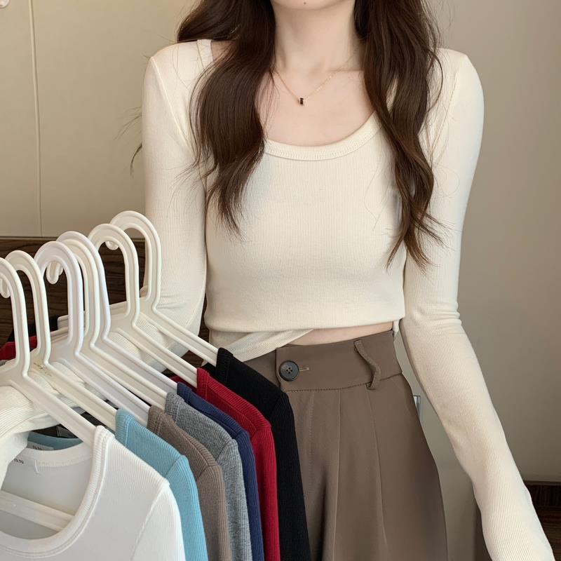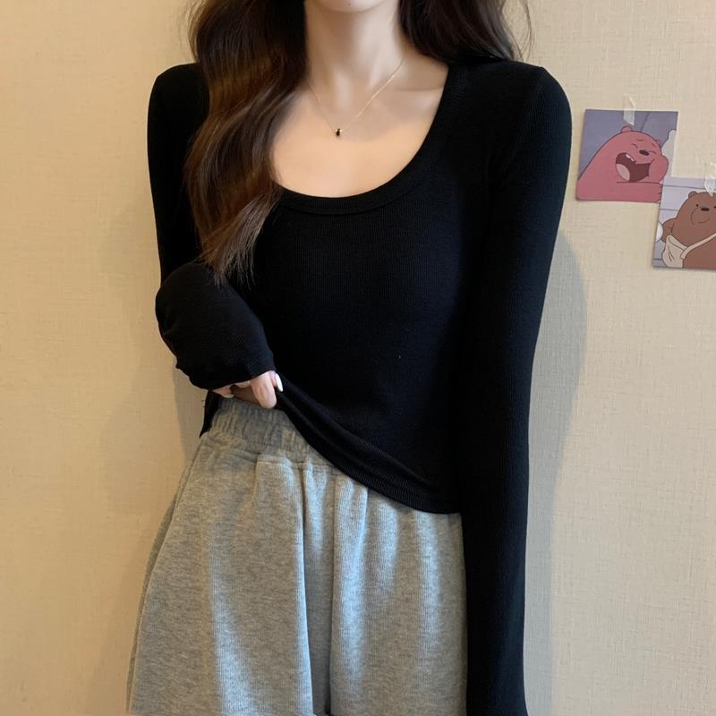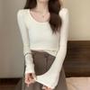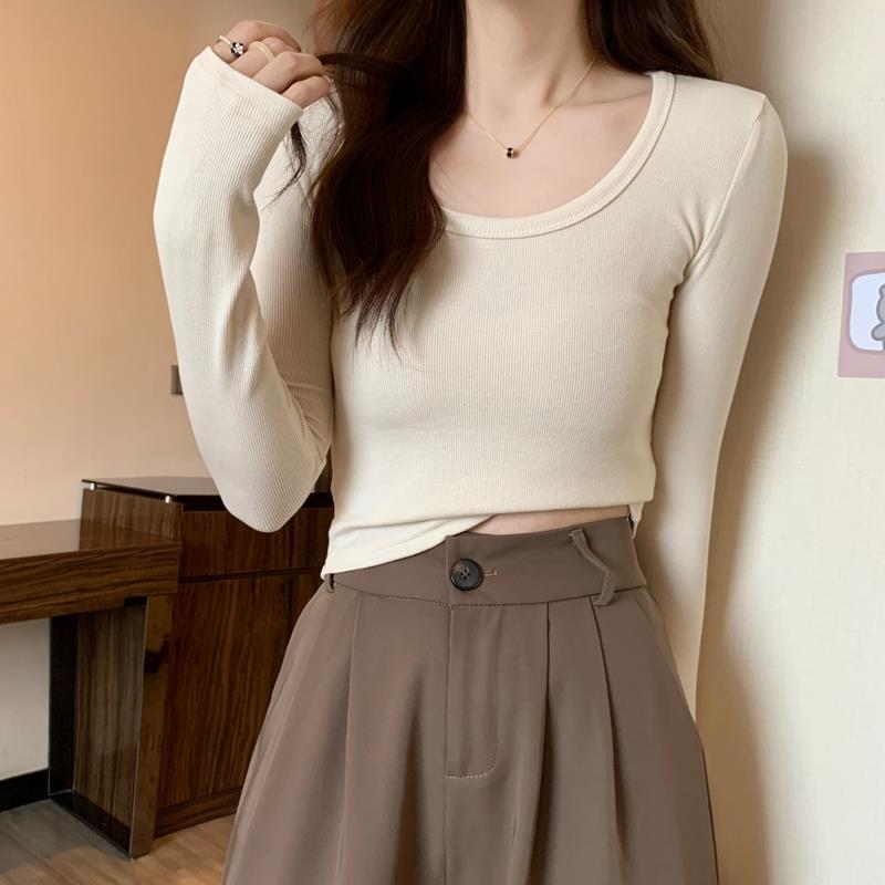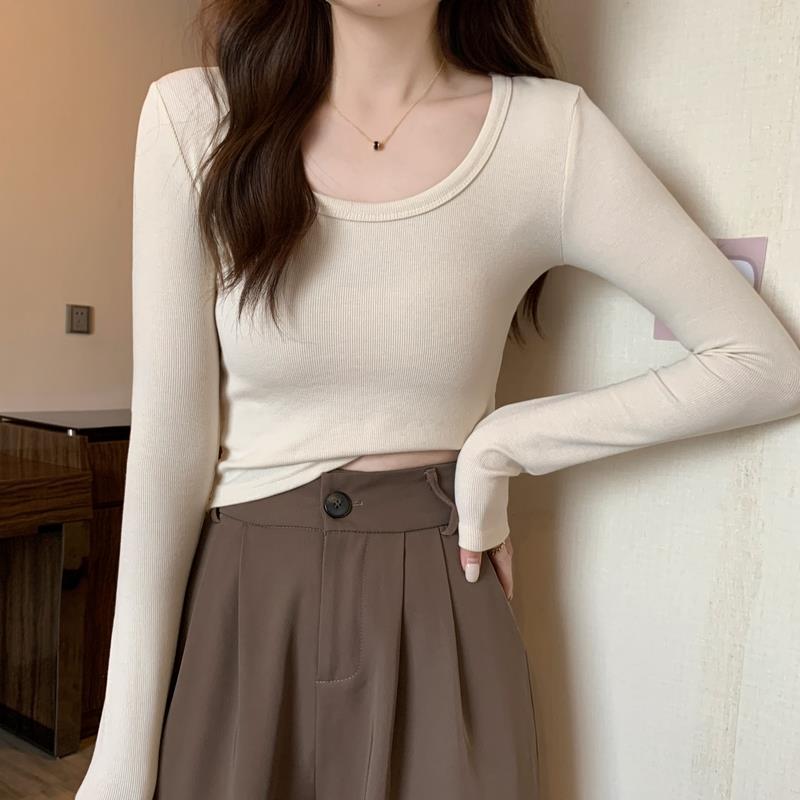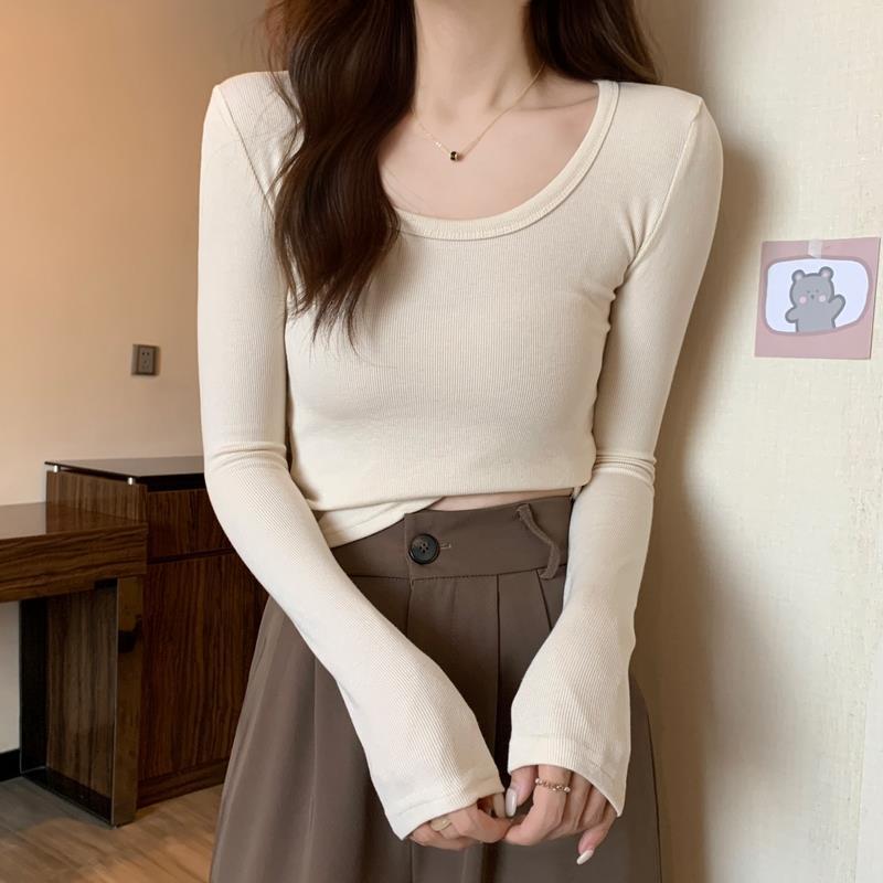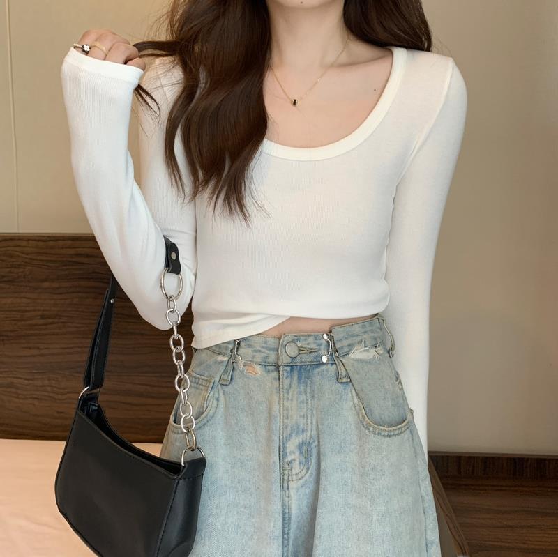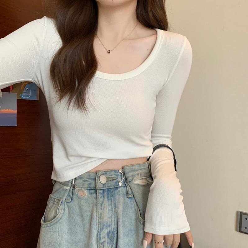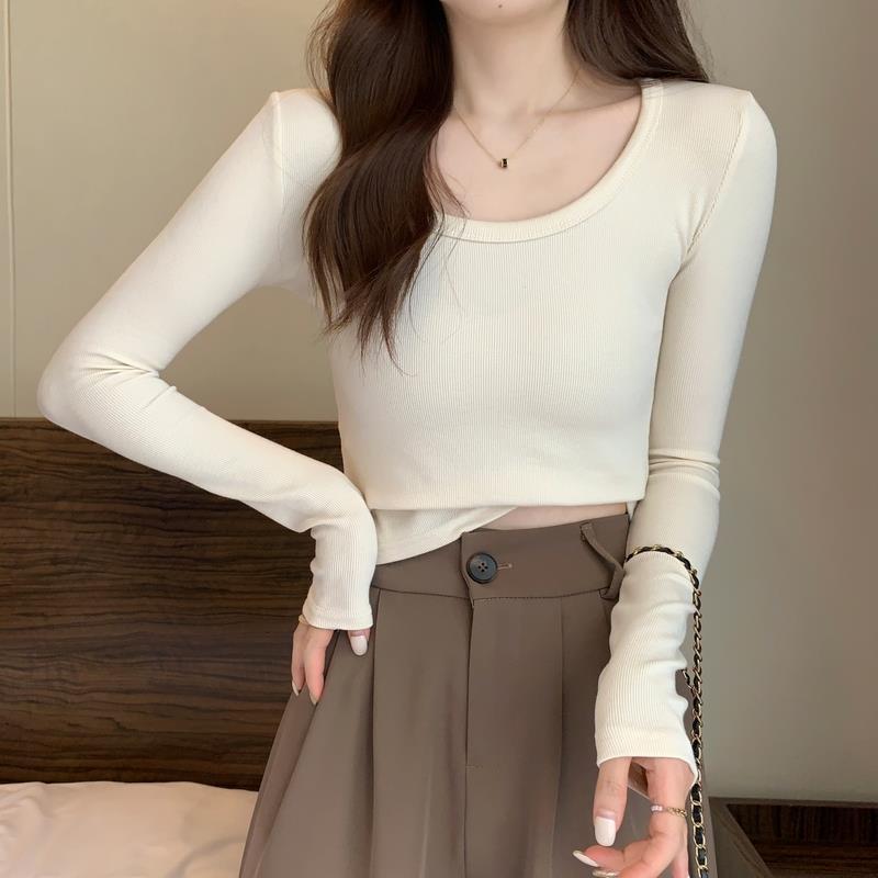 Camiseta blanca de manga larga para mujer, nueva camiseta de otoño, diseño de nicho, cuello en U, corte entallado, camiseta interior básica.