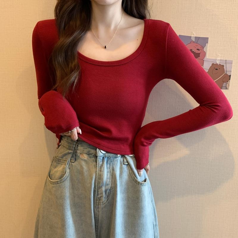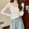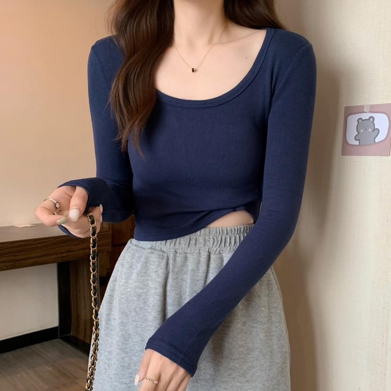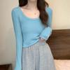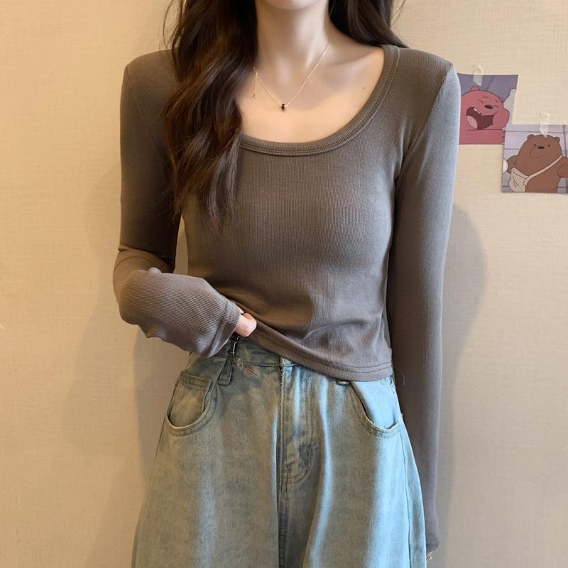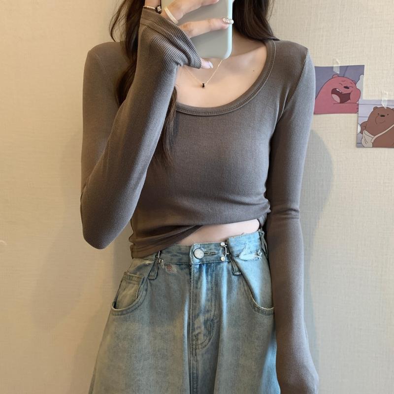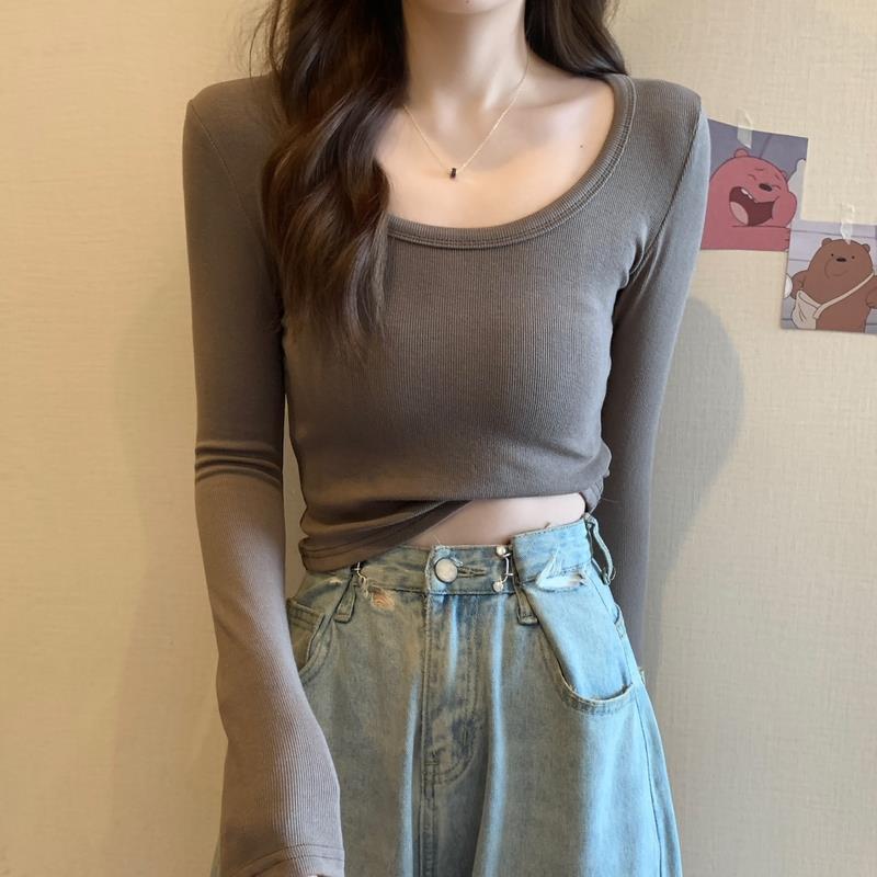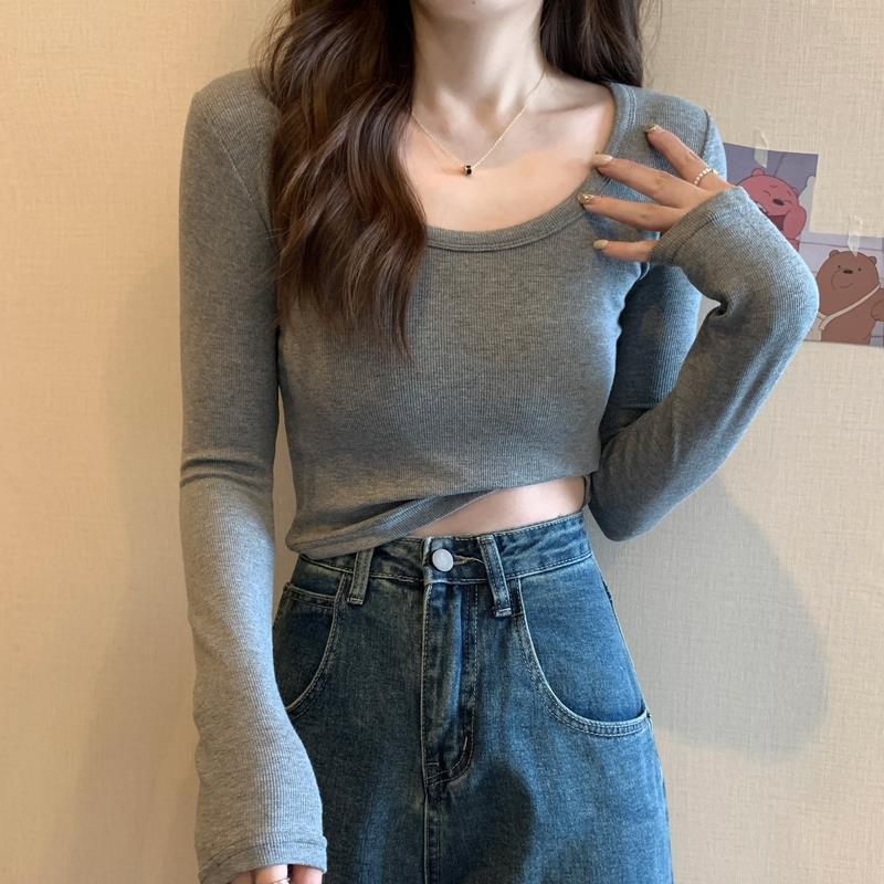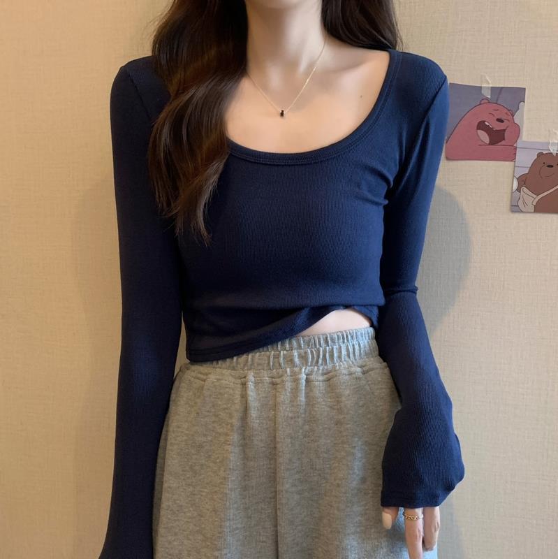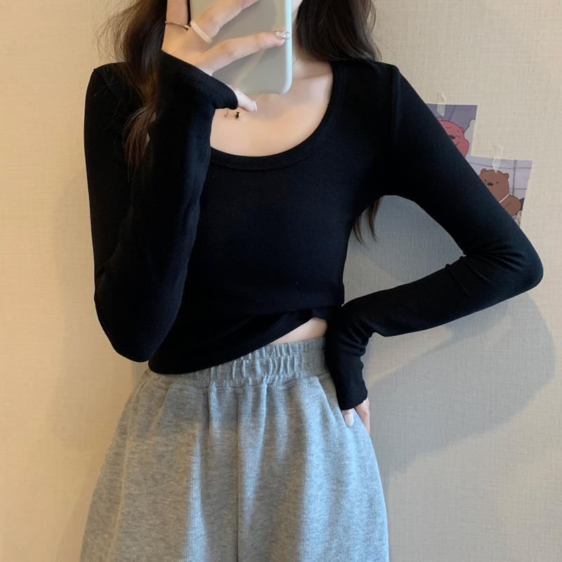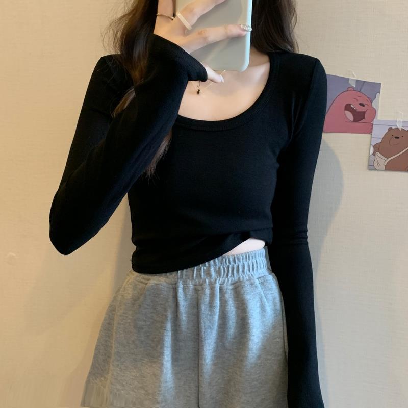 Camiseta blanca de manga larga para mujer, nueva camiseta de otoño, diseño de nicho, cuello en U, corte entallado, camiseta interior básica.