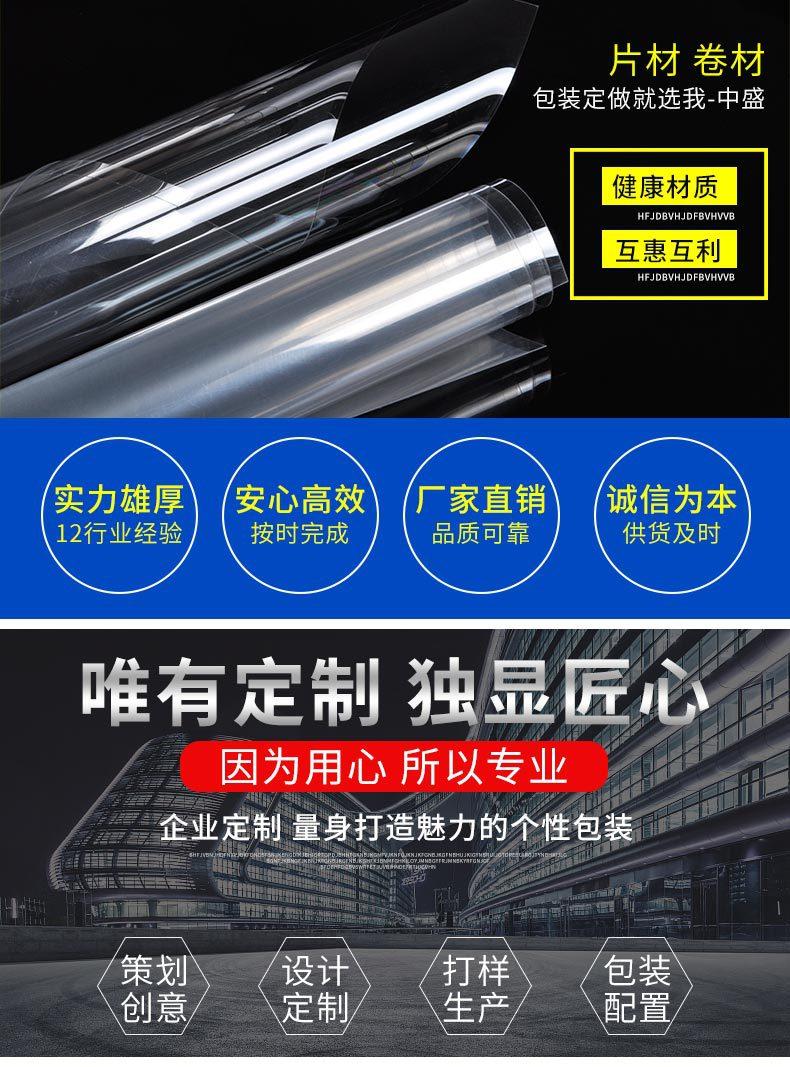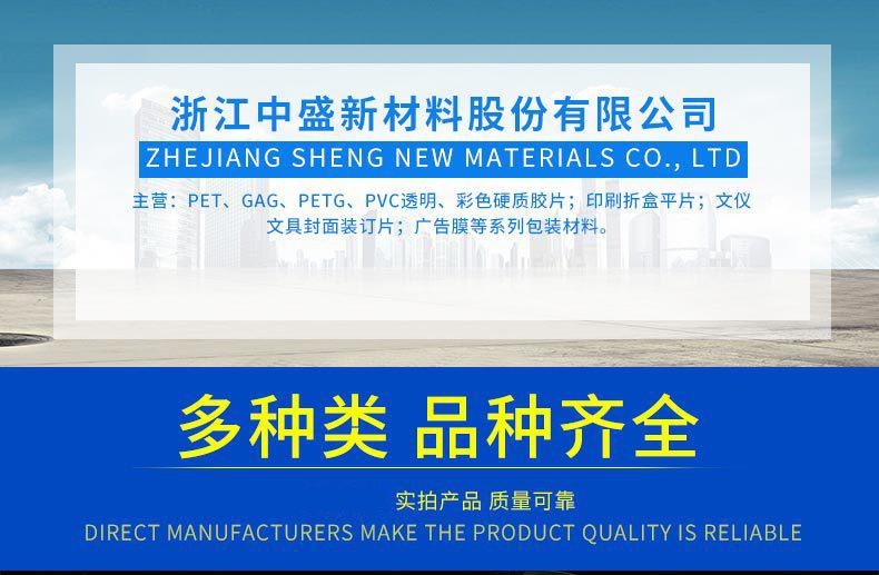 Zhejiang Zhongsheng New Materials Co., Ltd. es una empresa moderna de alta tecnología especializada en la producción de películas duras (PET, GAG, PETG, PVC). Sus principales productos incluyen películas duras transparentes y de color de PET, GAG, PETG, PVC; películas planas impresas para cajas plegables; películas para encuadernación de cubiertas de papelería; películas publicitarias y otros materiales de embalaje. Sus productos se utilizan ampliamente en la formación de blísteres al vacío, troquelado y estampado, impresión de superficies, embalaje de cajas plegables, decoración y publicidad de productos electrónicos, hardware y electrodomésticos, juguetes, papelería, ropa, artesanías, cosméticos, medicamentos, alimentos, decoración arquitectónica, publicidad y otros productos. Sus productos presentan alta transparencia, ausencia de puntos cristalinos, ausencia de líneas de flujo, fuerte resistencia al impacto, colores brillantes, resistencia química, fácil procesamiento, gran tenacidad al plegado, ausencia de blanqueamiento, entre otras características, además de ser refrescantes, buen aplanamiento de impresión y resistencia a la flexión.