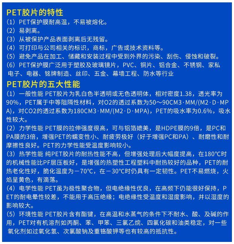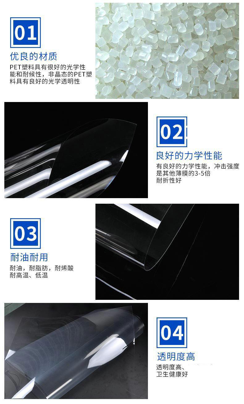 1. Características de la lámina de PET (poliéster): Es un producto plástico termoplástico, inodoro después de la combustión. Alta transparencia, sin ondulaciones de agua en la superficie, sin puntos cristalinos, sin dirección y sin doblez blanco; fuerte resistencia al aceite y la grasa y a los productos químicos; fuerte tenacidad y rigidez, buena resistencia al impacto (buena resistencia al impacto a baja temperatura, aproximadamente 20 veces mayor que el PVC). La gravedad específica es 1.34.