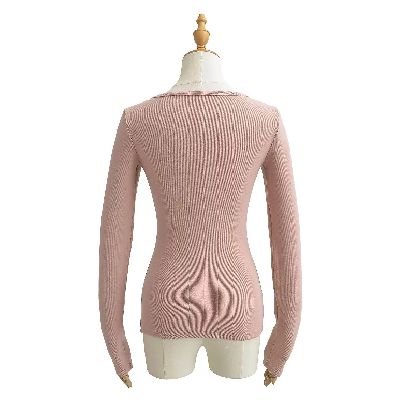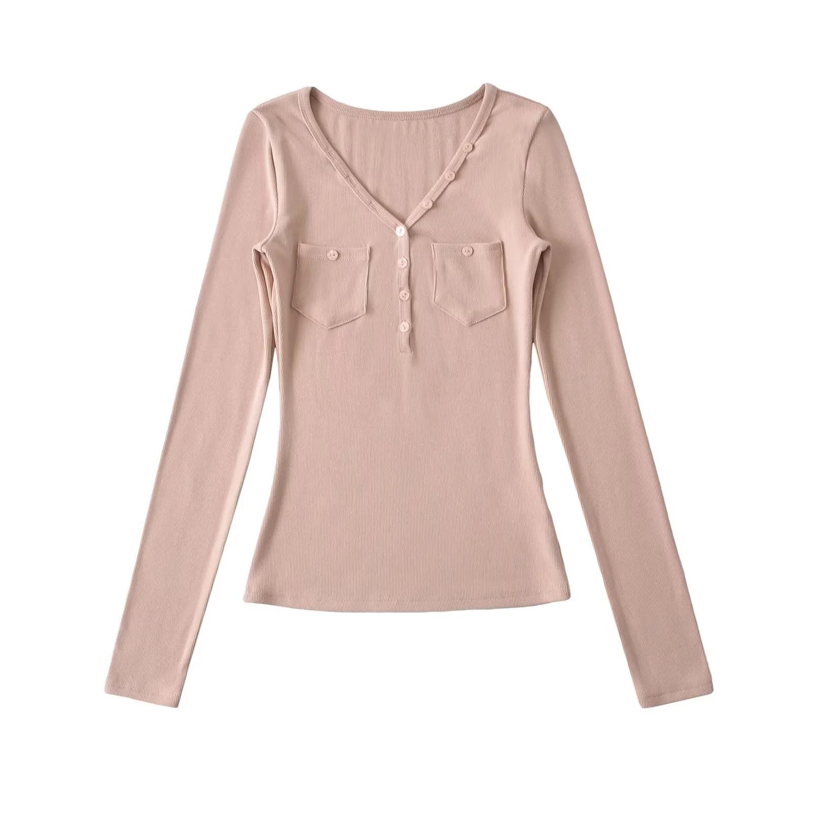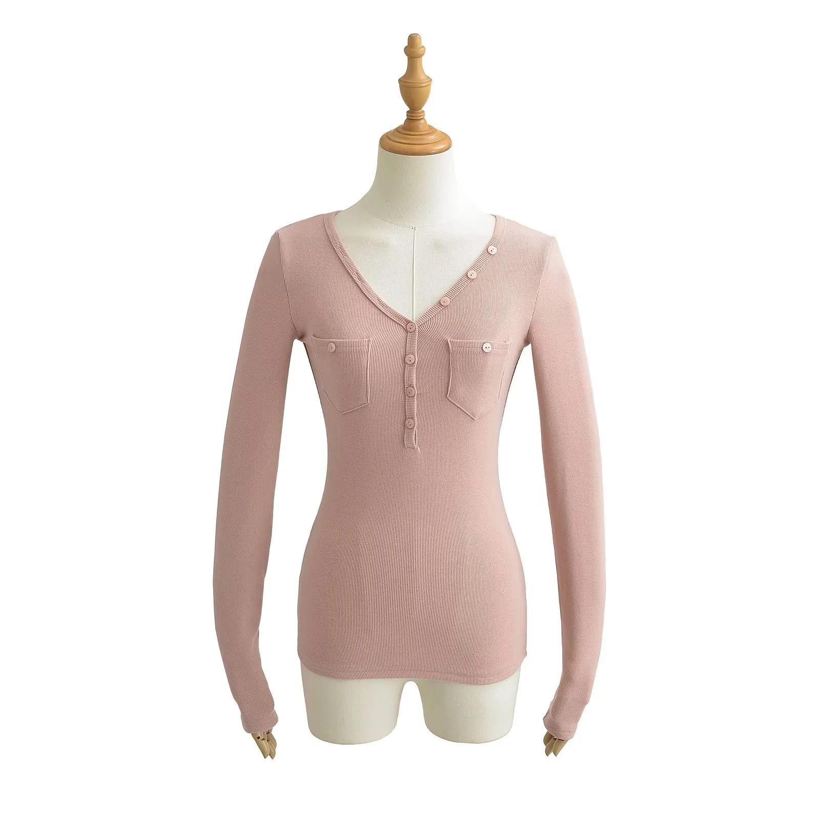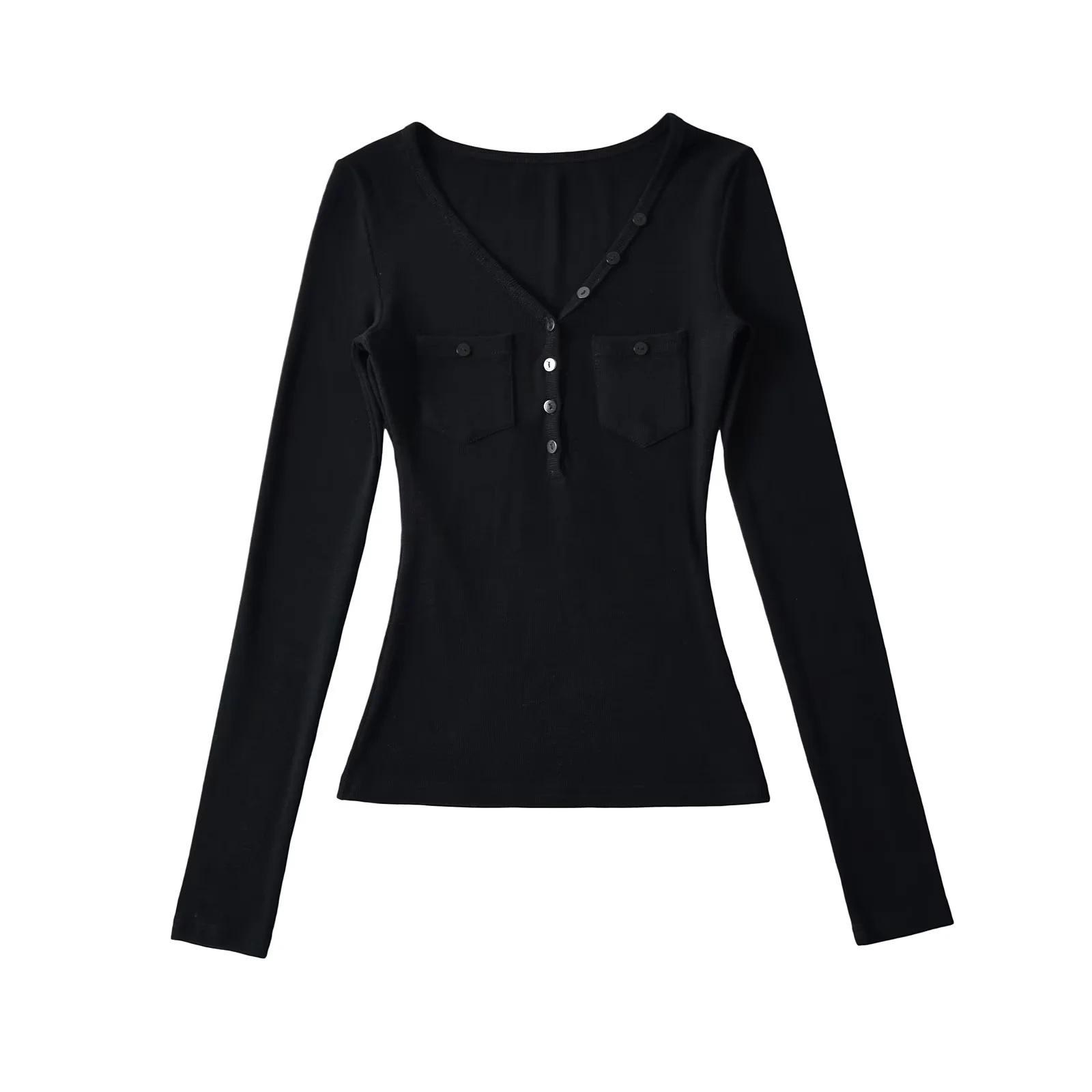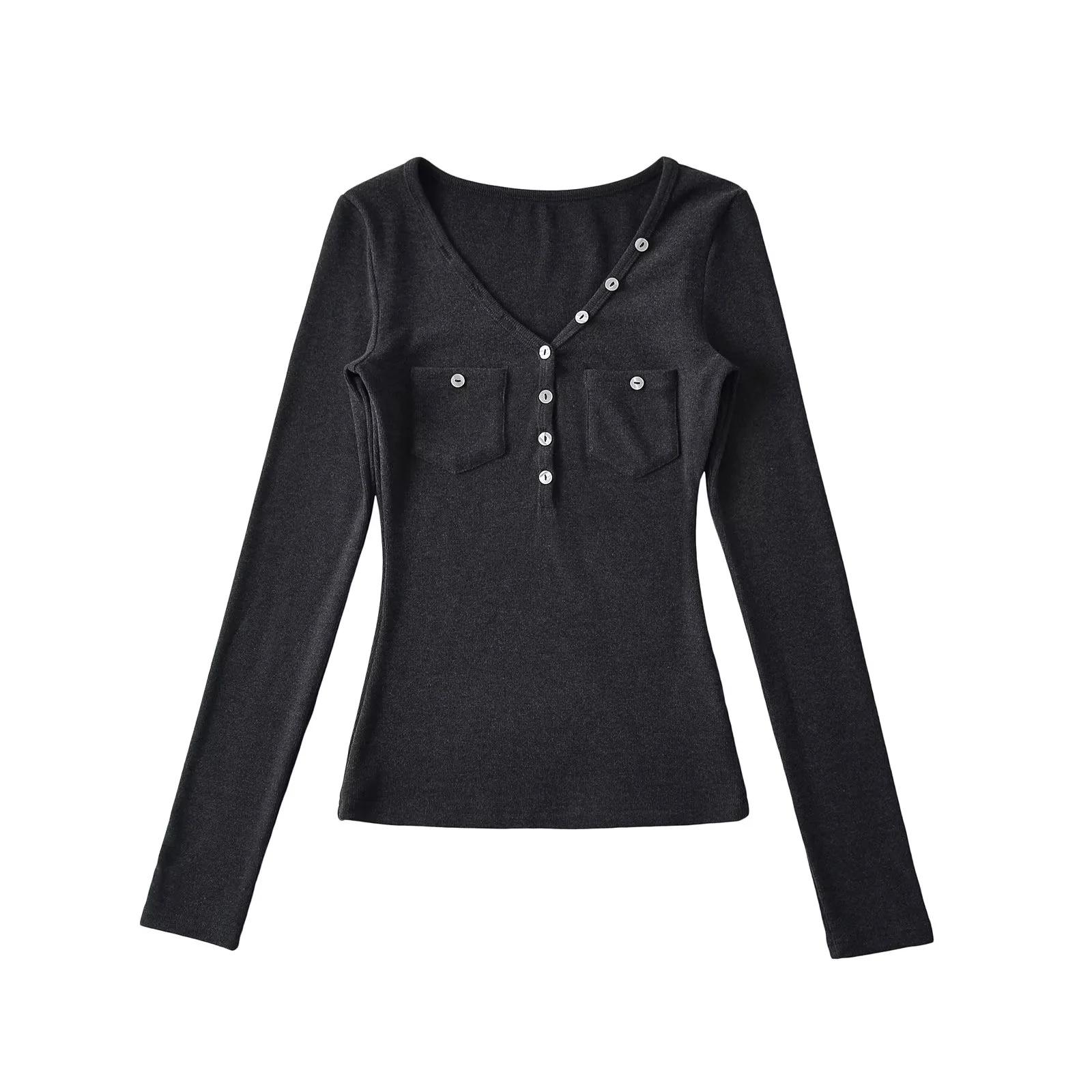 Camisa de punto con base decorativa y bolsillo Spice Girl para mujer, otoño 2024, cuello grande, manga larga interior