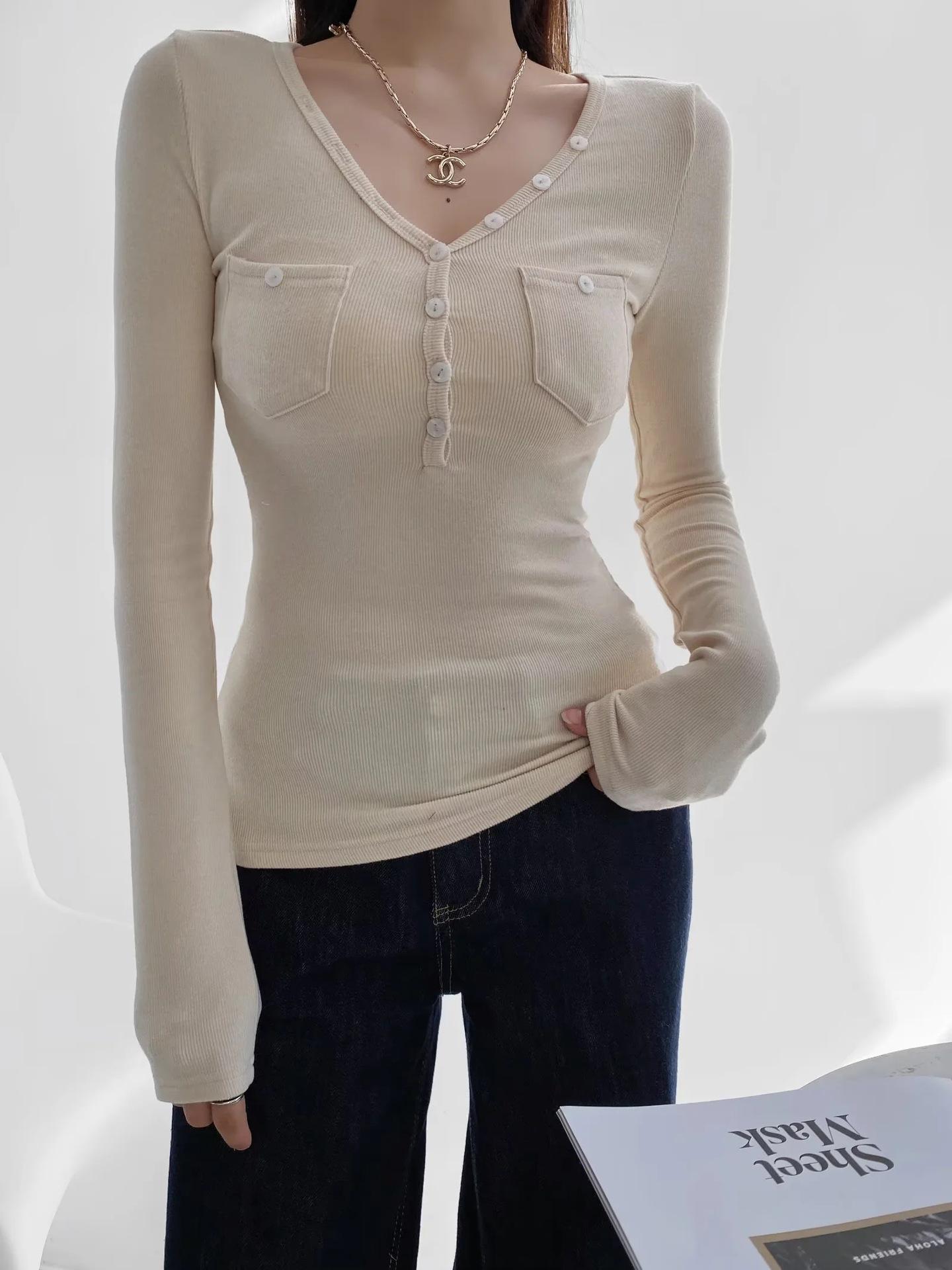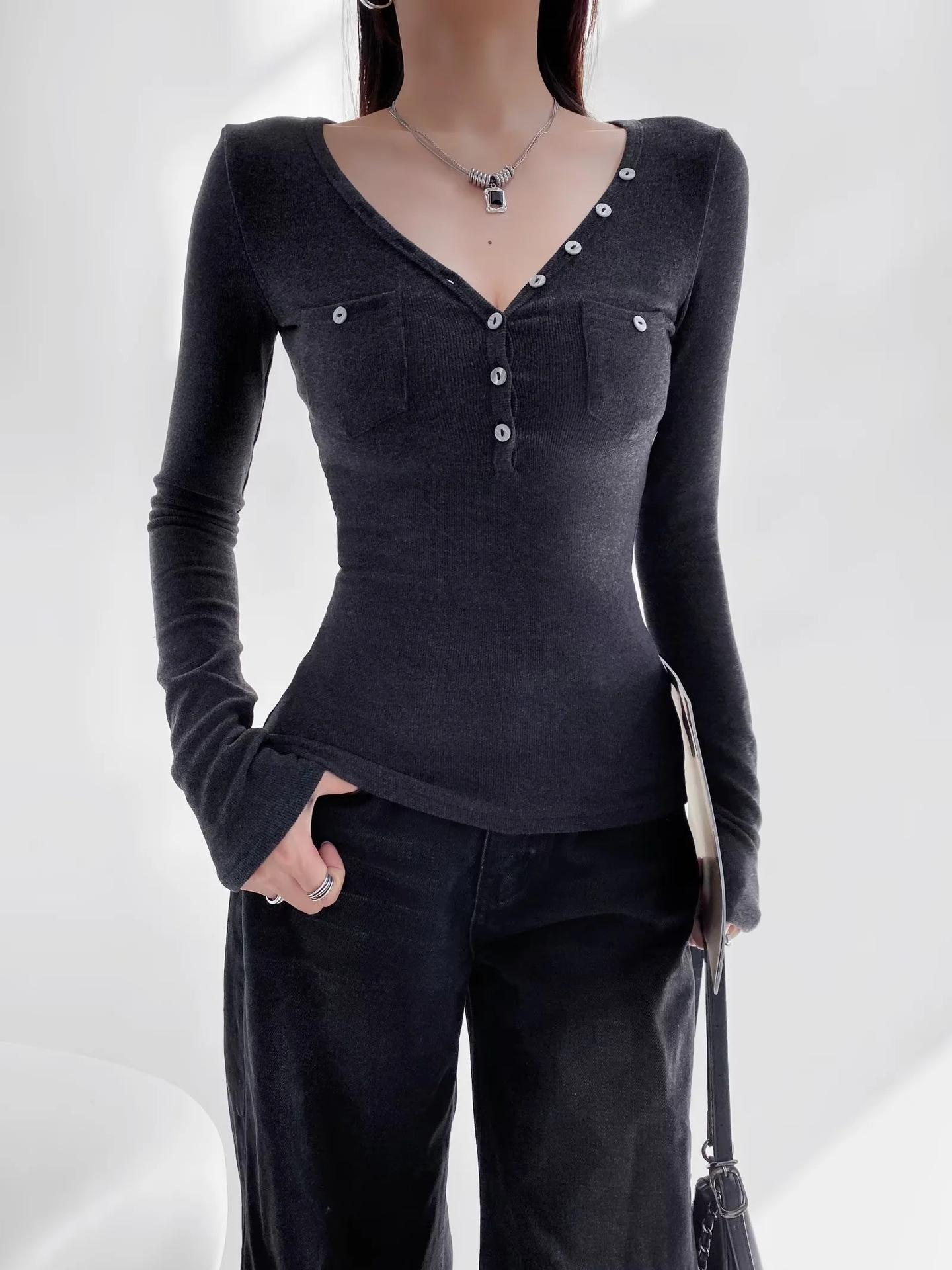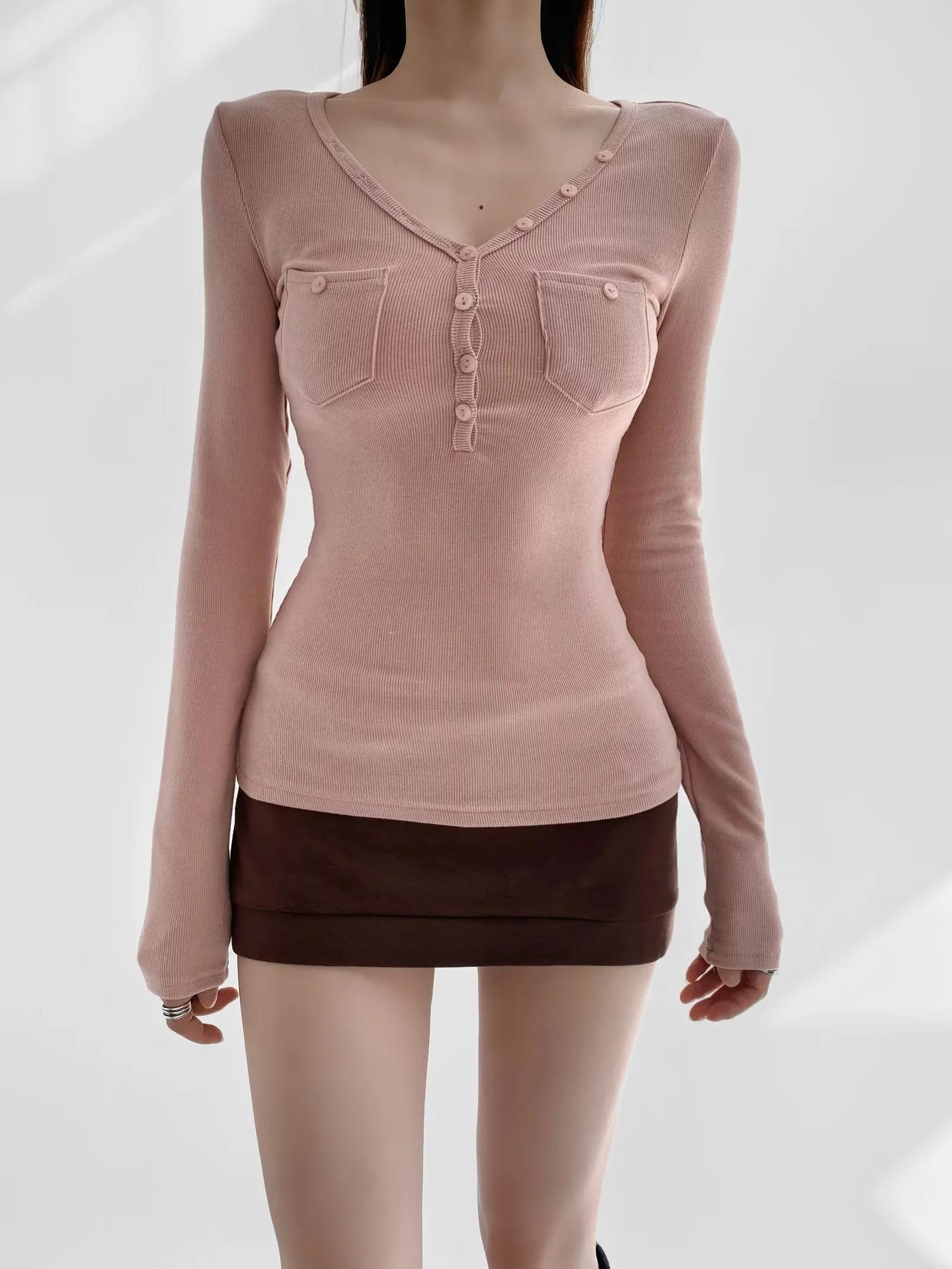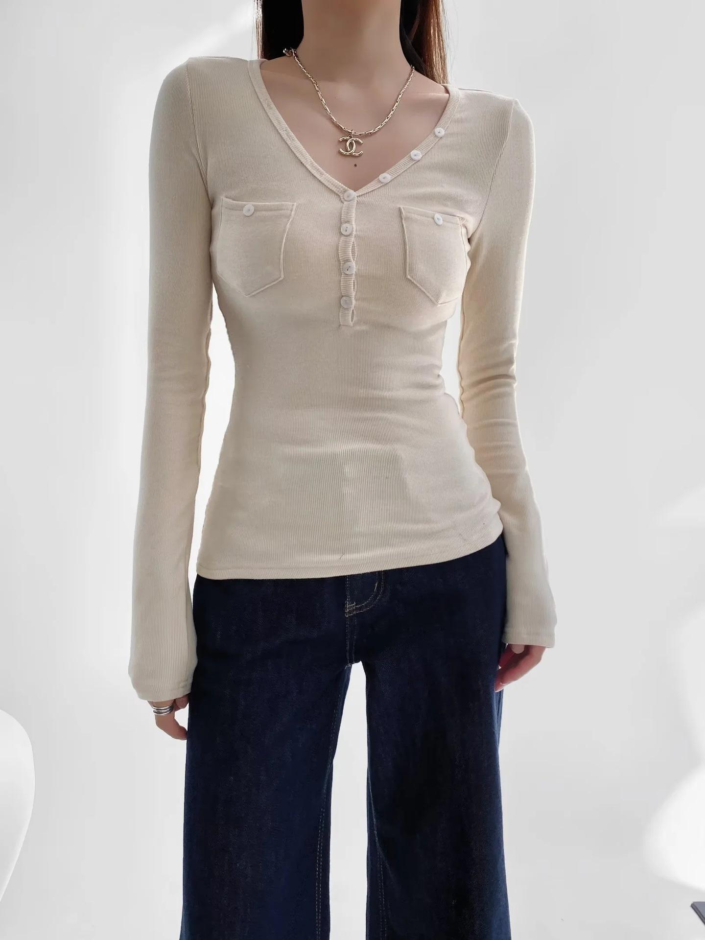 Camisa de punto con base decorativa y bolsillo Spice Girl para mujer, otoño 2024, cuello grande, manga larga interior