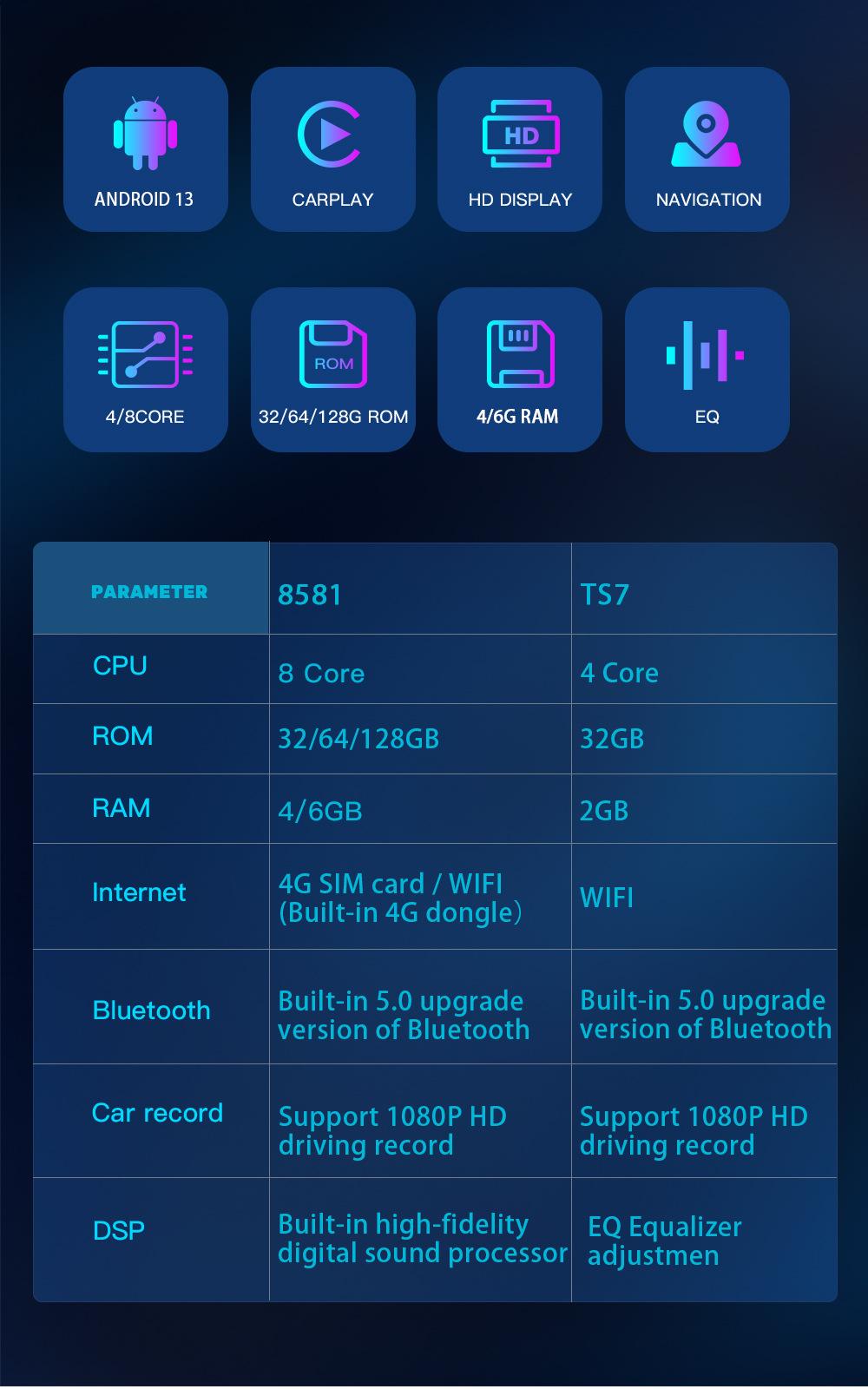 8227 chip 4-core wifi+bluetooth 2g+32g fm+rds asp+16eq, 8257 chip 8-core wifi+bluetooth 4g+64g fm+am+rds dsp+3...