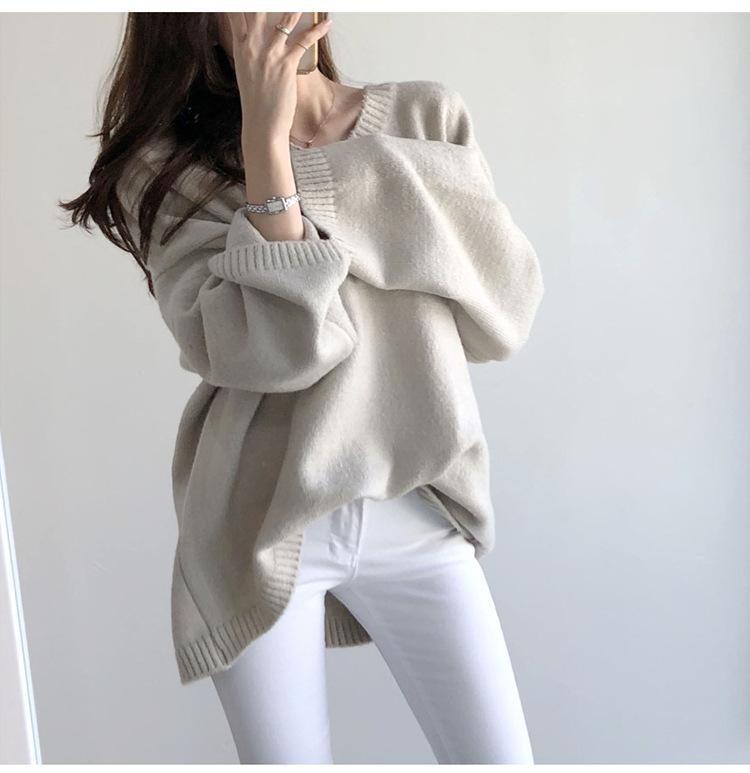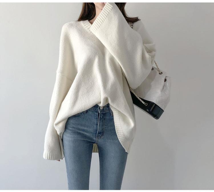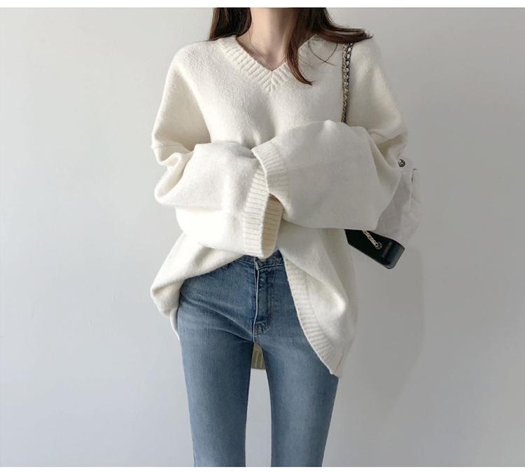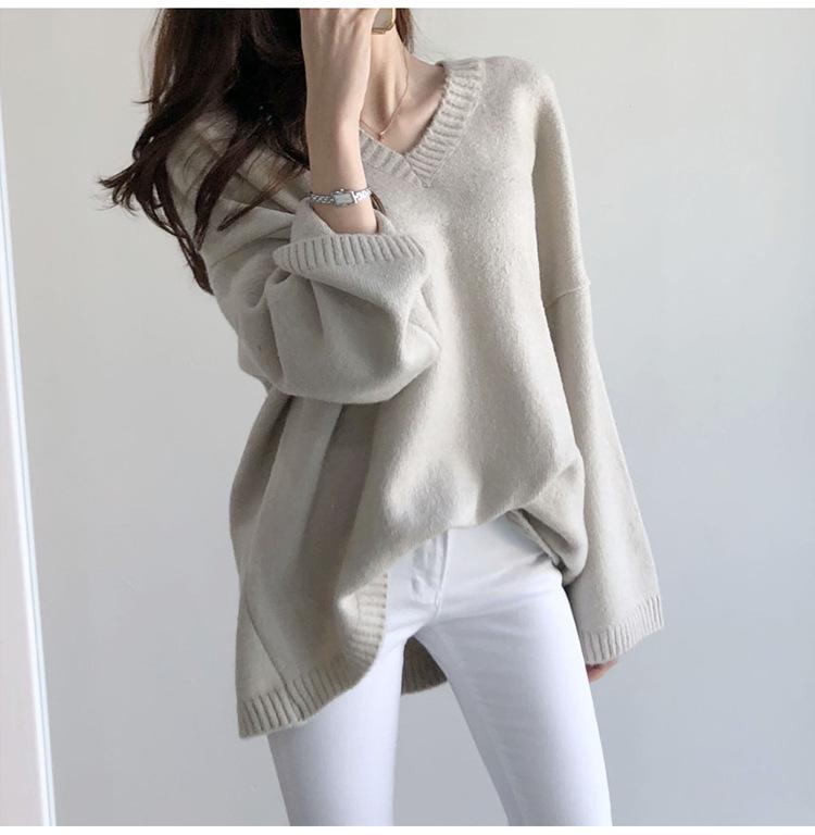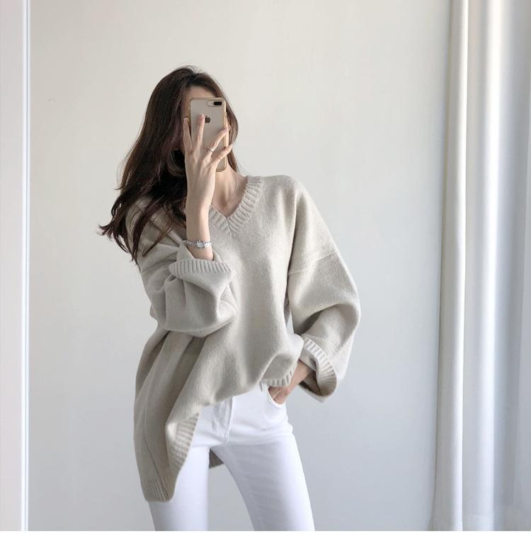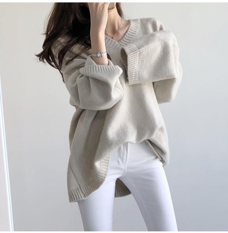 Suéter de Cuello en V Holgado de Color Puro Tejido para Mujer Otoño e Invierno 2025 Nuevo Estilo Estilo Perezoso Tejido Exterior de Largo Medio