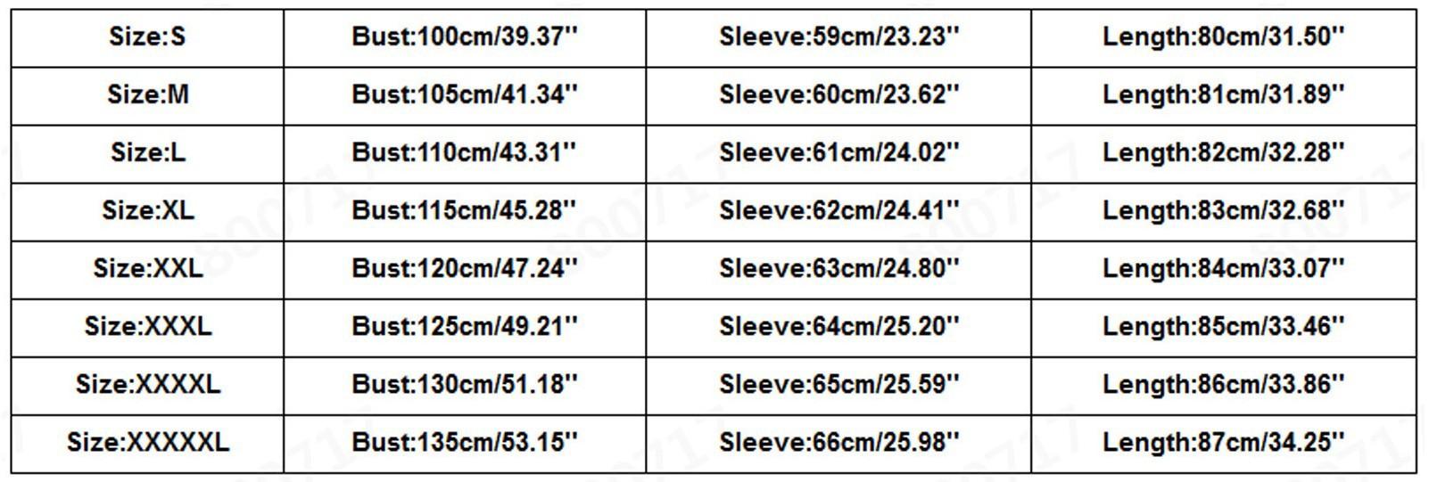 S, M, L, XL, XXL, 3XL, 4XL, 5XL