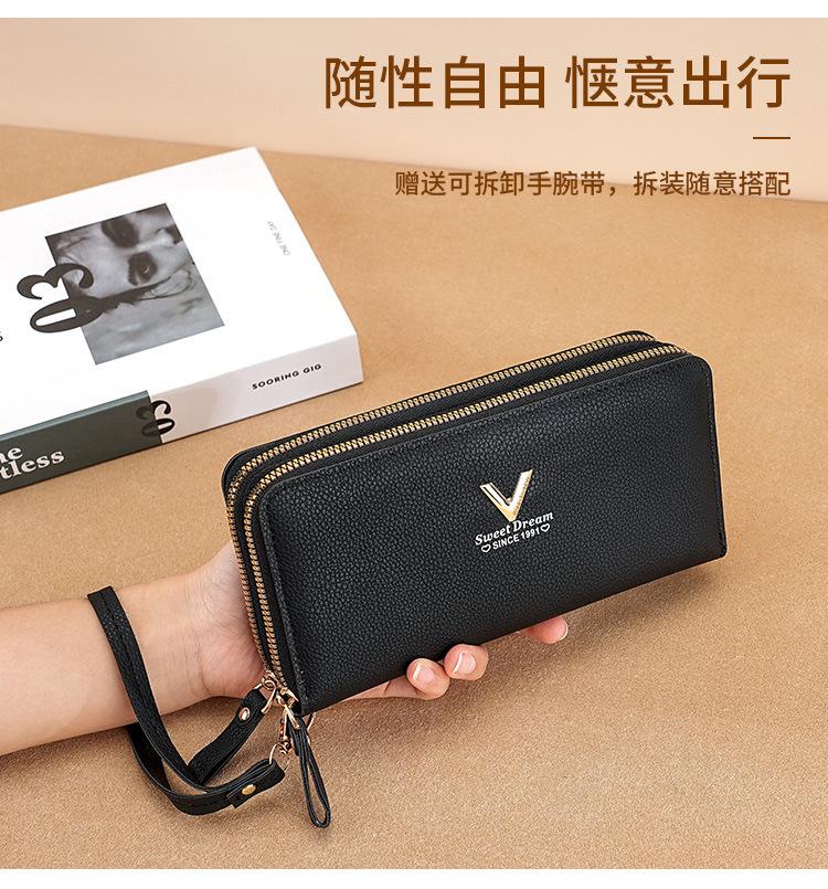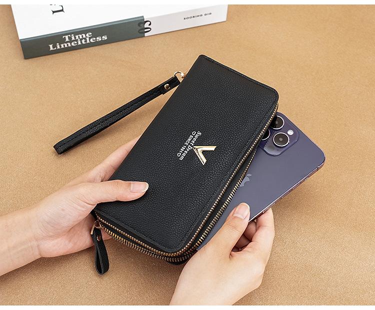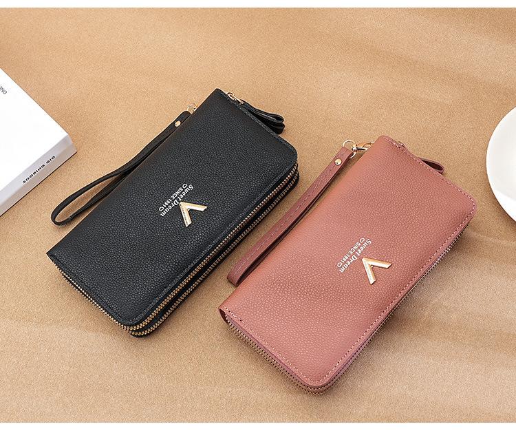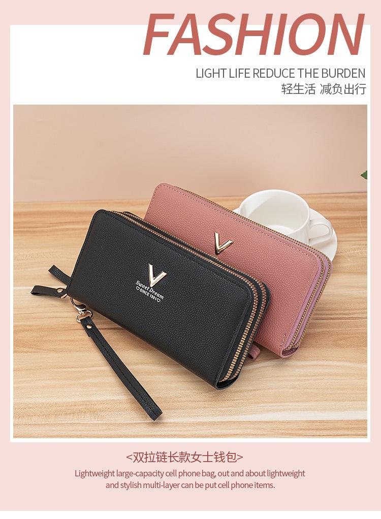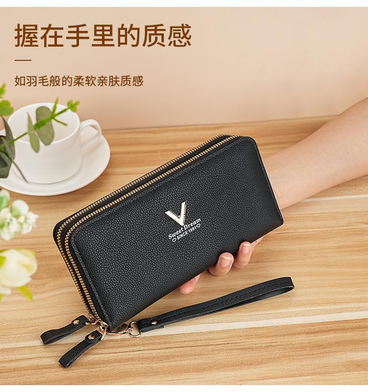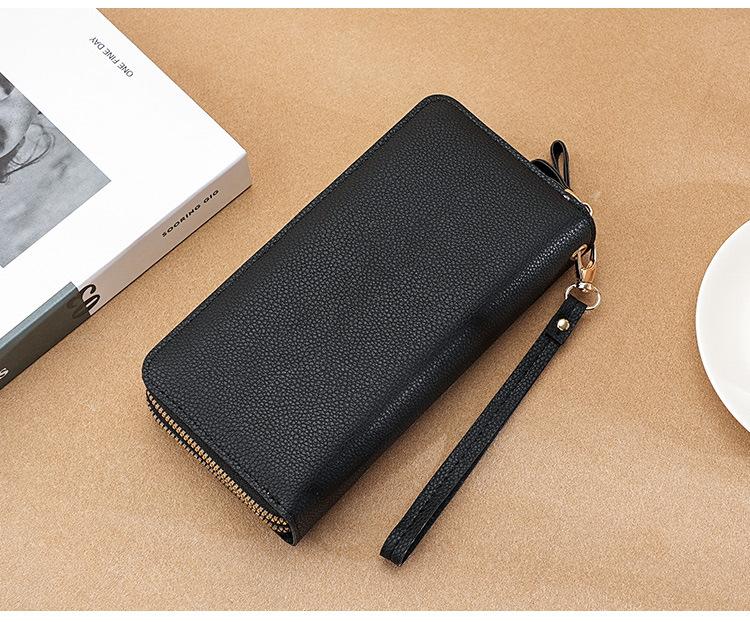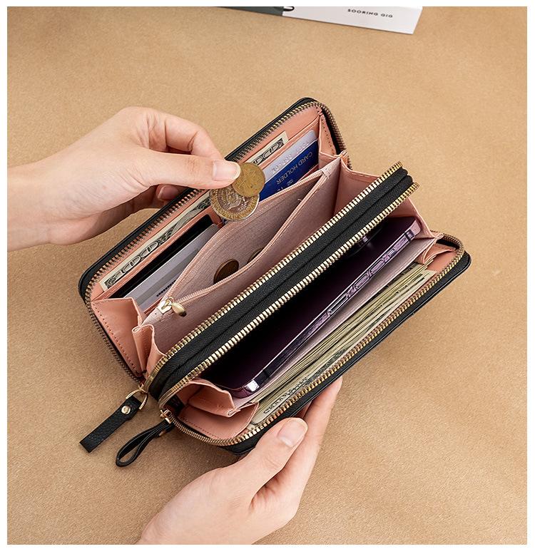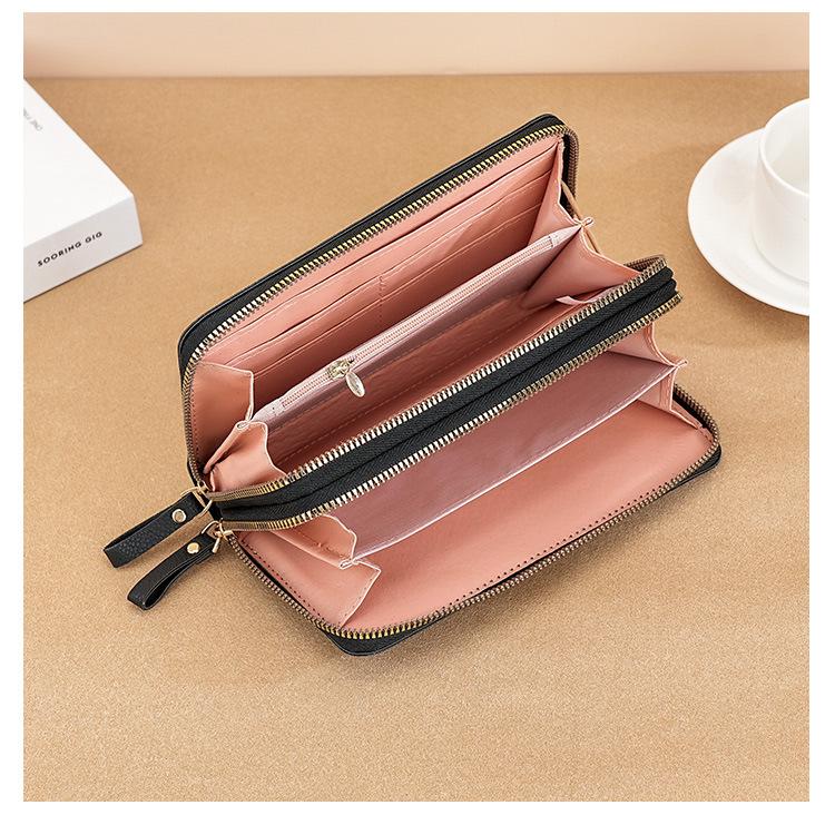 Nueva Cartera de Mujer Moda Cremallera Doble Capa Bolso Clutch Largo Patrón Lichi Bolsa para Teléfono Móvil Gruesa Multitarjeta Gran Capacidad