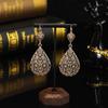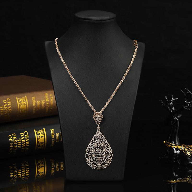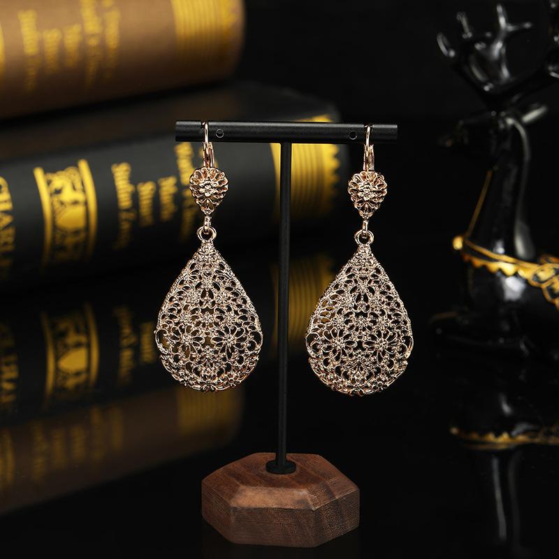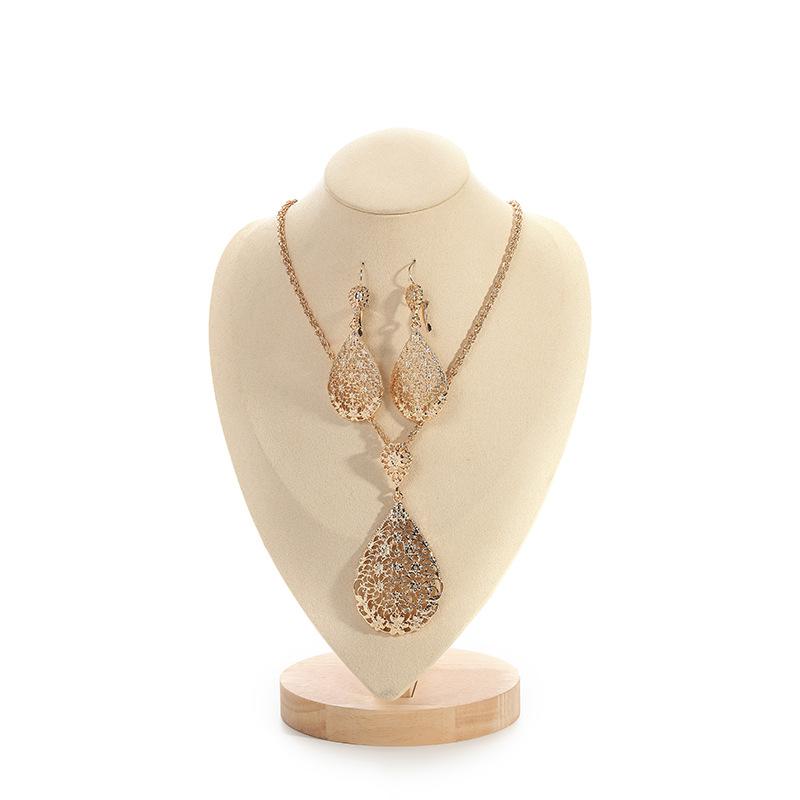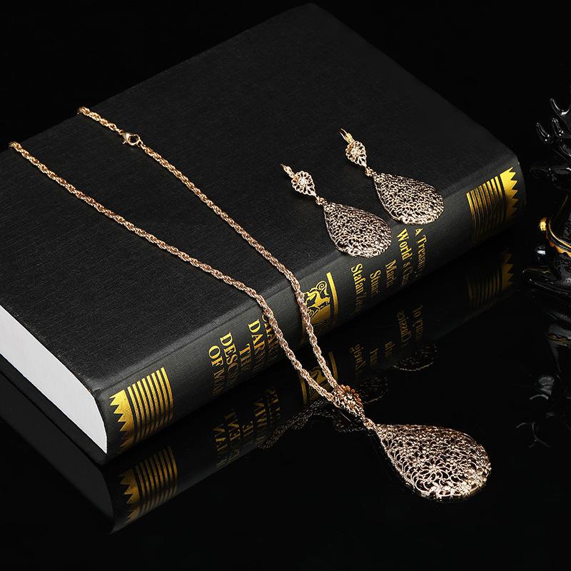 Conjunto de dos piezas de collar y pendientes de aleación de oro con diseño de flor hueca y gota de agua.