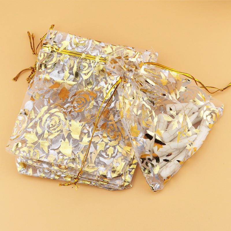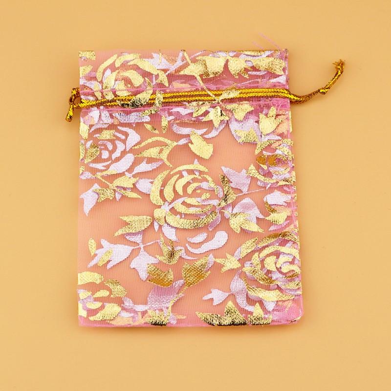 Bolsa de organza dorada con hilo rosa, con cordón, para embalaje de joyas, para dulces de boda, venta al por mayor, suministro directo de fábrica