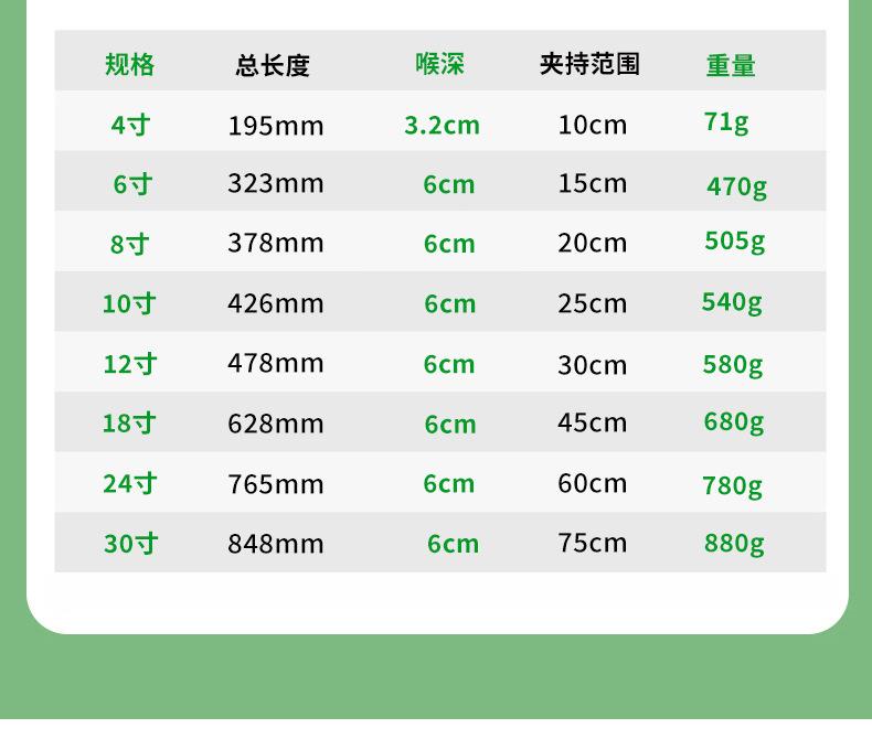 4inch (clamping length 100mm), 6inch (clamping length 150mm), 8inch (clamping length 200mm), 10inch (clamping ...