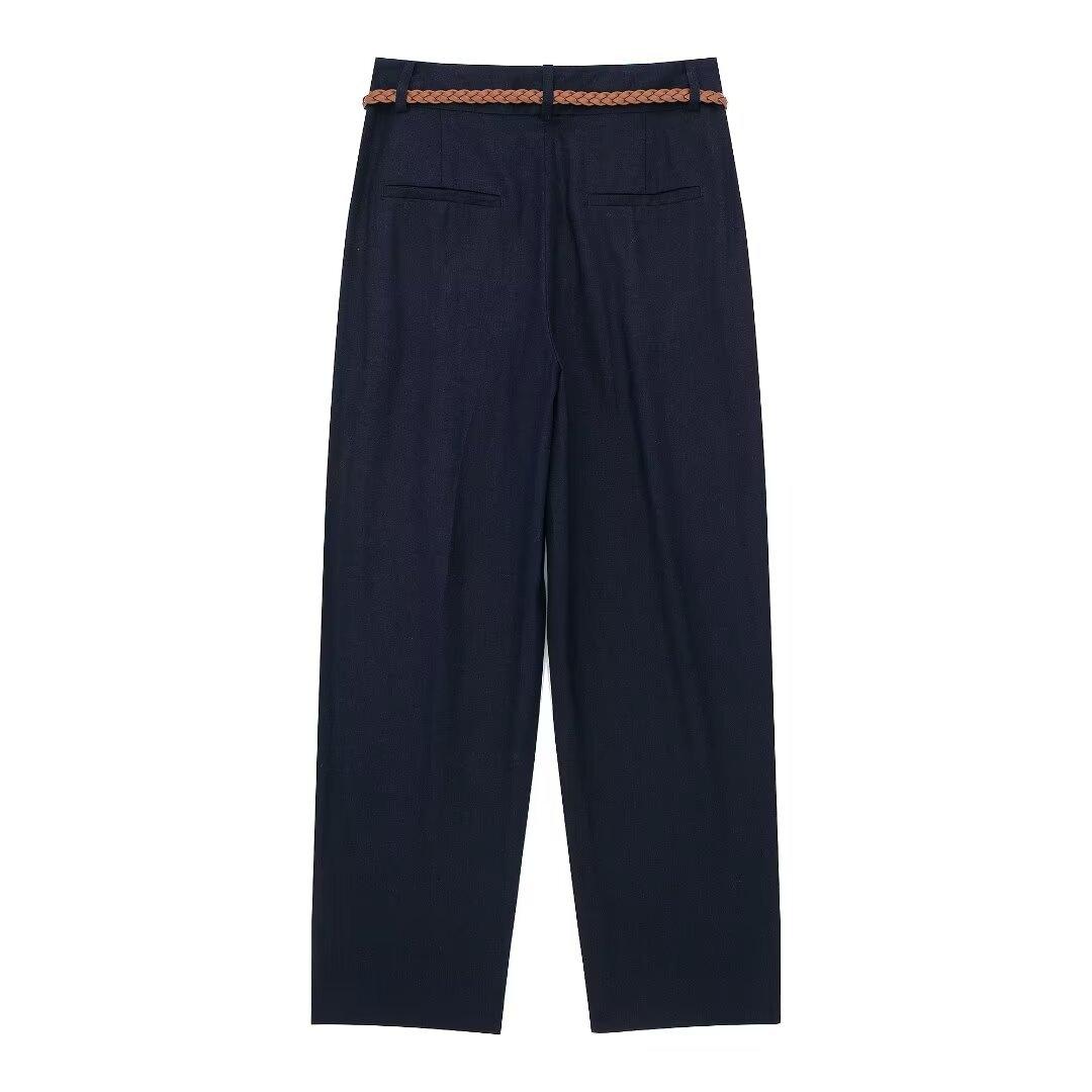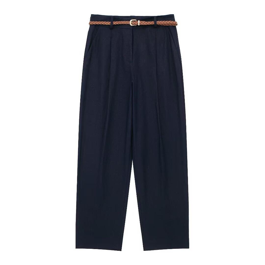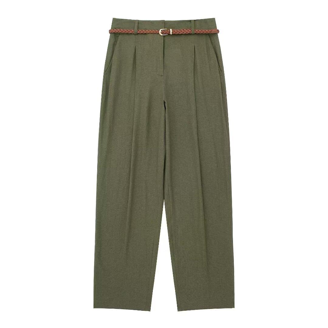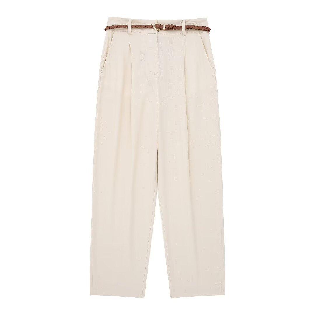 Pantalones rectos de cintura alta con cinturón de lino mezclado, estilo europeo y americano, estilo retro, informal, combinable, para mujer, verano 2024