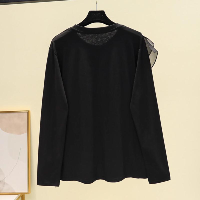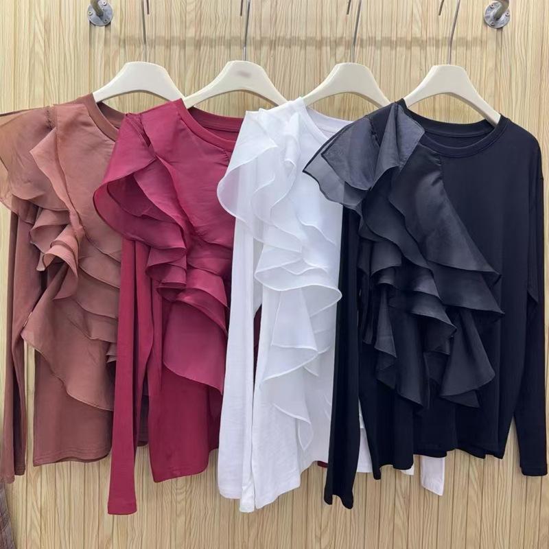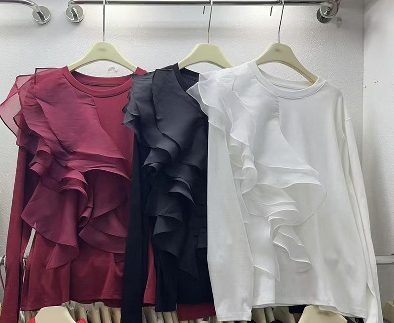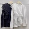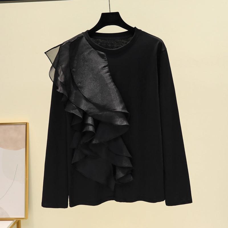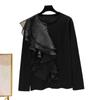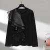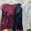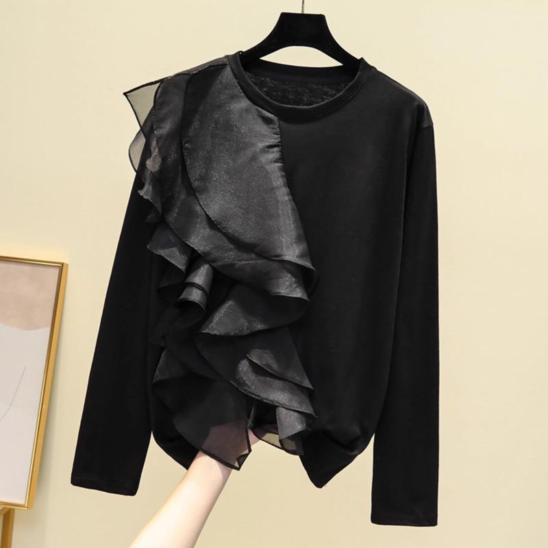 Camiseta chic con volantes estilo coreano de manga larga negra para mujer otoño e invierno diseño retro de nicho de alta gama estilo Hong Kong