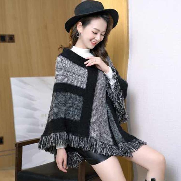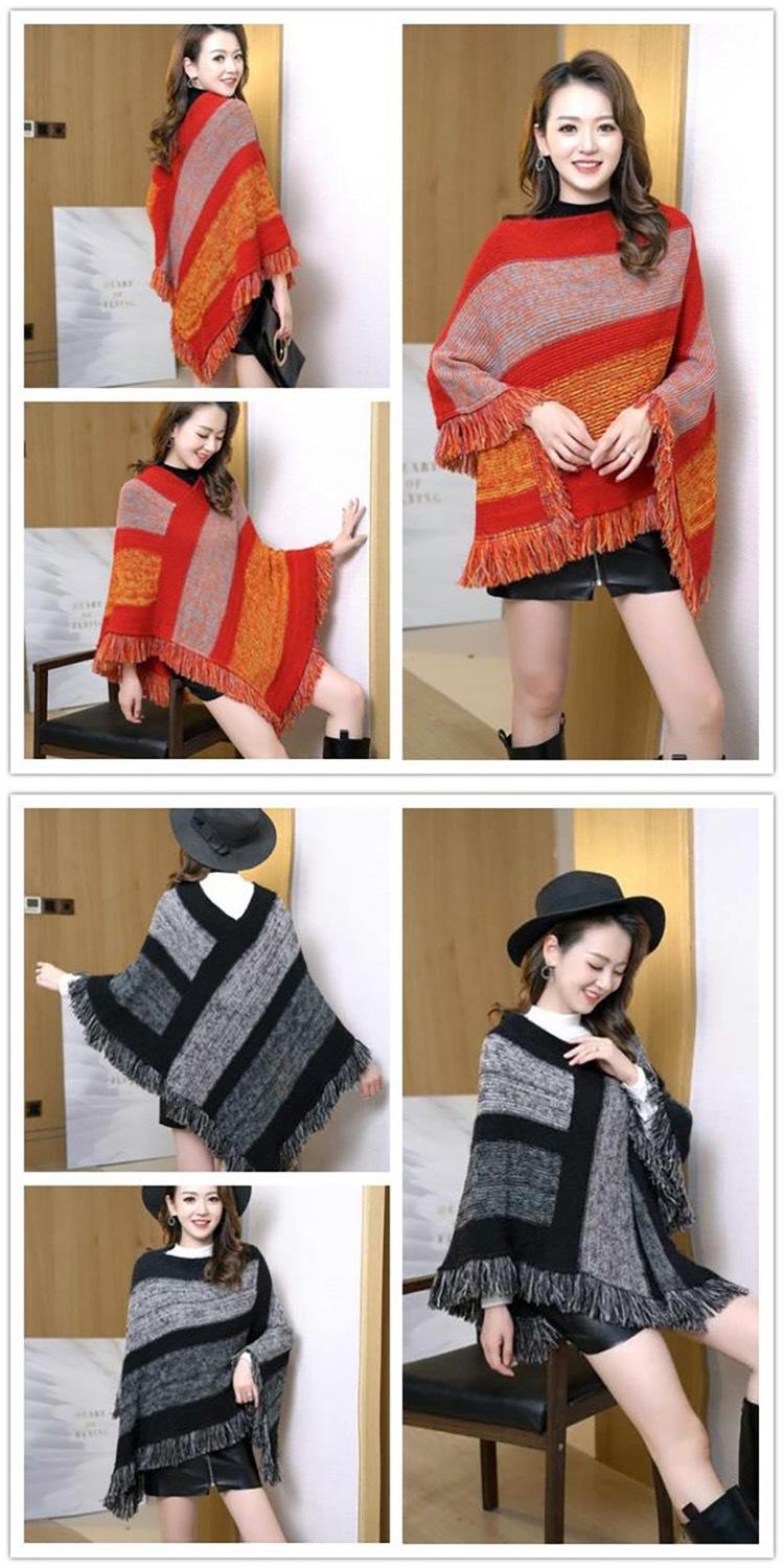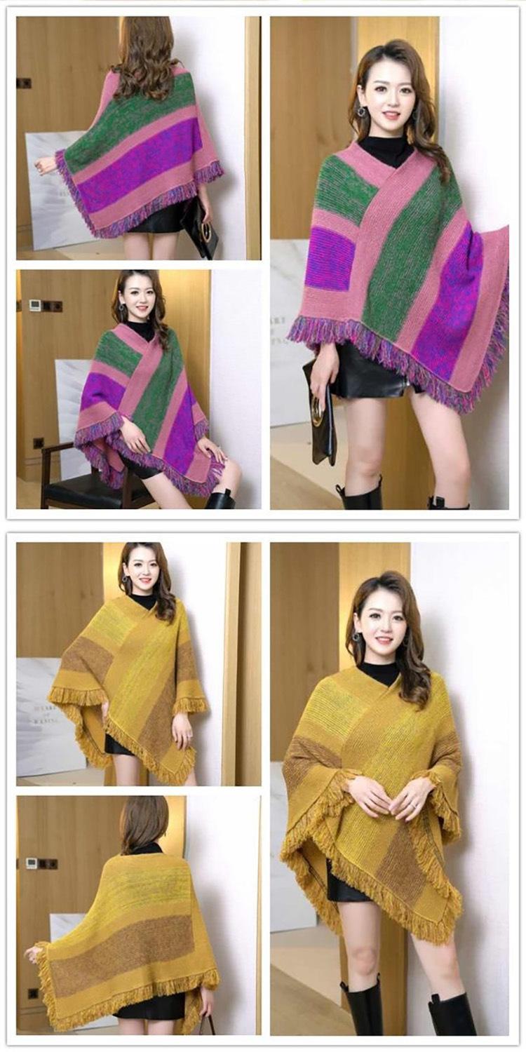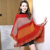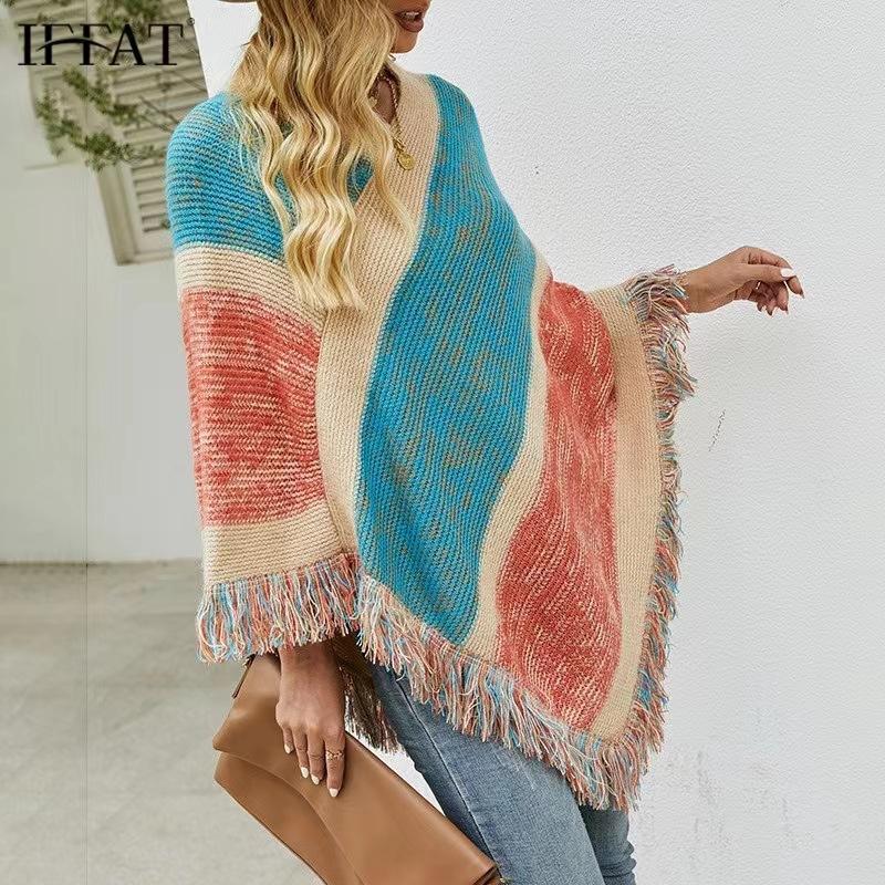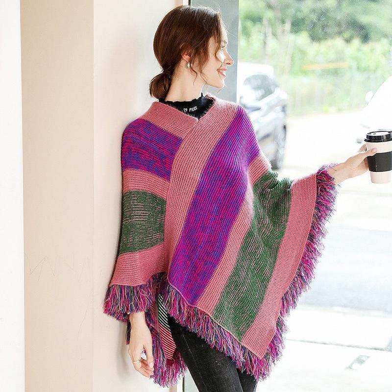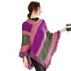 Poncho de estilo étnico para otoño e invierno, suéter de punto a rayas, suéter con borlas, abrigo largo para mujer