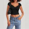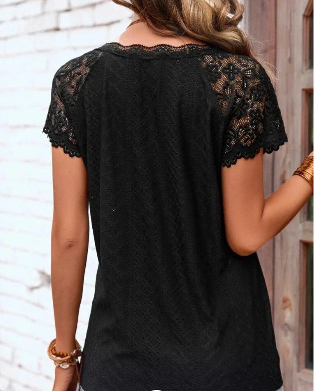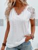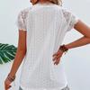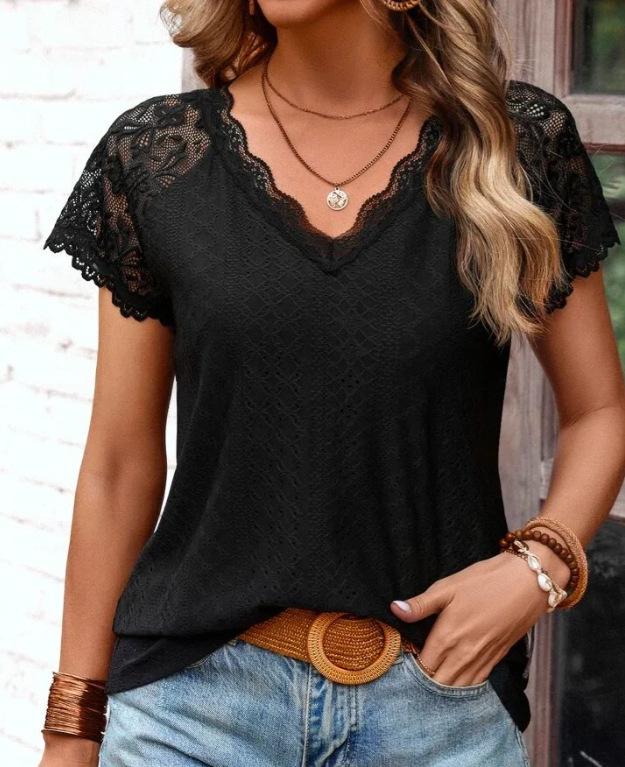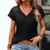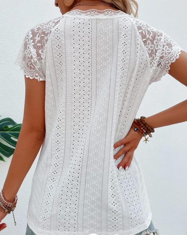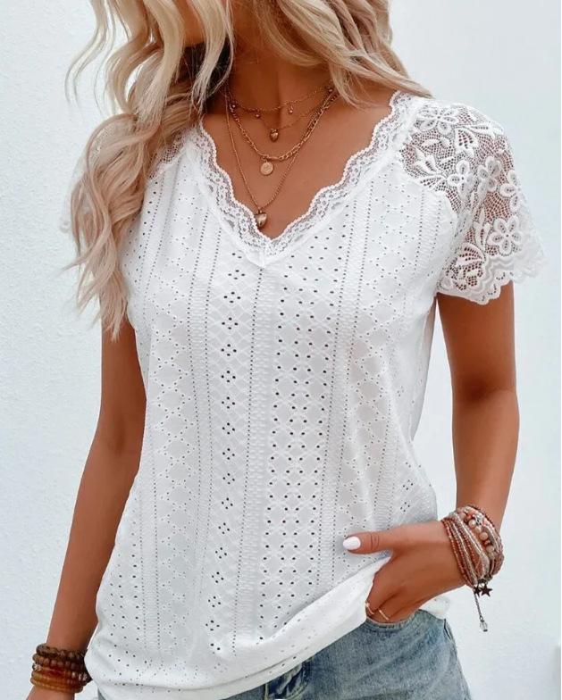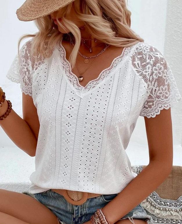 Nueva moda europea y americana 2023, color sólido, encaje hueco, escote en V, informal, hombro, manga corta