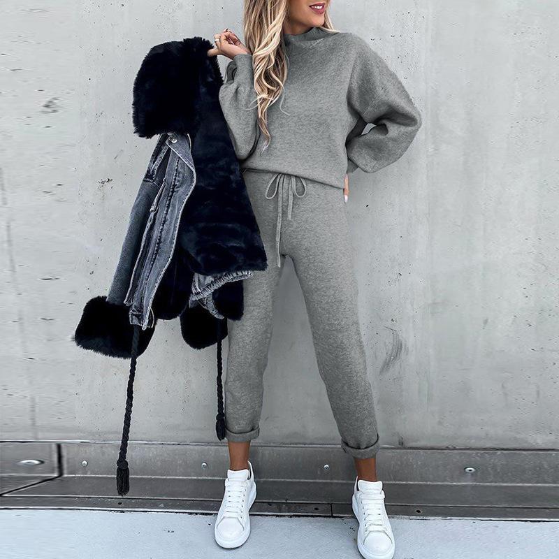 Conjunto de dos piezas para mujer, otoño/invierno 2023, Amazon, cuello alto, informal, color sólido, pantalones y bolsillos