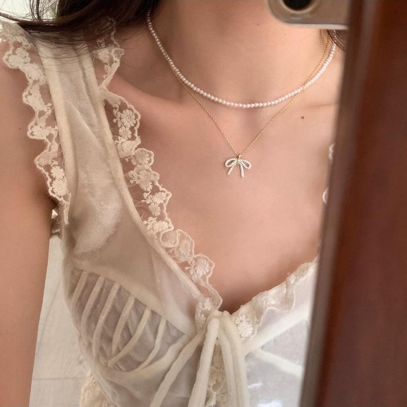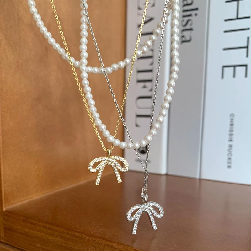 Collar de perlas con lazo de diamantes de imitación dorados y plateados apilados para lucir un diseño de nicho de lujo ligero y elegante con cadena de clavícula para mujer