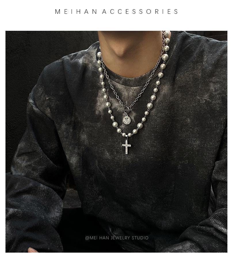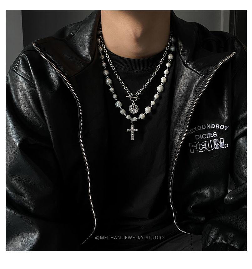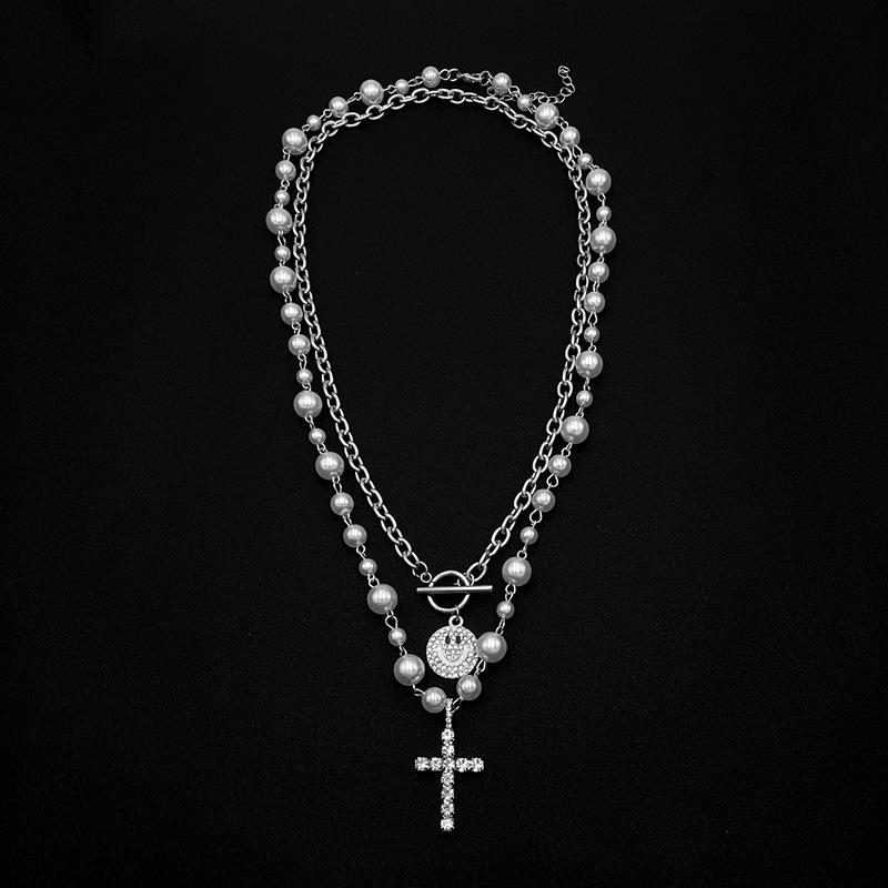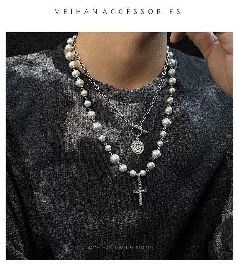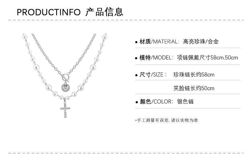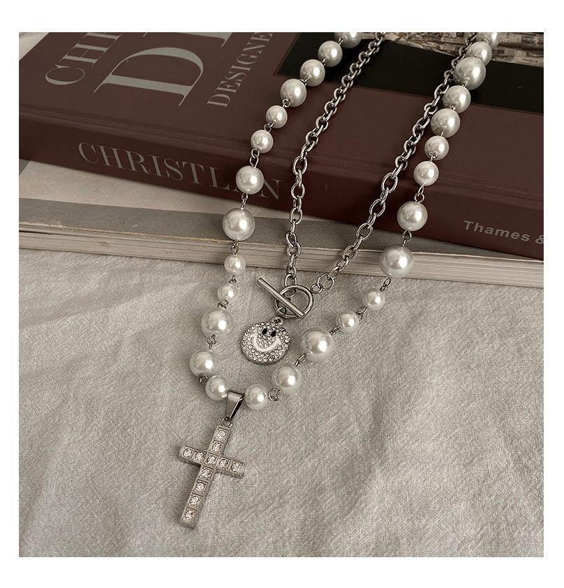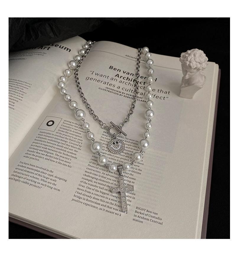 Collar de perlas estilo japonés y coreano con personalidad moderna y fresca, con colgante de cruz sonriente con incrustaciones de diamantes, joyería para parejas para hombres y mujeres.