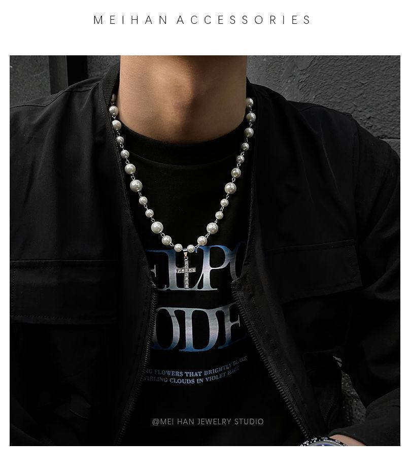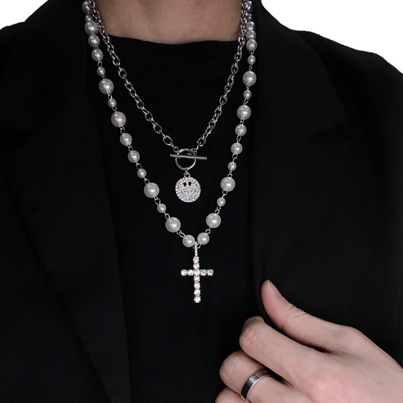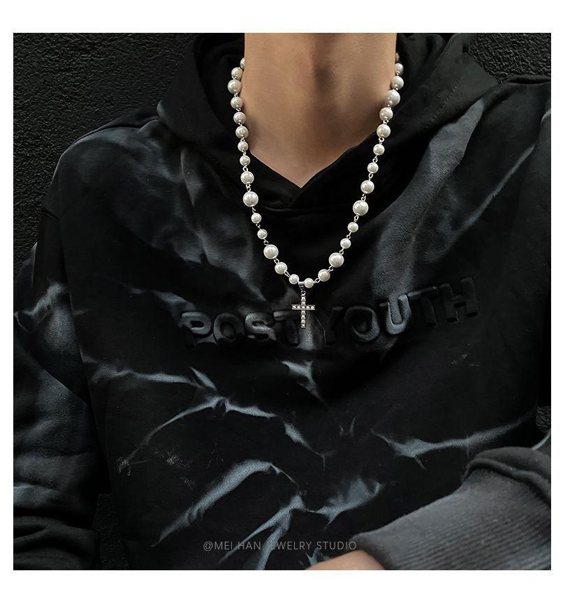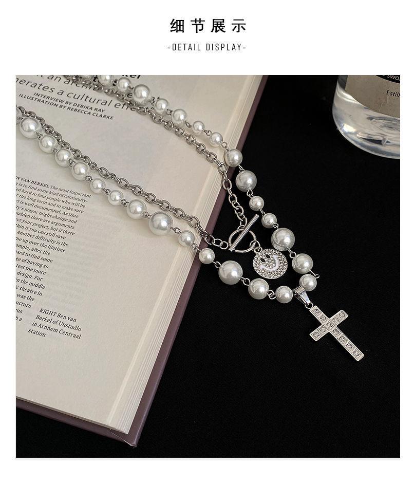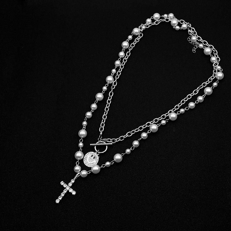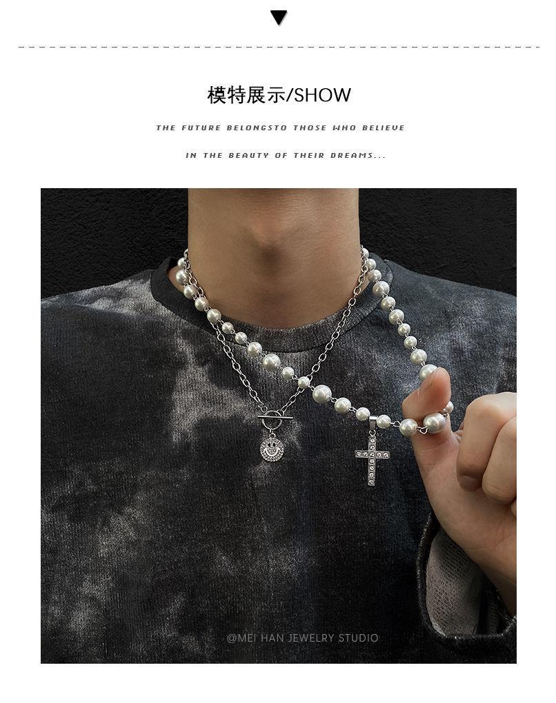 Collar de perlas estilo japonés y coreano con personalidad moderna y fresca, con colgante de cruz sonriente con incrustaciones de diamantes, joyería para parejas para hombres y mujeres.